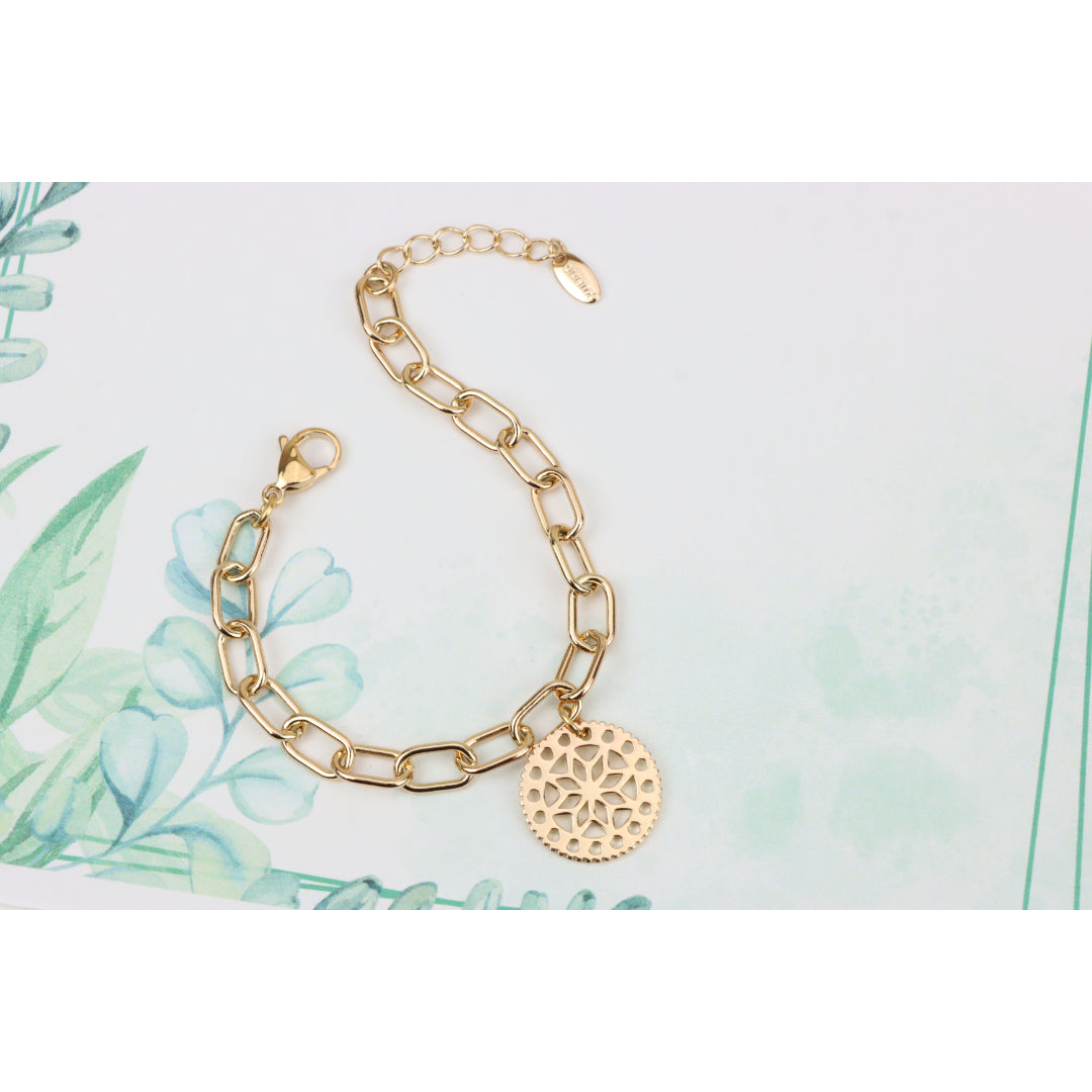 Rose Gold Plated Bracelet with Cutout Floral Disc Charm, XPBL0880