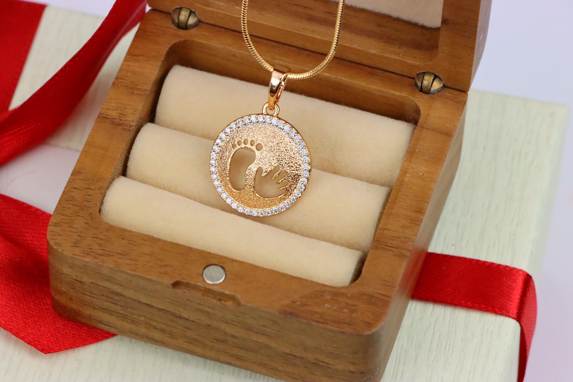 Celebrate precious moments with this charming round pendant featuring a baby footprint and handprint design.