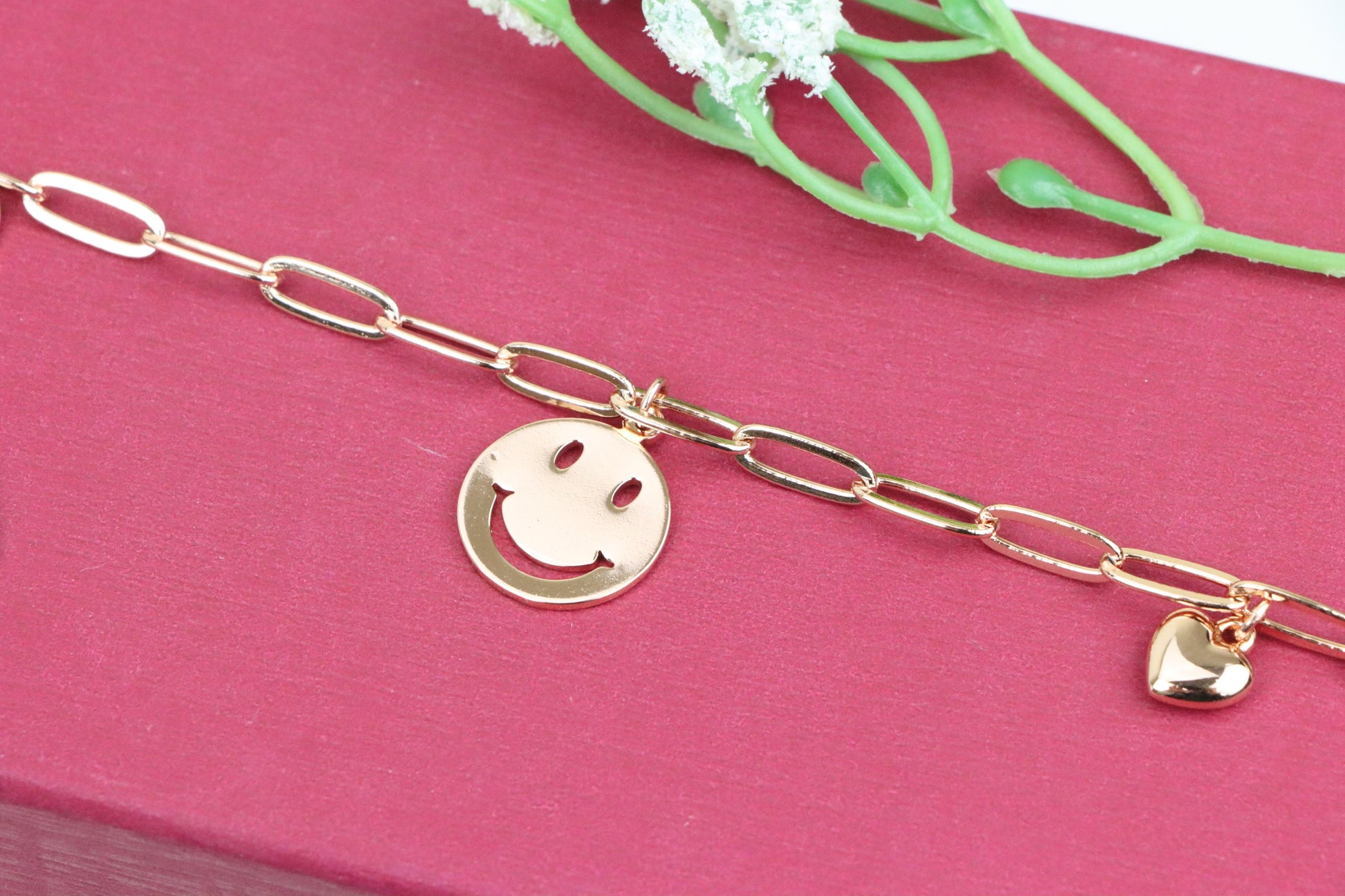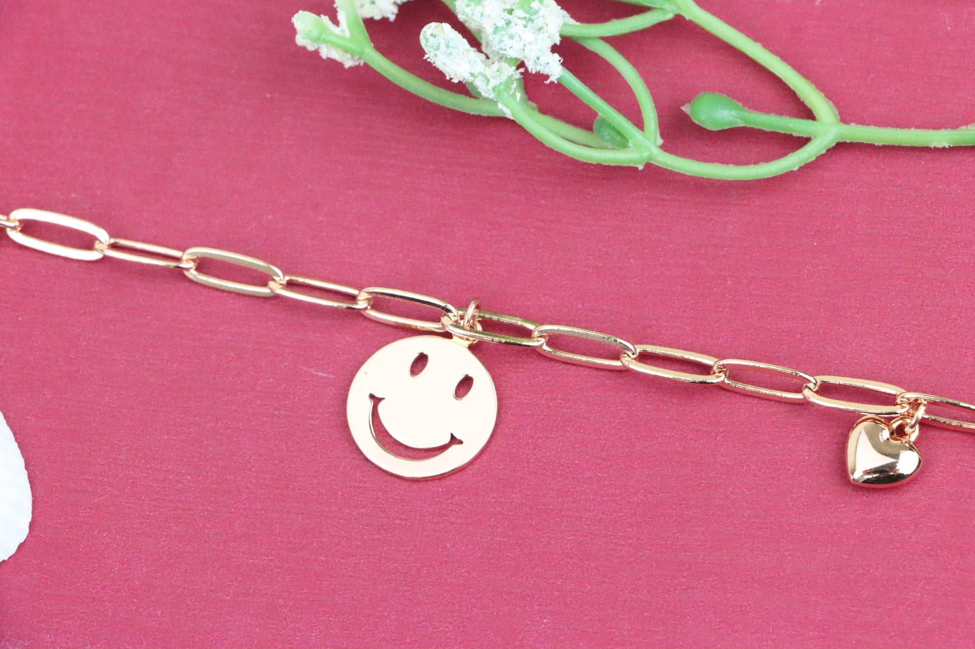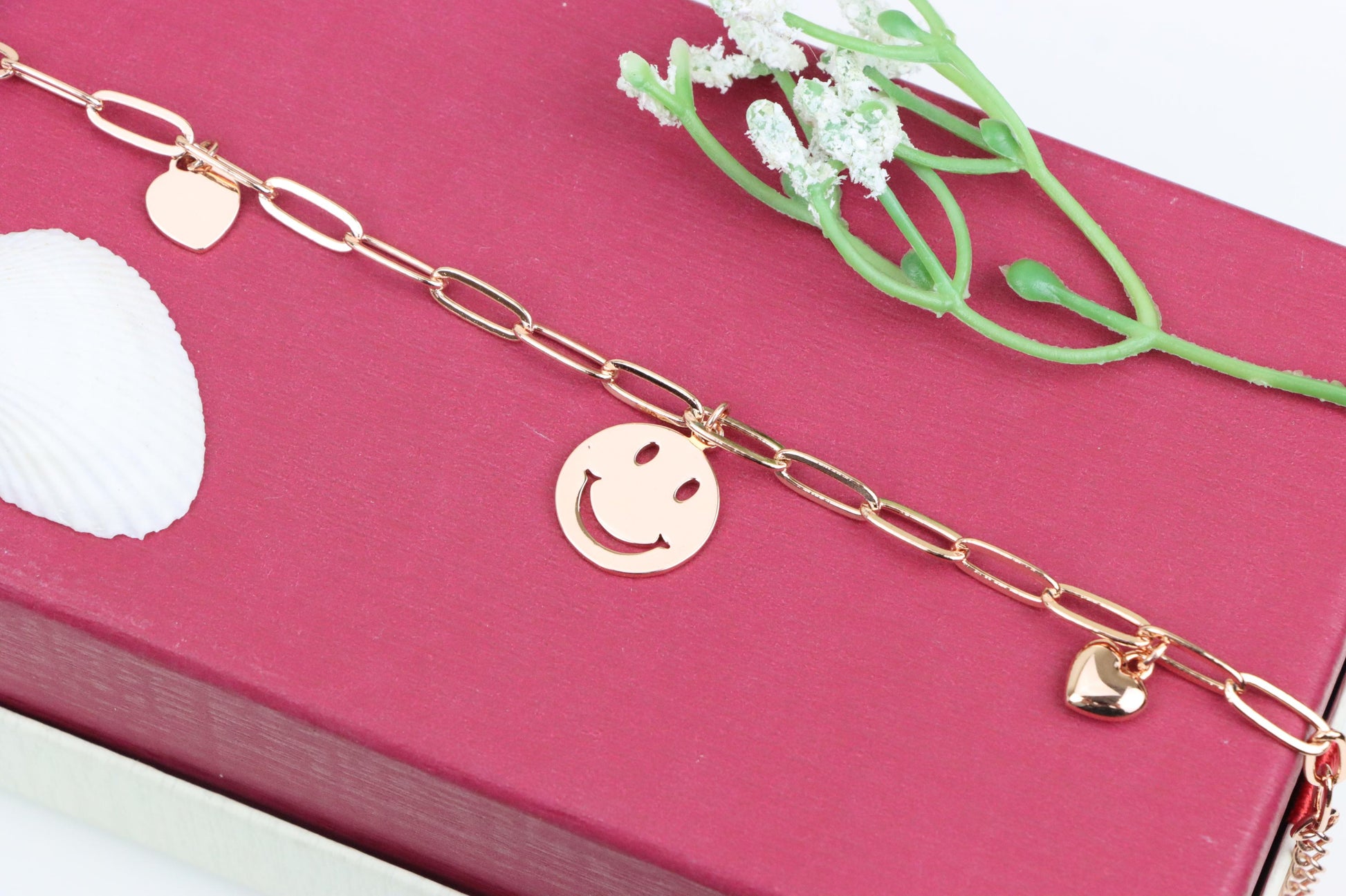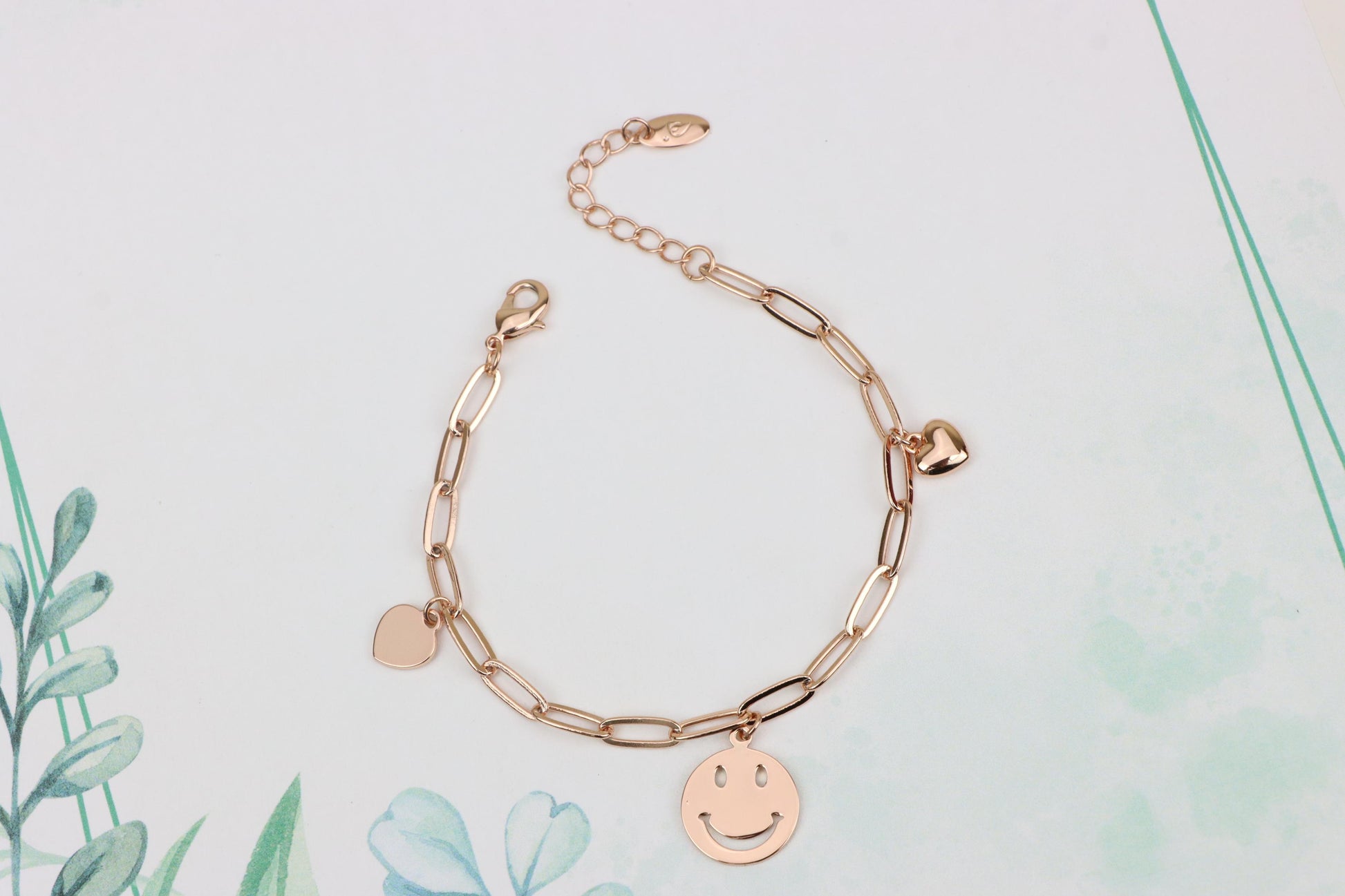 Add a playful touch to your style with this rose gold charm bracelet, featuring a smiley face pendant and heart charms.