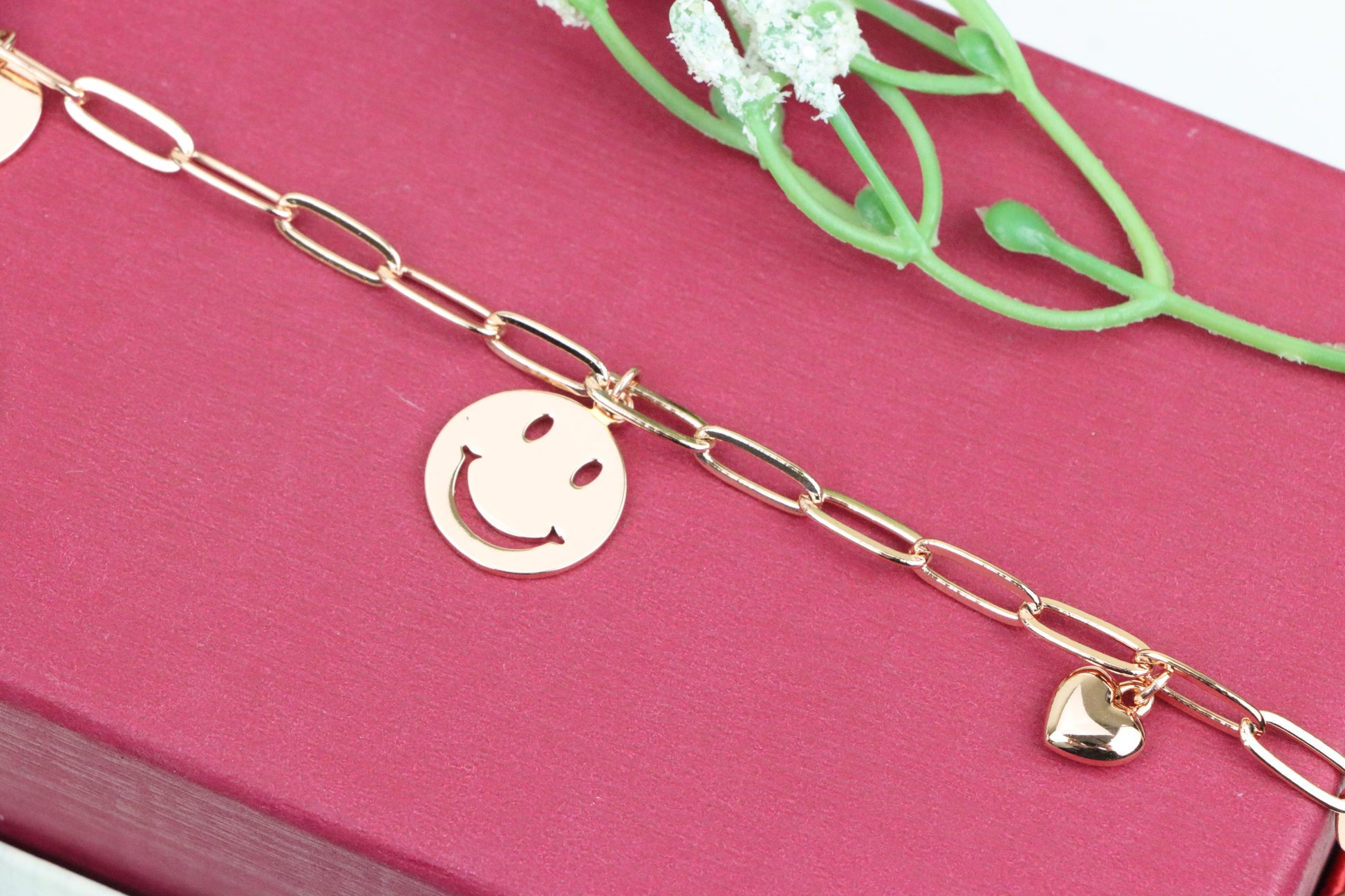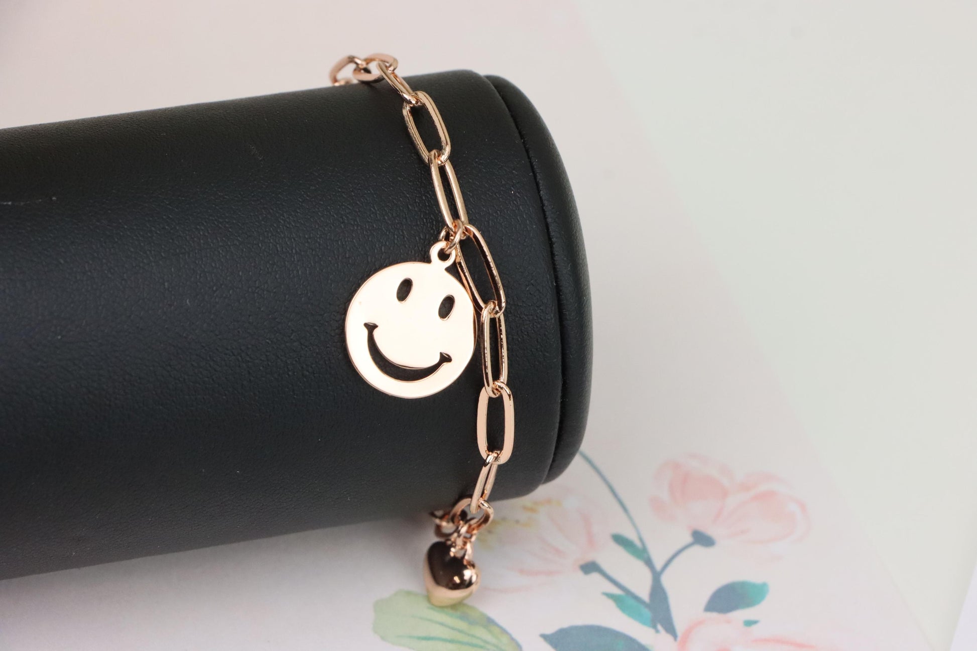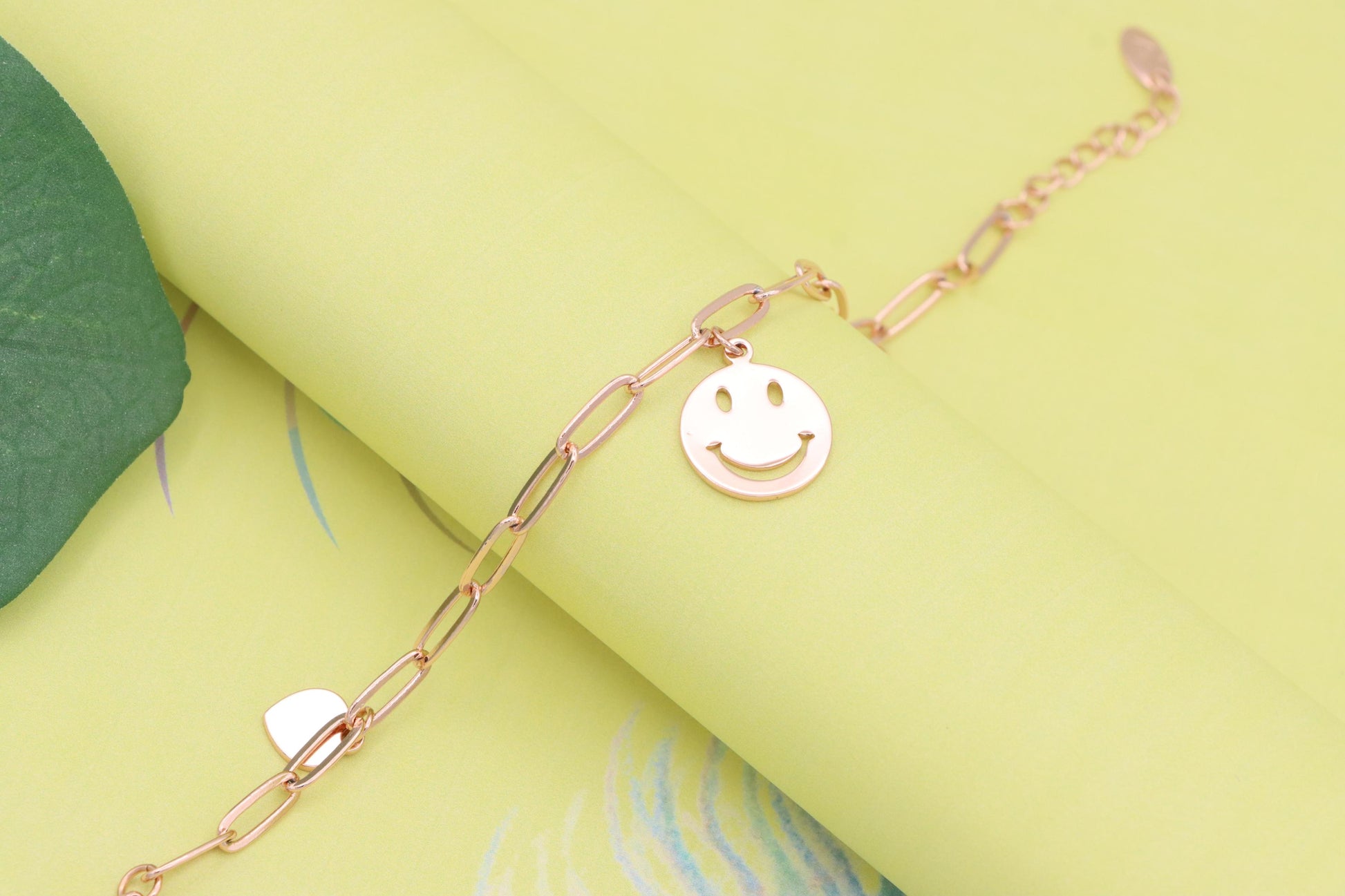 Add a playful touch to your style with this rose gold charm bracelet, featuring a smiley face pendant and heart charms.