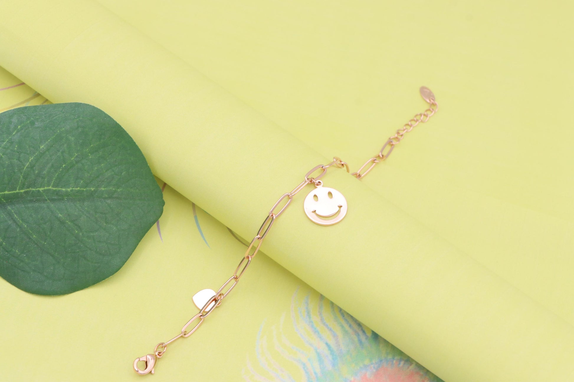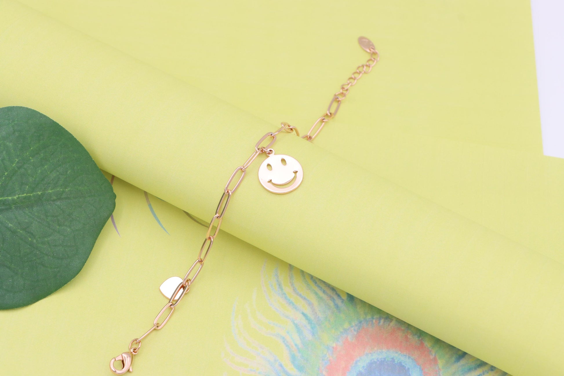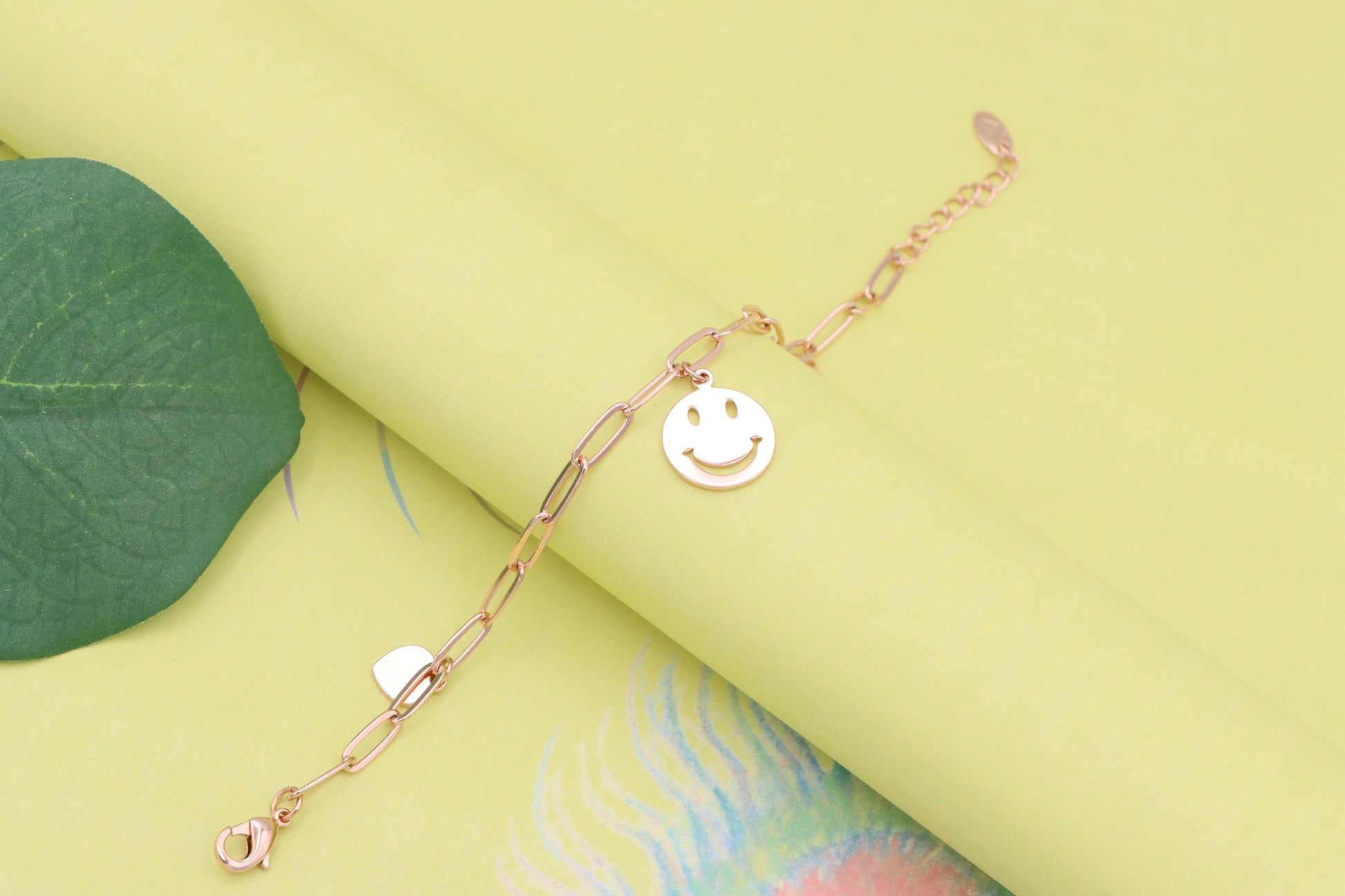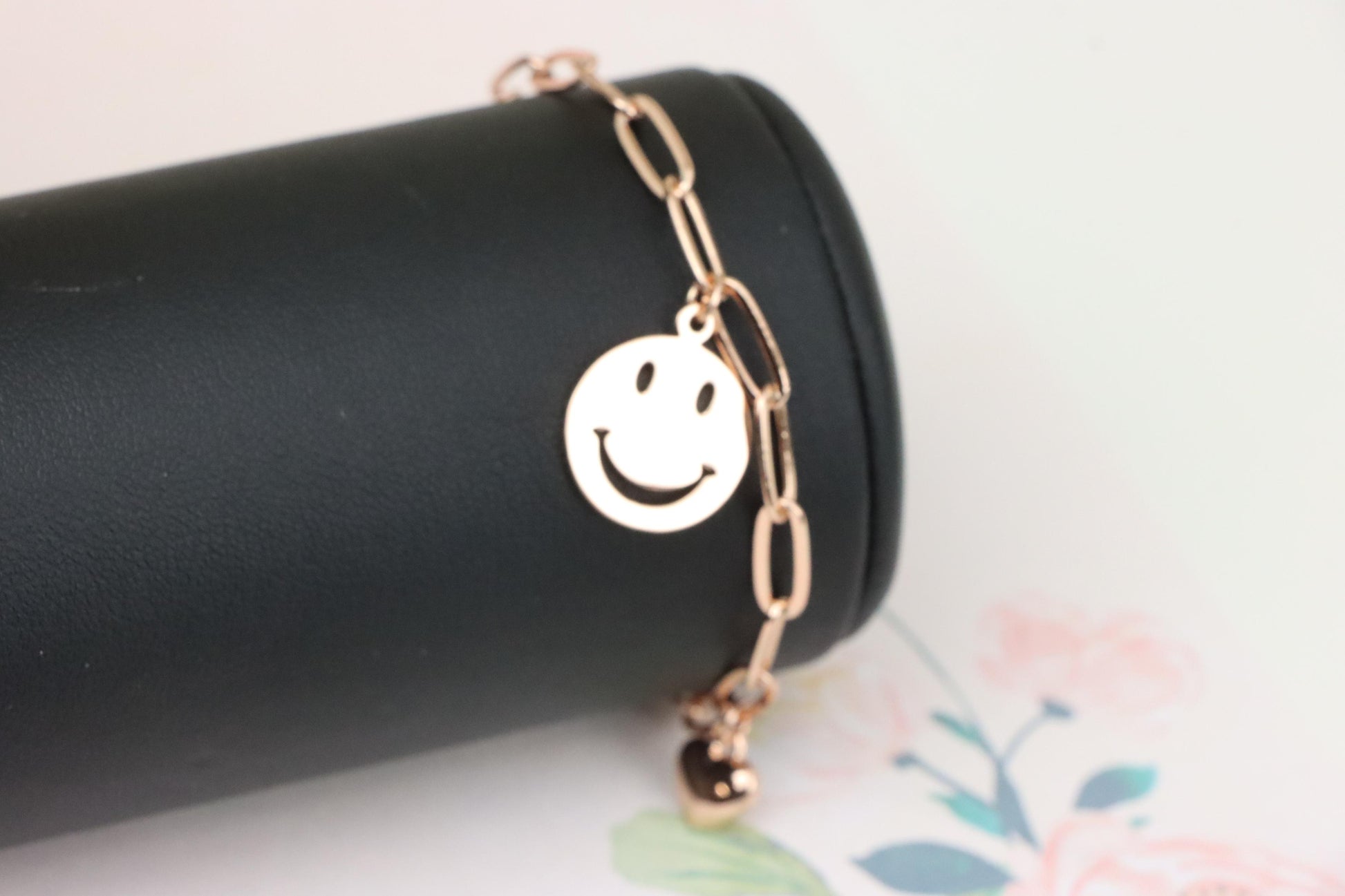 Add a playful touch to your style with this rose gold charm bracelet, featuring a smiley face pendant and heart charms.