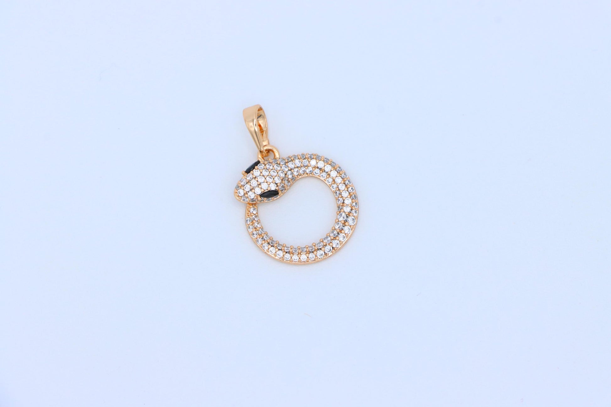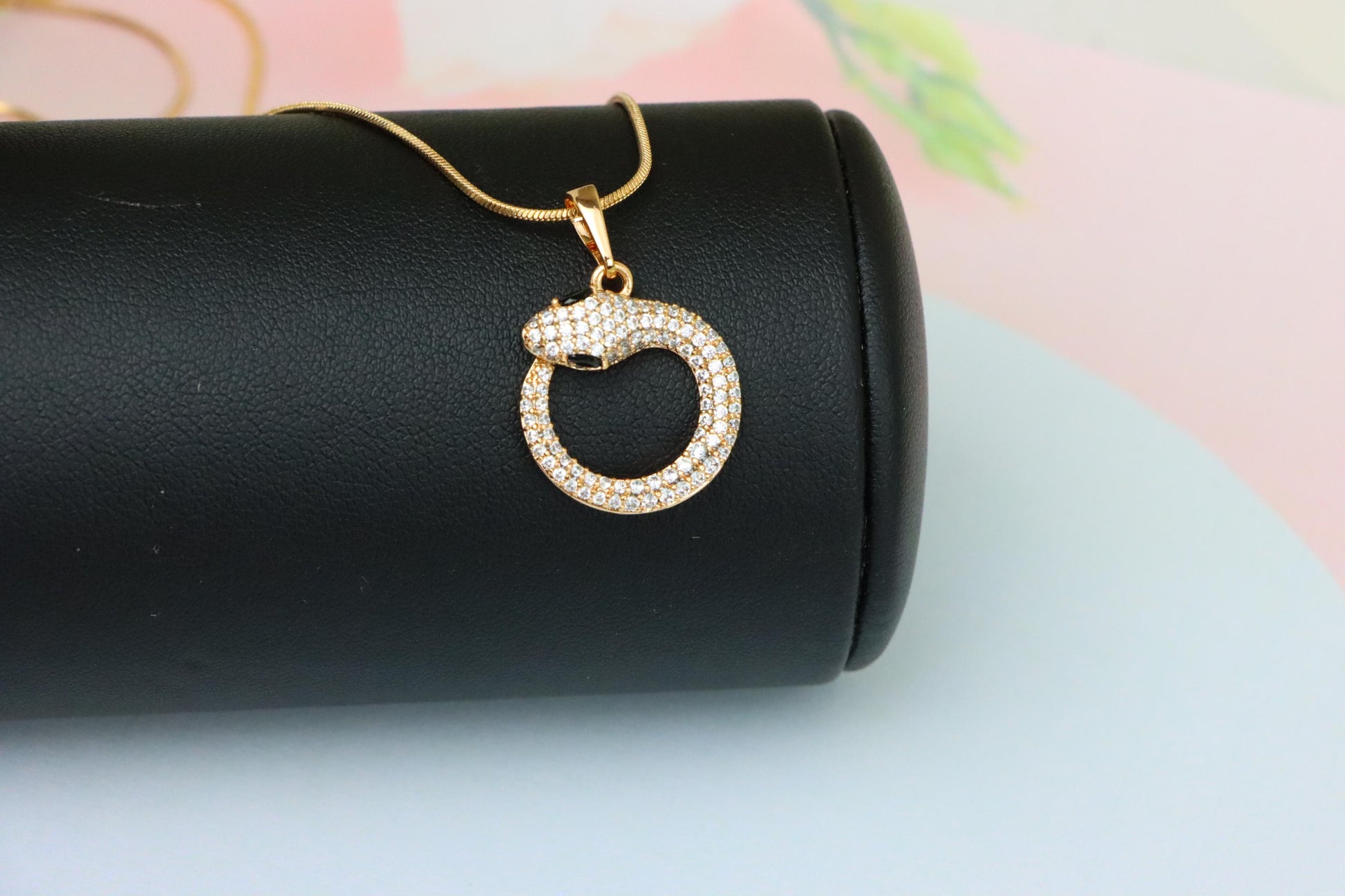 Elevate your accessory game with this unique rose gold snake pendant, designed in a circular coil shape and encrusted with sparkling stones.