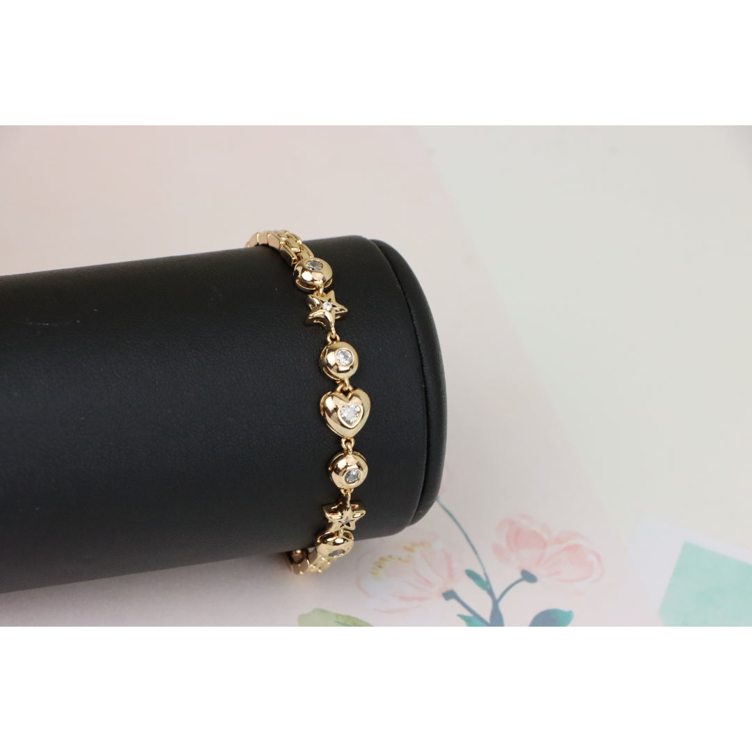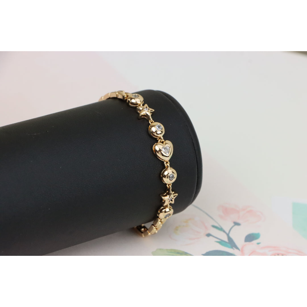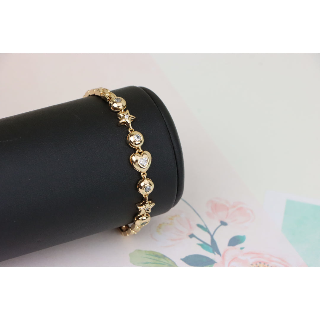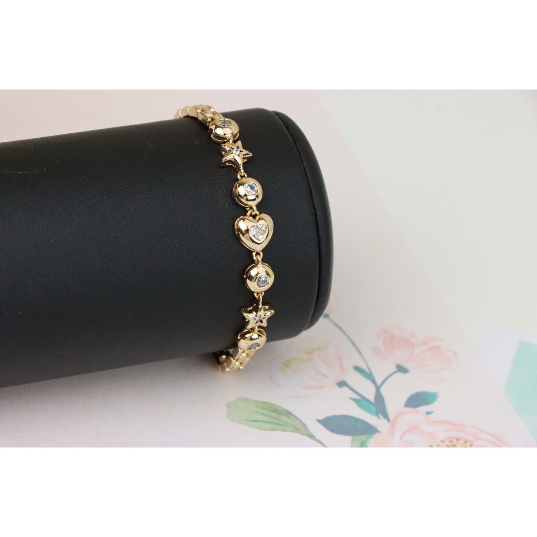 A charming rose gold bracelet featuring a playful mix of star, heart, and circular elements, each adorned with dazzling crystals. Perfect for daily wear or gifting.