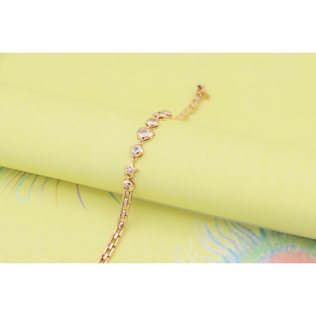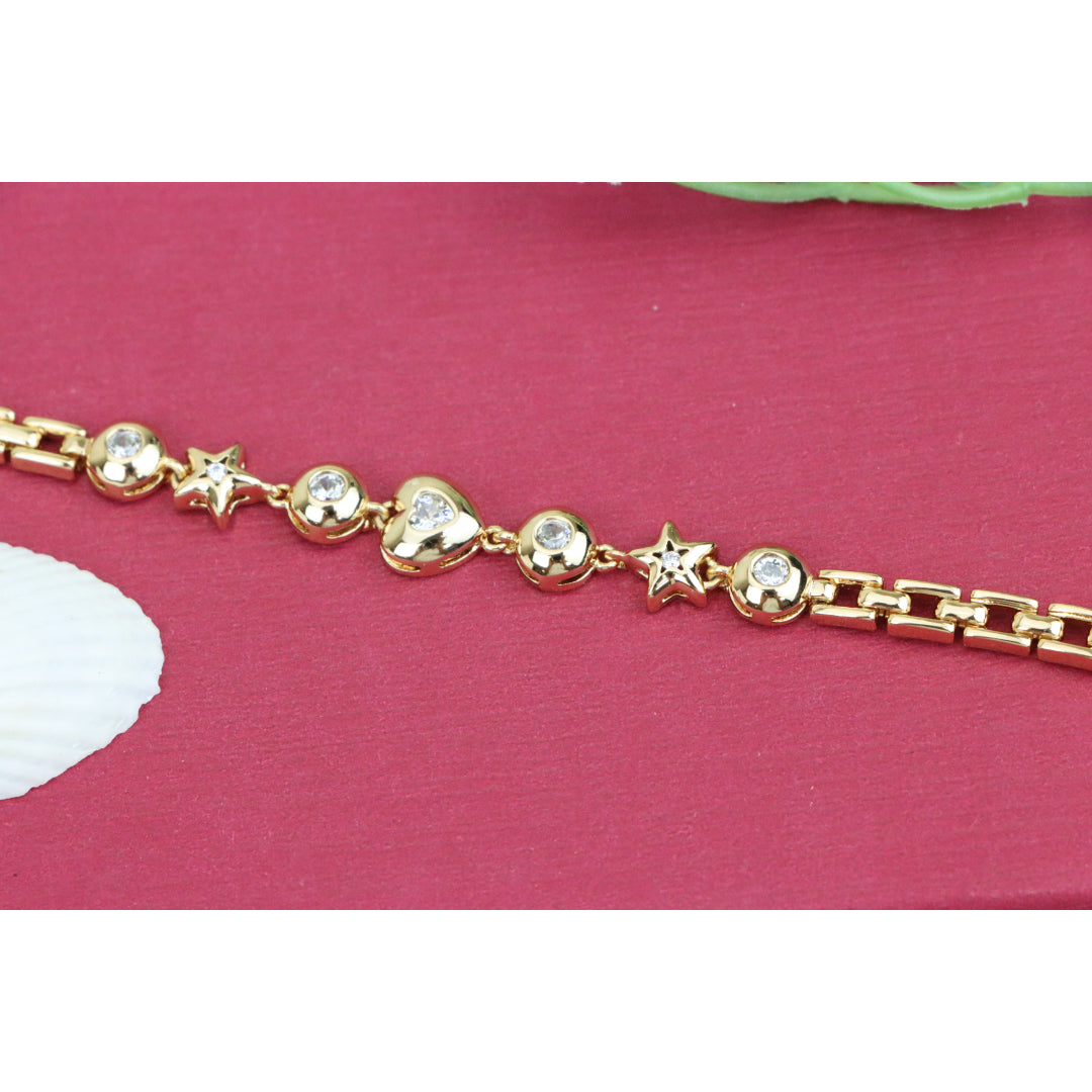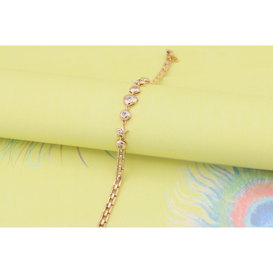 A charming rose gold bracelet featuring a playful mix of star, heart, and circular elements, each adorned with dazzling crystals. Perfect for daily wear or gifting.