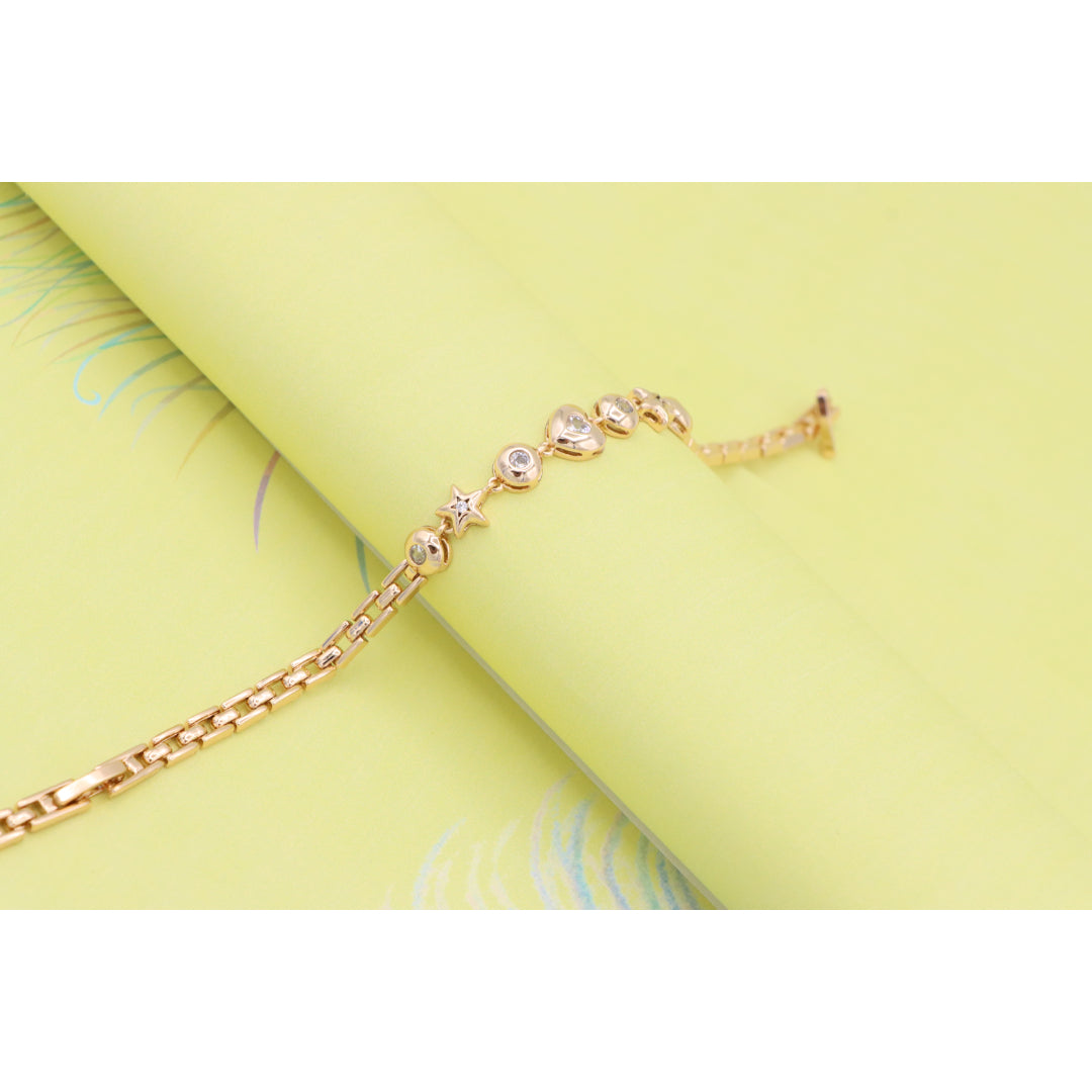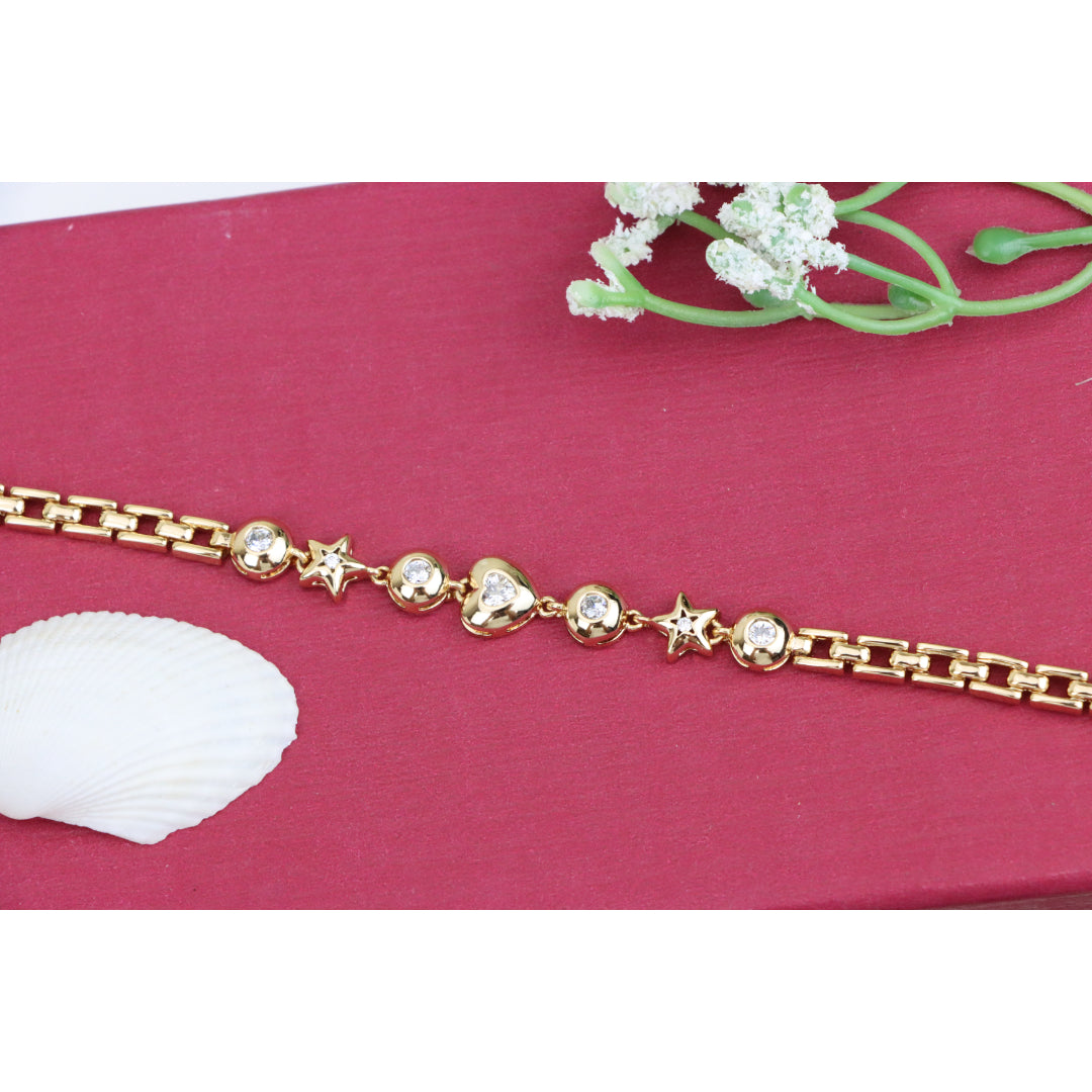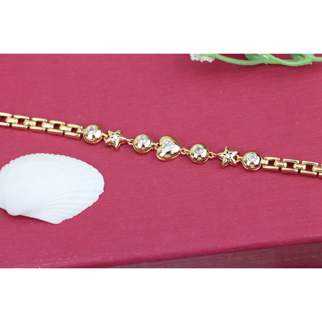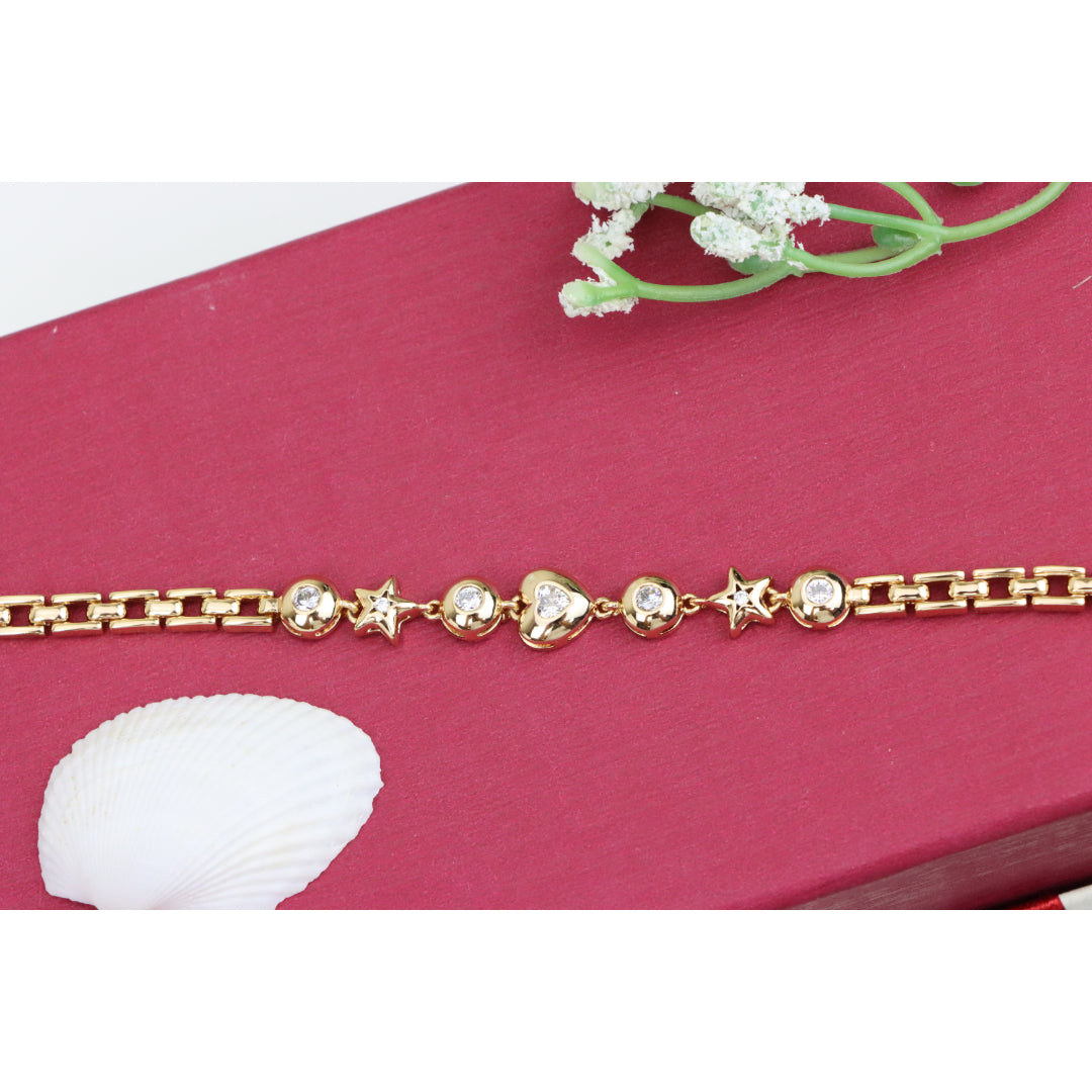 A charming rose gold bracelet featuring a playful mix of star, heart, and circular elements, each adorned with dazzling crystals. Perfect for daily wear or gifting.