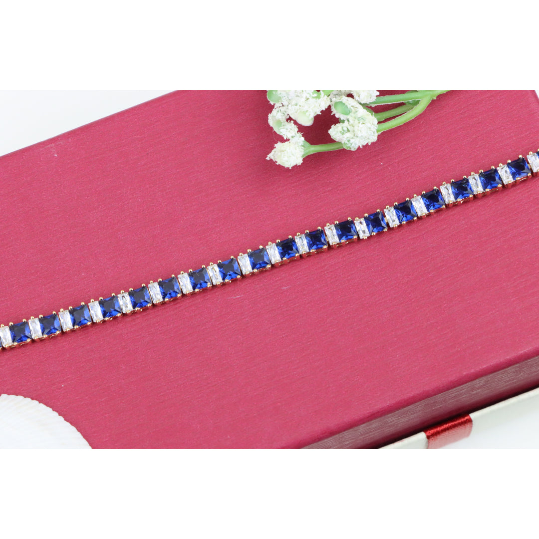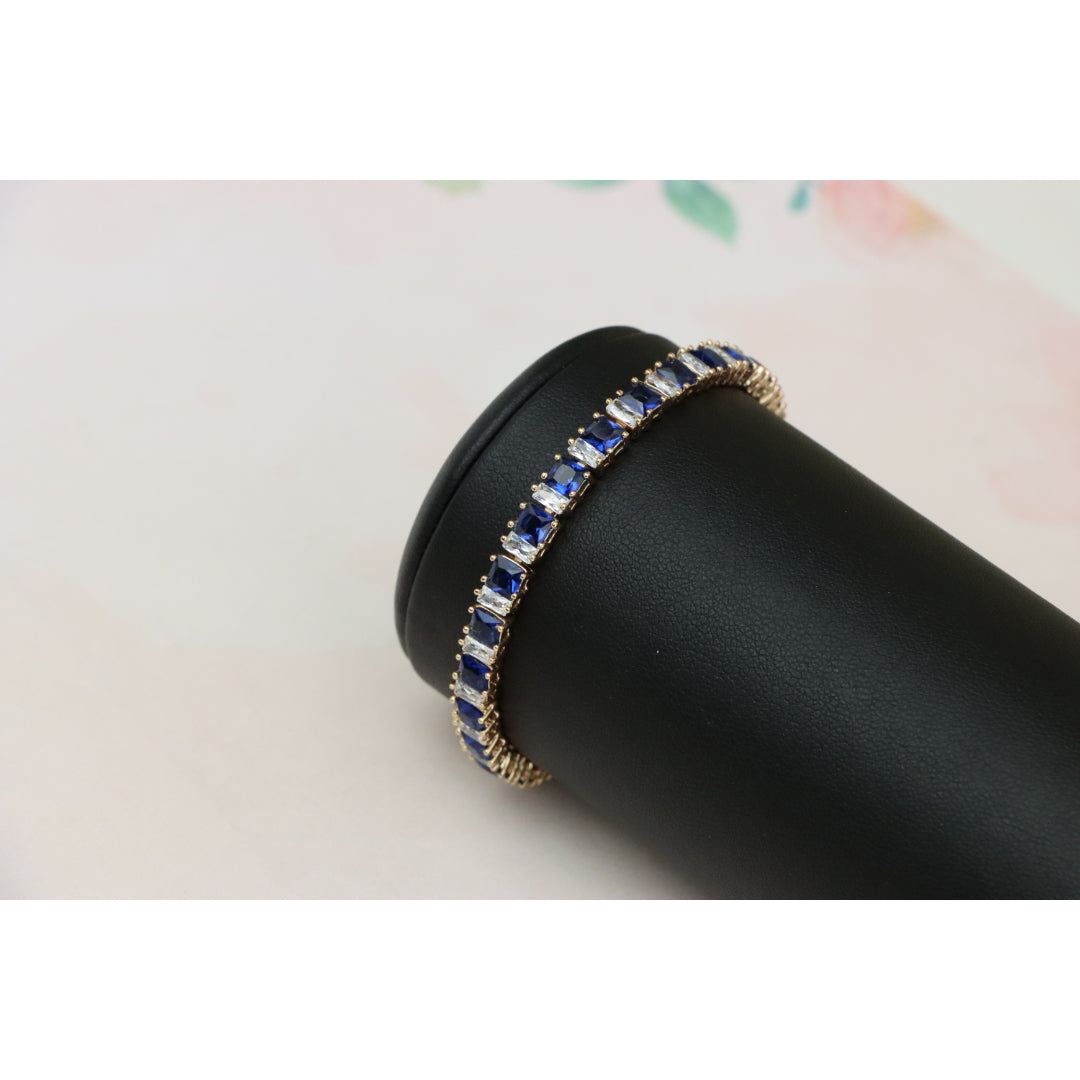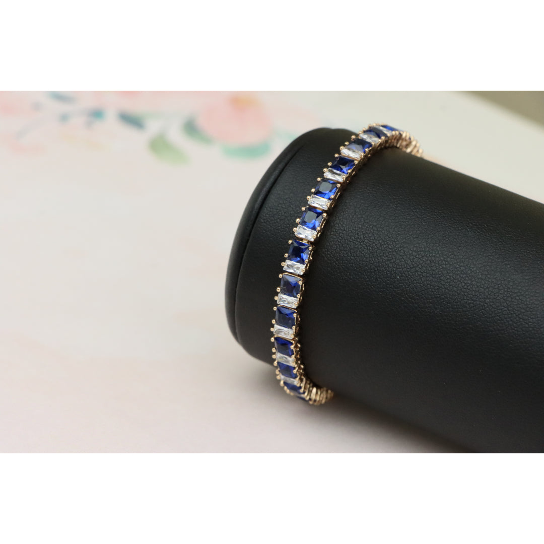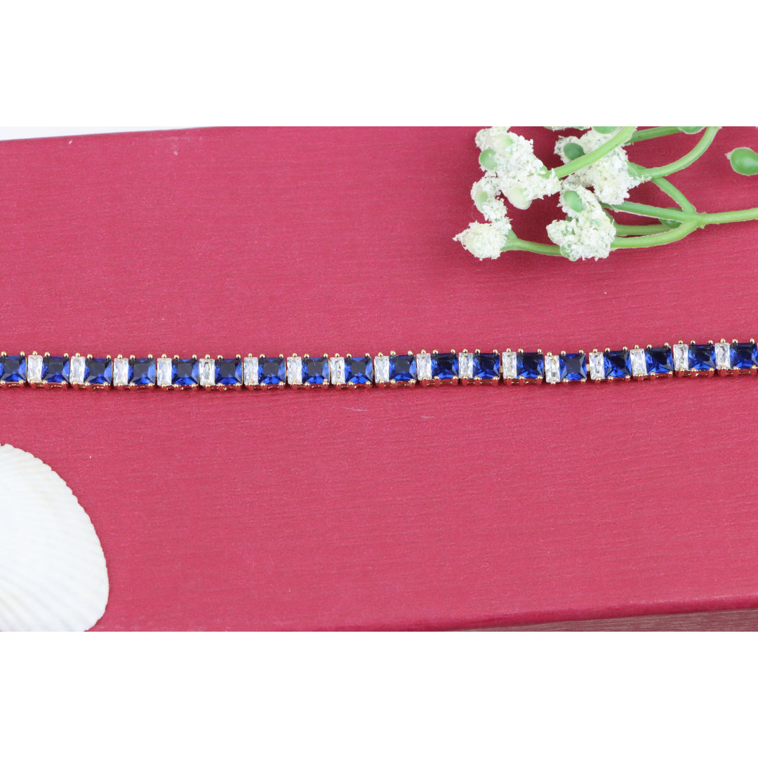 A timeless rose gold bracelet featuring alternating deep blue and clear square-cut CZ stones for a refined and striking contrast. Crafted with gold-plated high-quality brass for lasting brilliance.