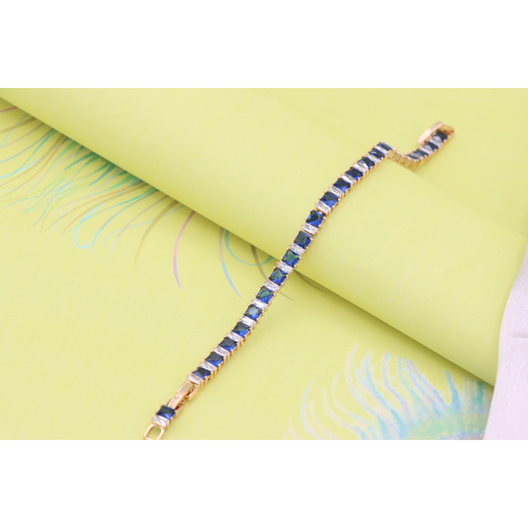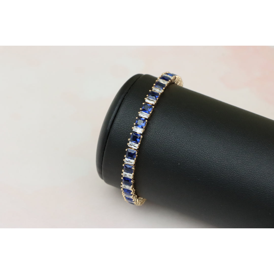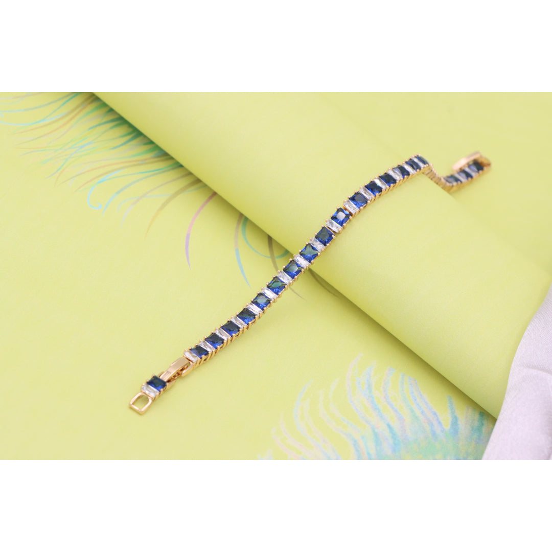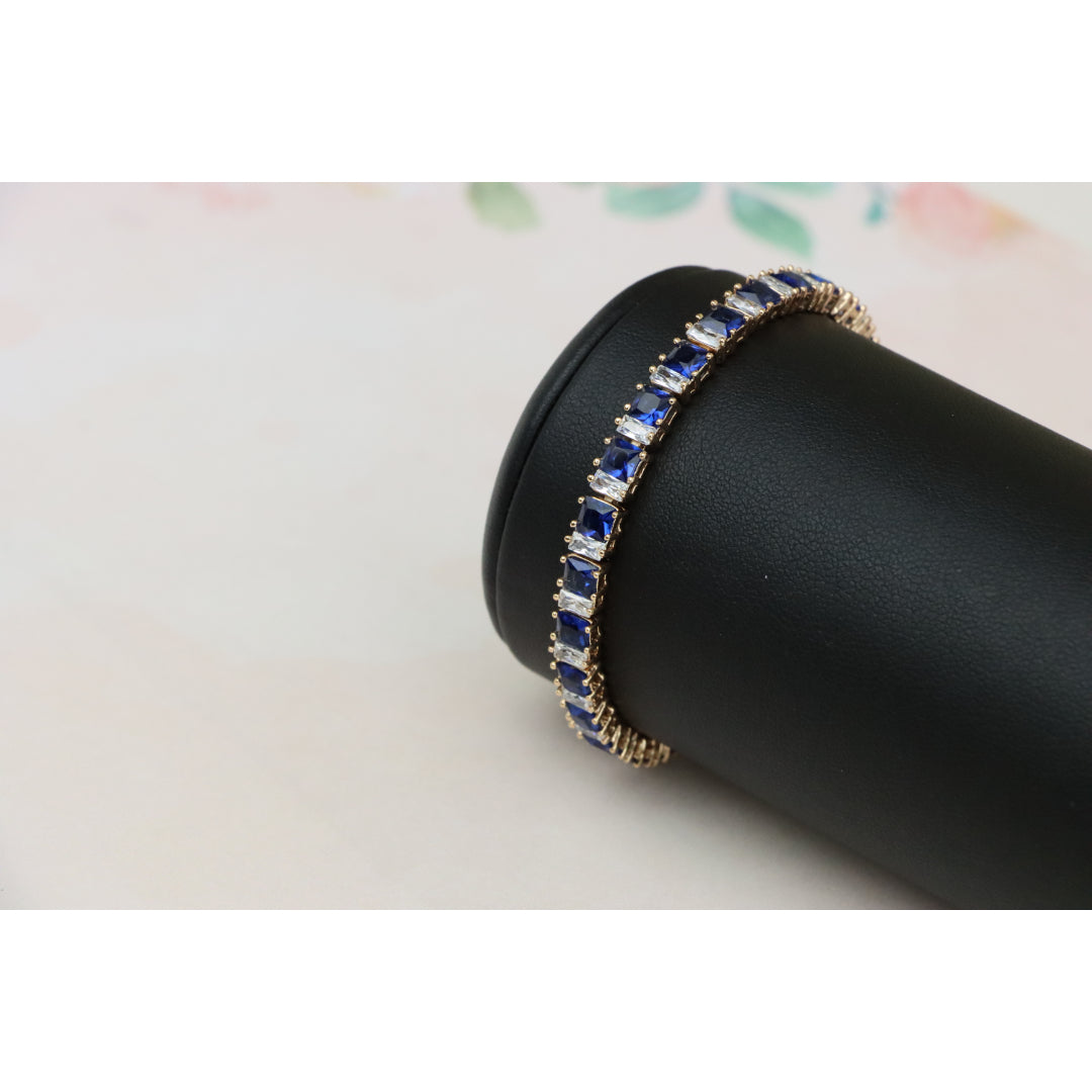 A timeless rose gold bracelet featuring alternating deep blue and clear square-cut CZ stones for a refined and striking contrast. Crafted with gold-plated high-quality brass for lasting brilliance.