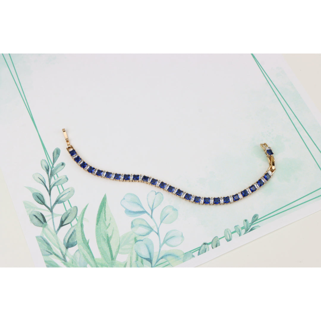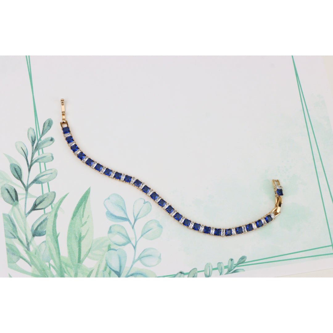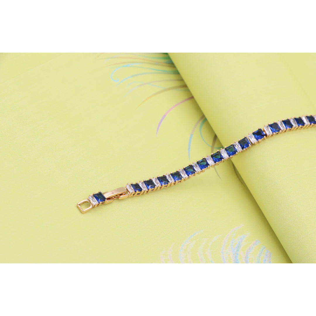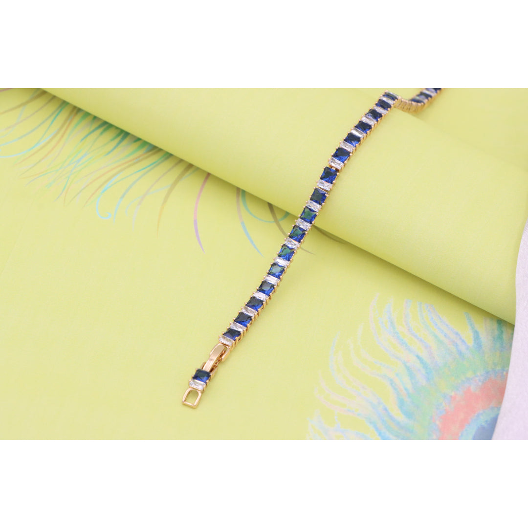 A timeless rose gold bracelet featuring alternating deep blue and clear square-cut CZ stones for a refined and striking contrast. Crafted with gold-plated high-quality brass for lasting brilliance.