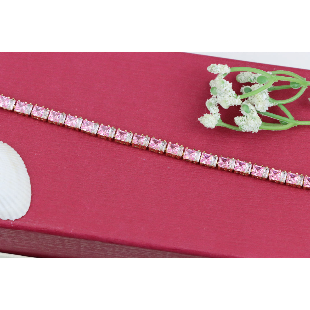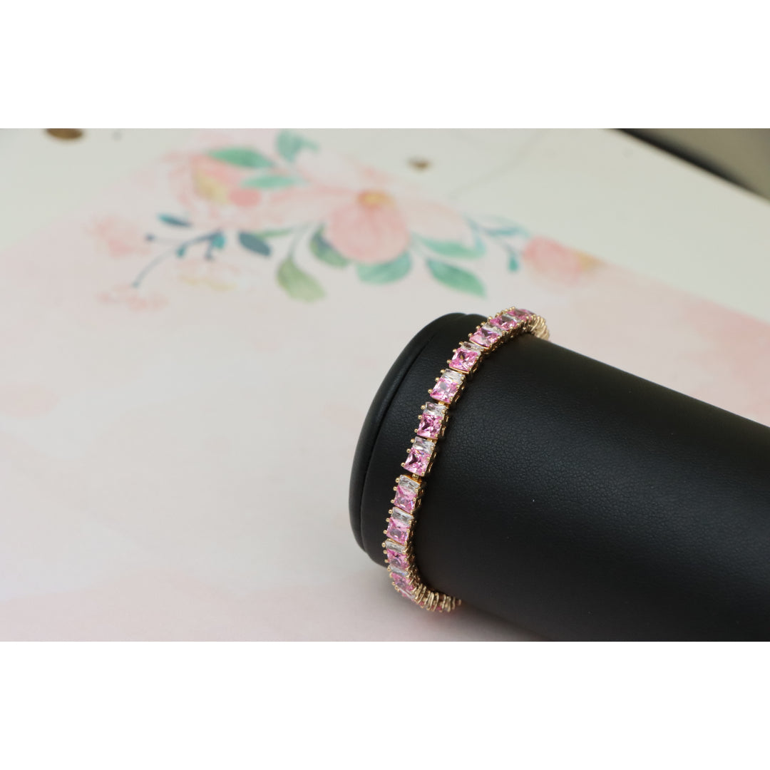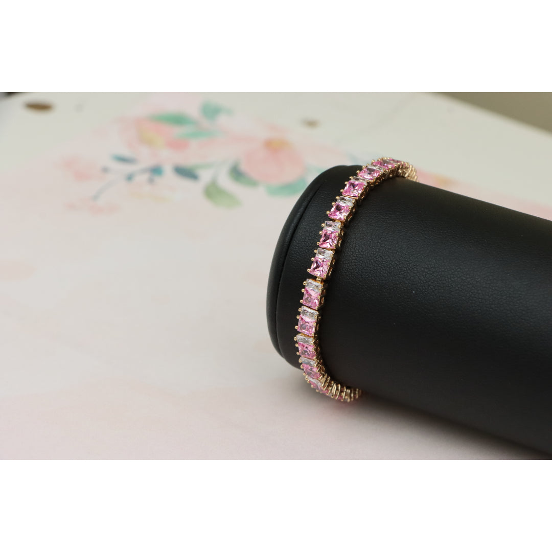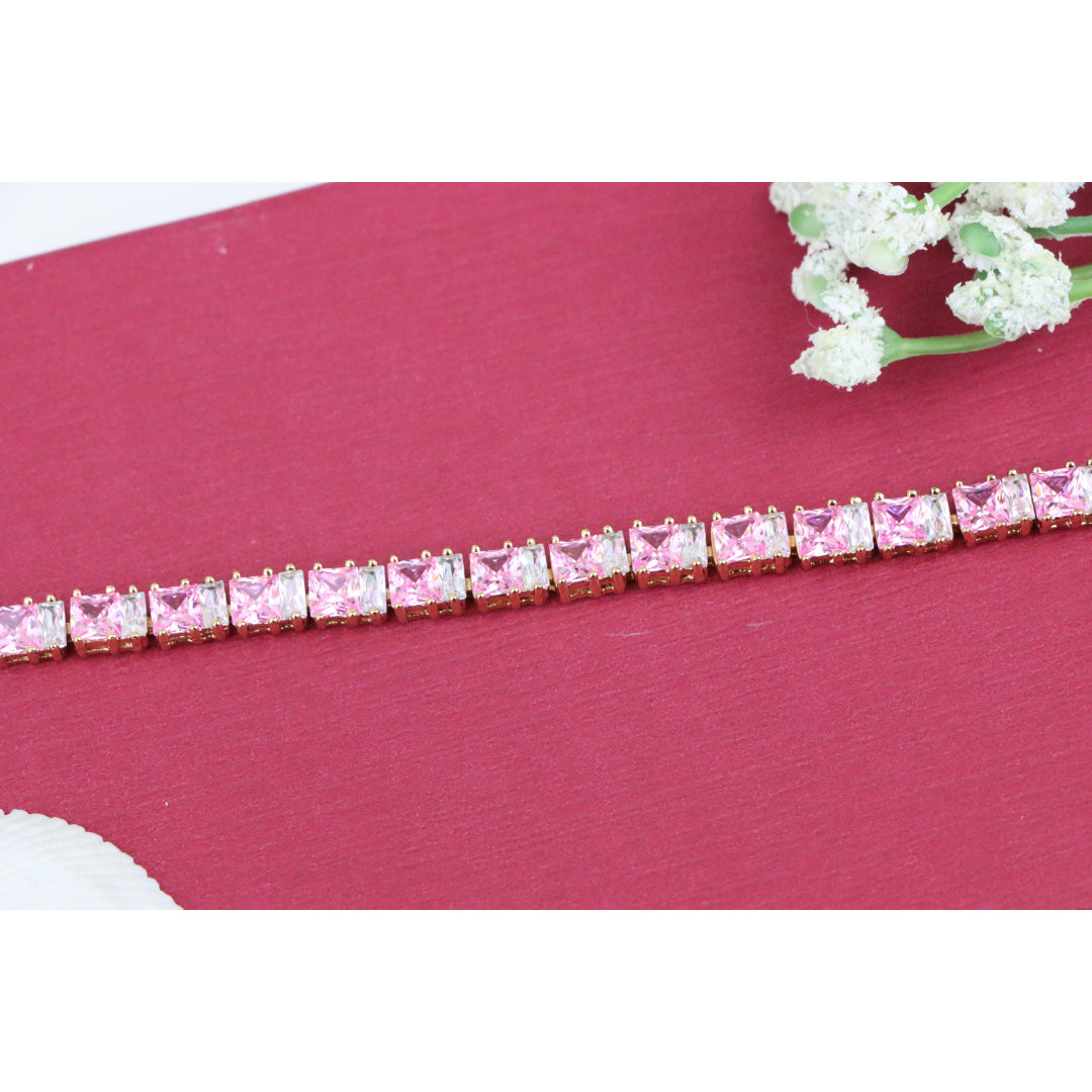 A stunning rose gold bracelet featuring shimmering pink square-cut cubic zirconia stones for a timeless, radiant look. Crafted with gold-plated high-quality brass for durability and shine.