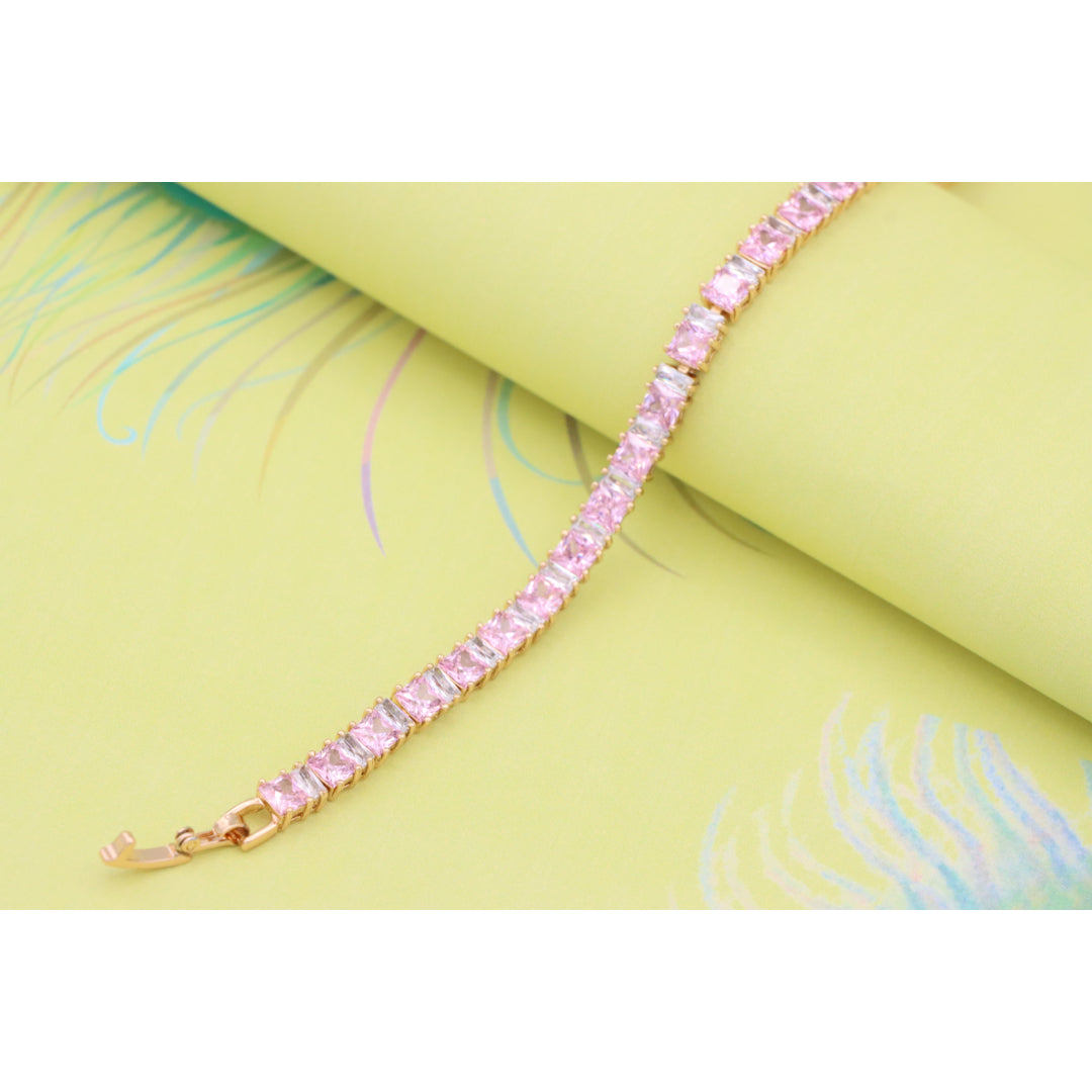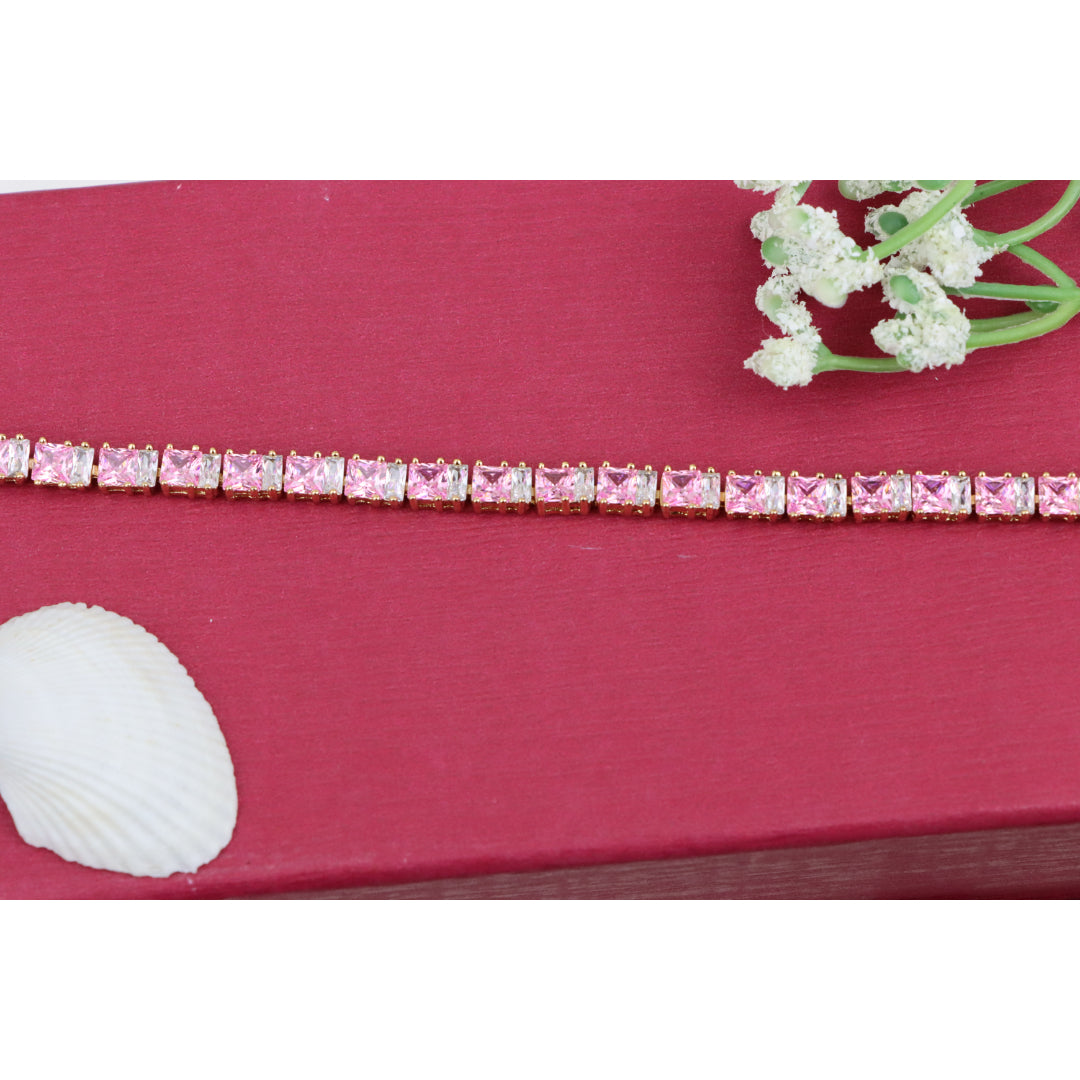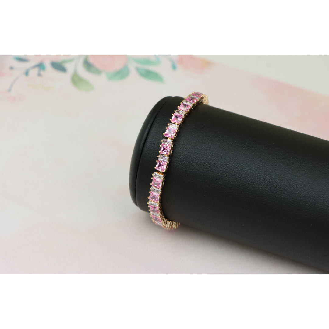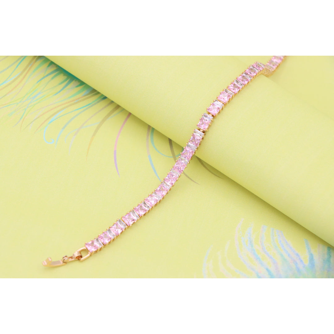A stunning rose gold bracelet featuring shimmering pink square-cut cubic zirconia stones for a timeless, radiant look. Crafted with gold-plated high-quality brass for durability and shine.