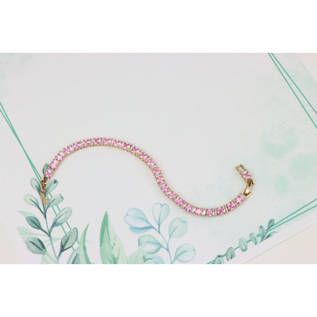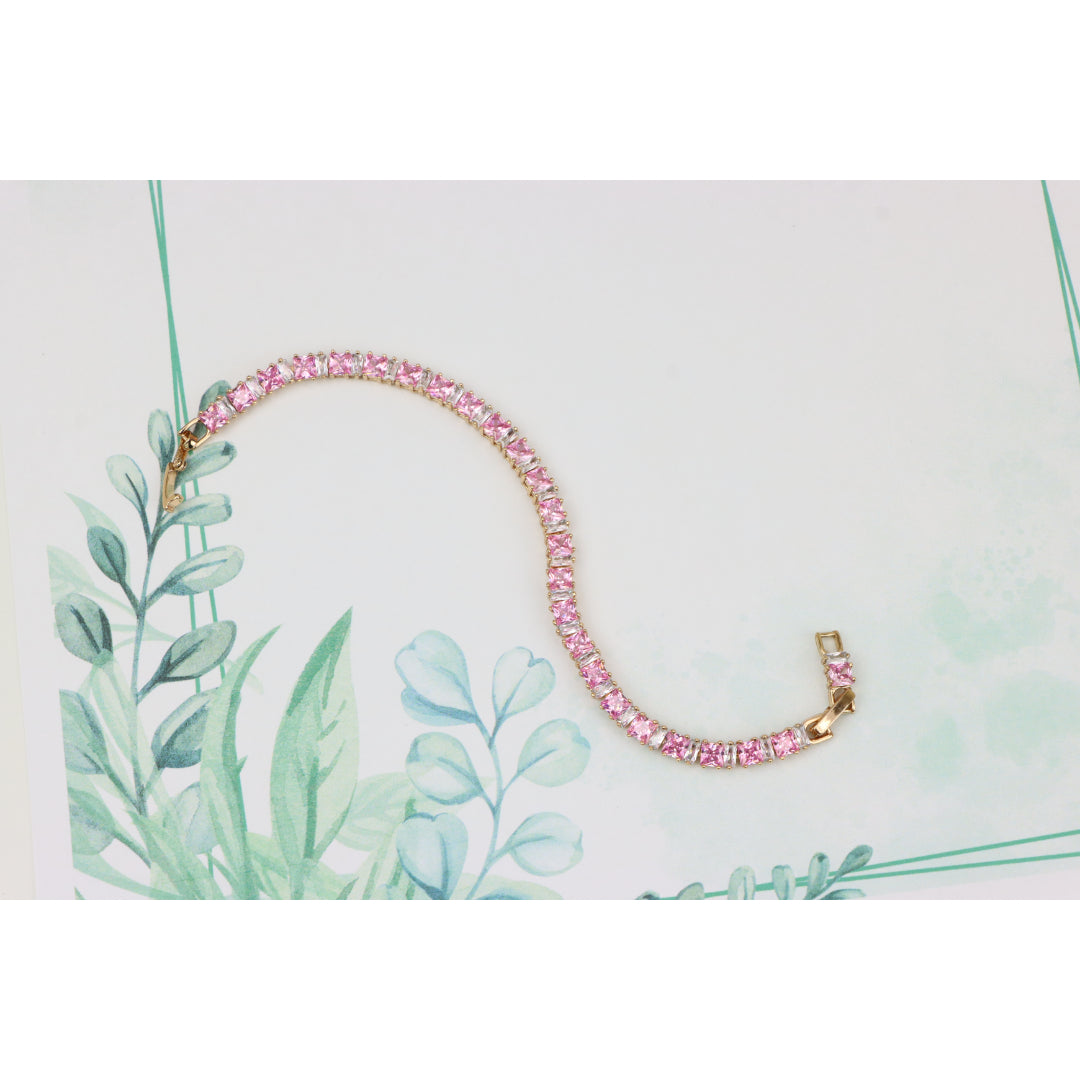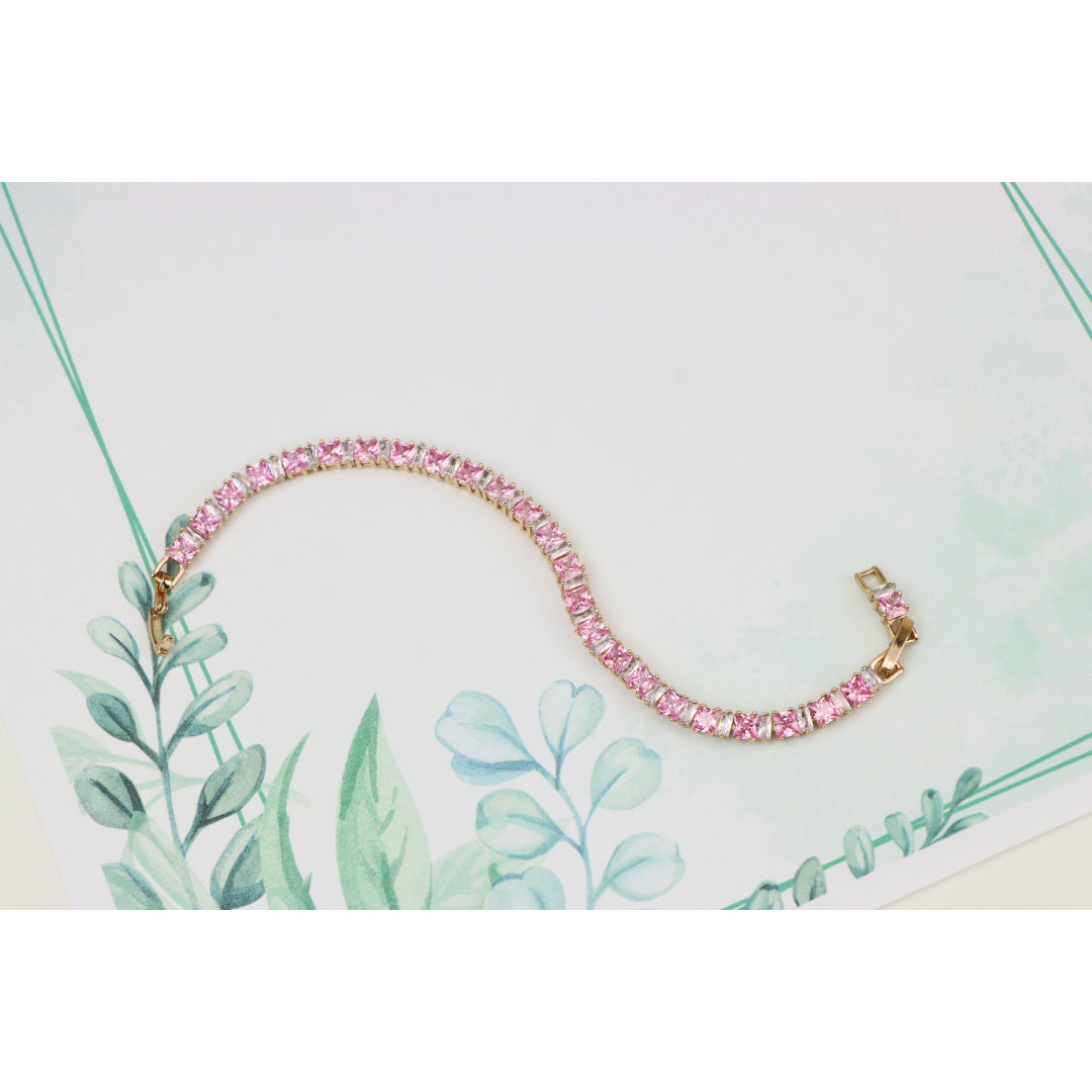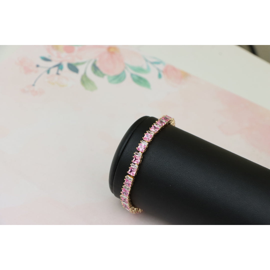 A stunning rose gold bracelet featuring shimmering pink square-cut cubic zirconia stones for a timeless, radiant look. Crafted with gold-plated high-quality brass for durability and shine.