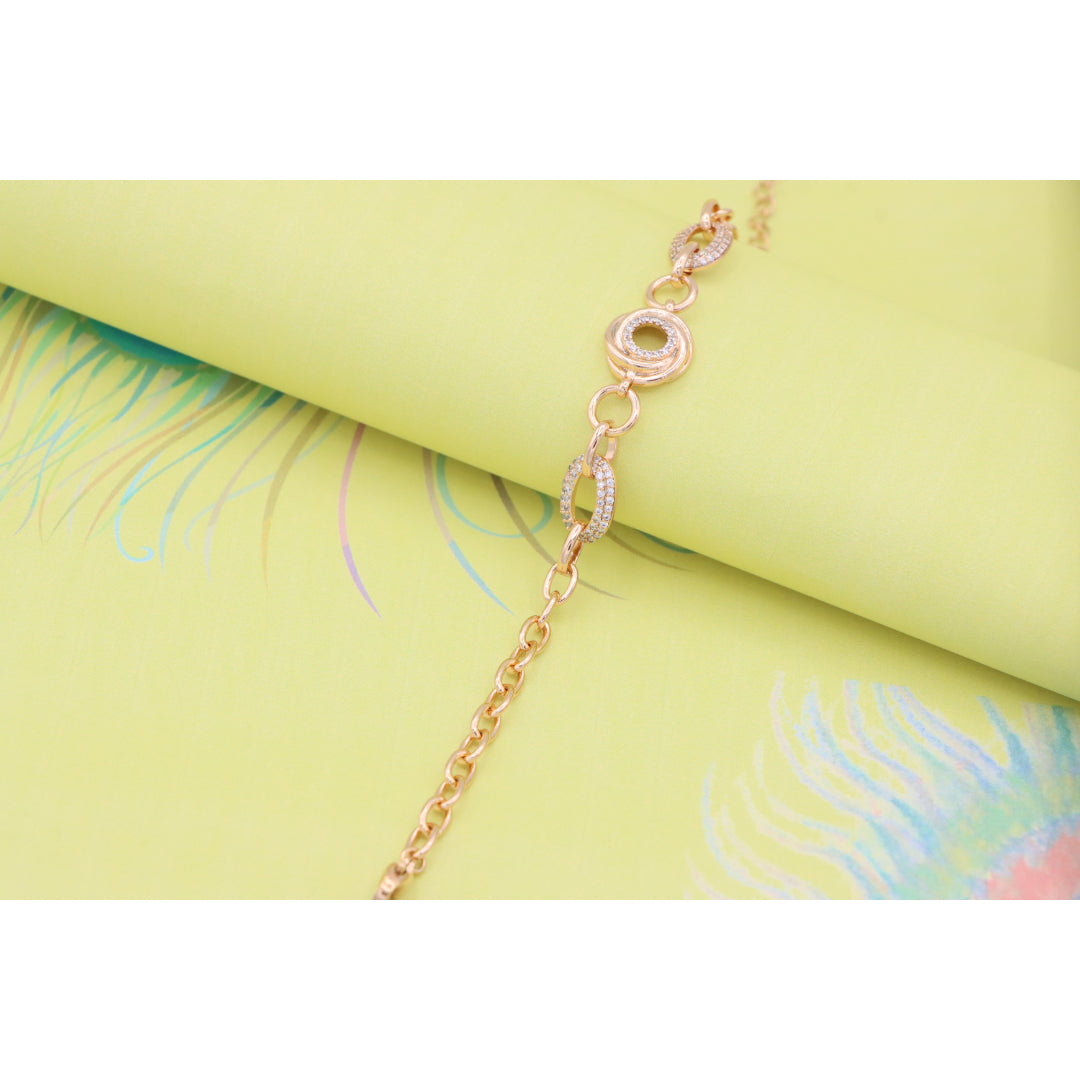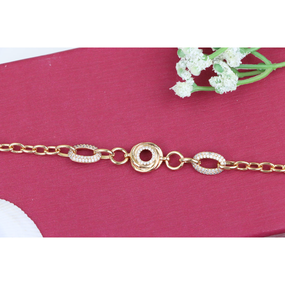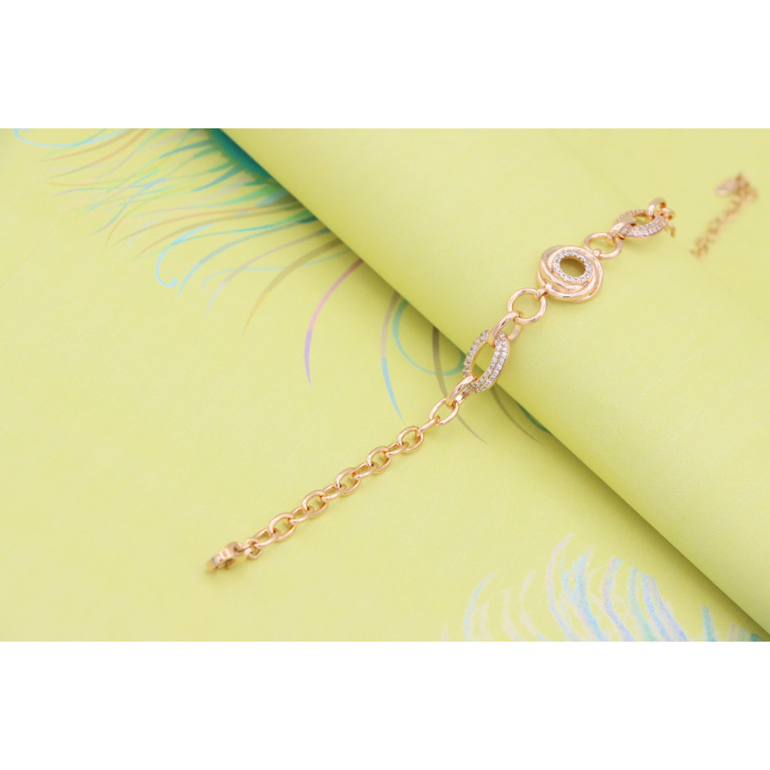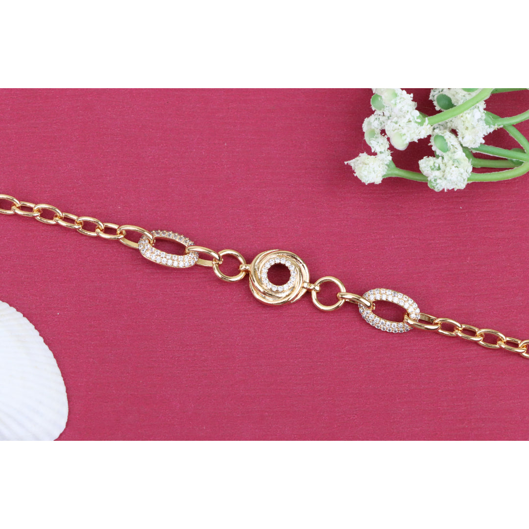 A stylish rose gold bracelet showcasing textured circular and oval links, accented with sparkling CZ stones. Crafted from gold-plated high-quality brass for a radiant and lasting finish.