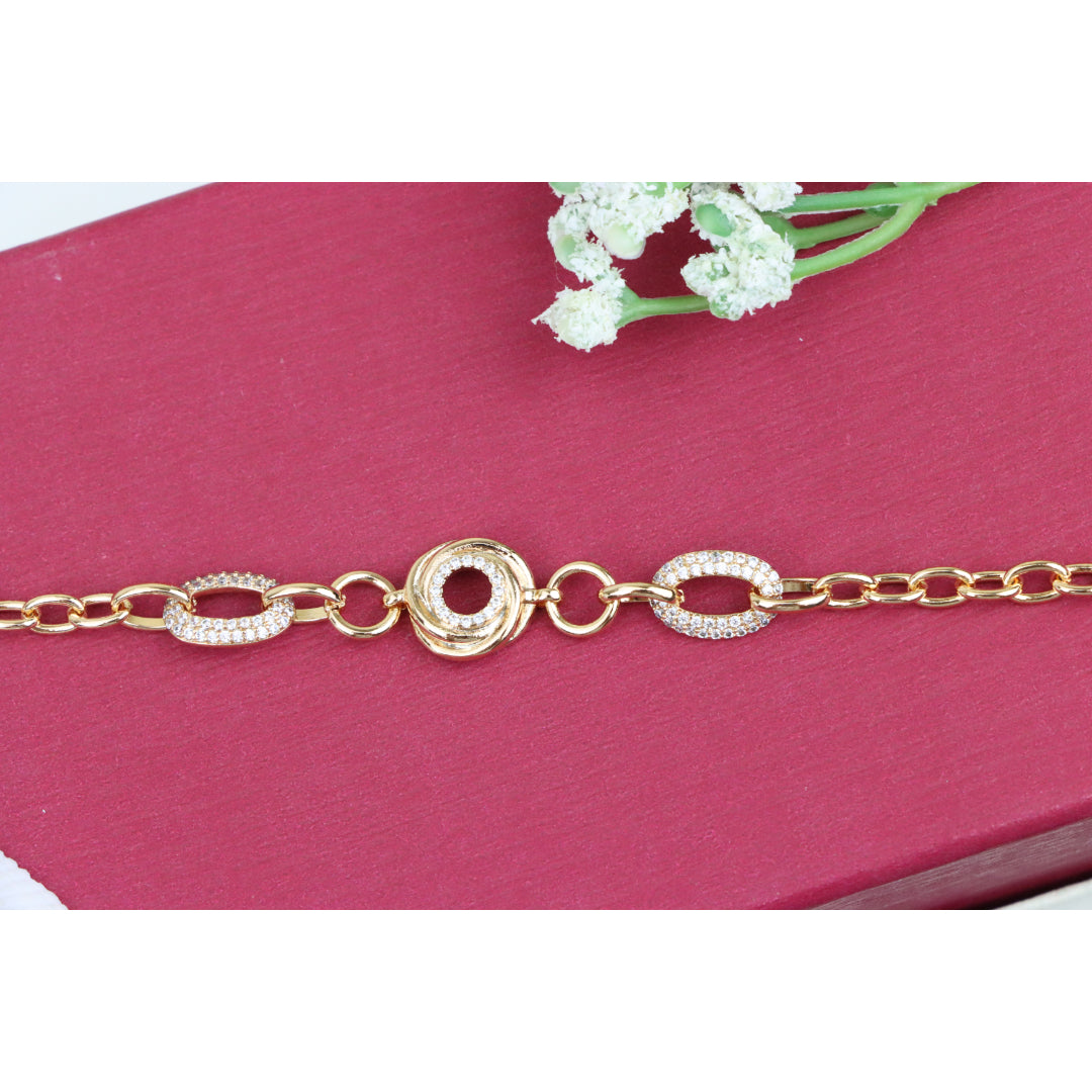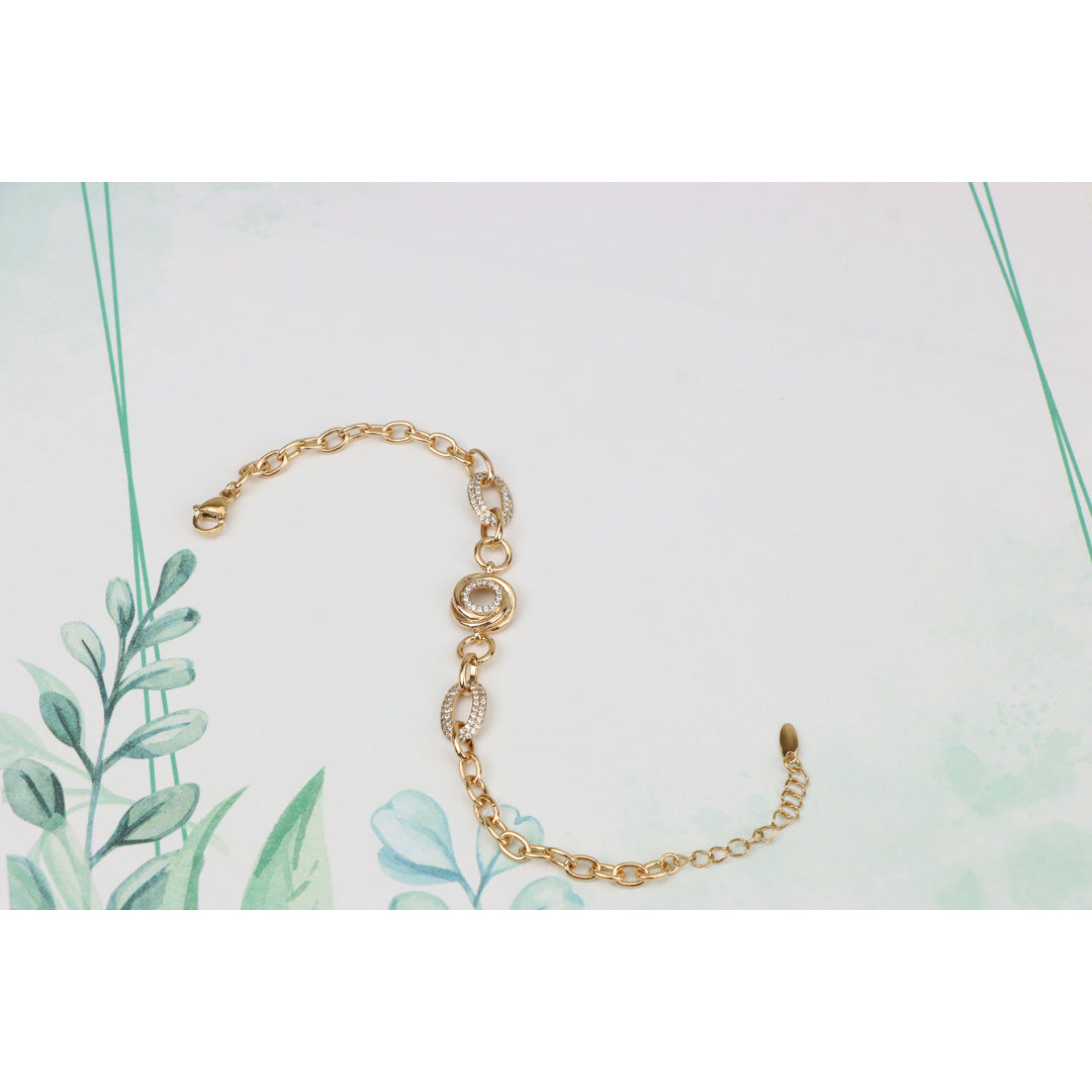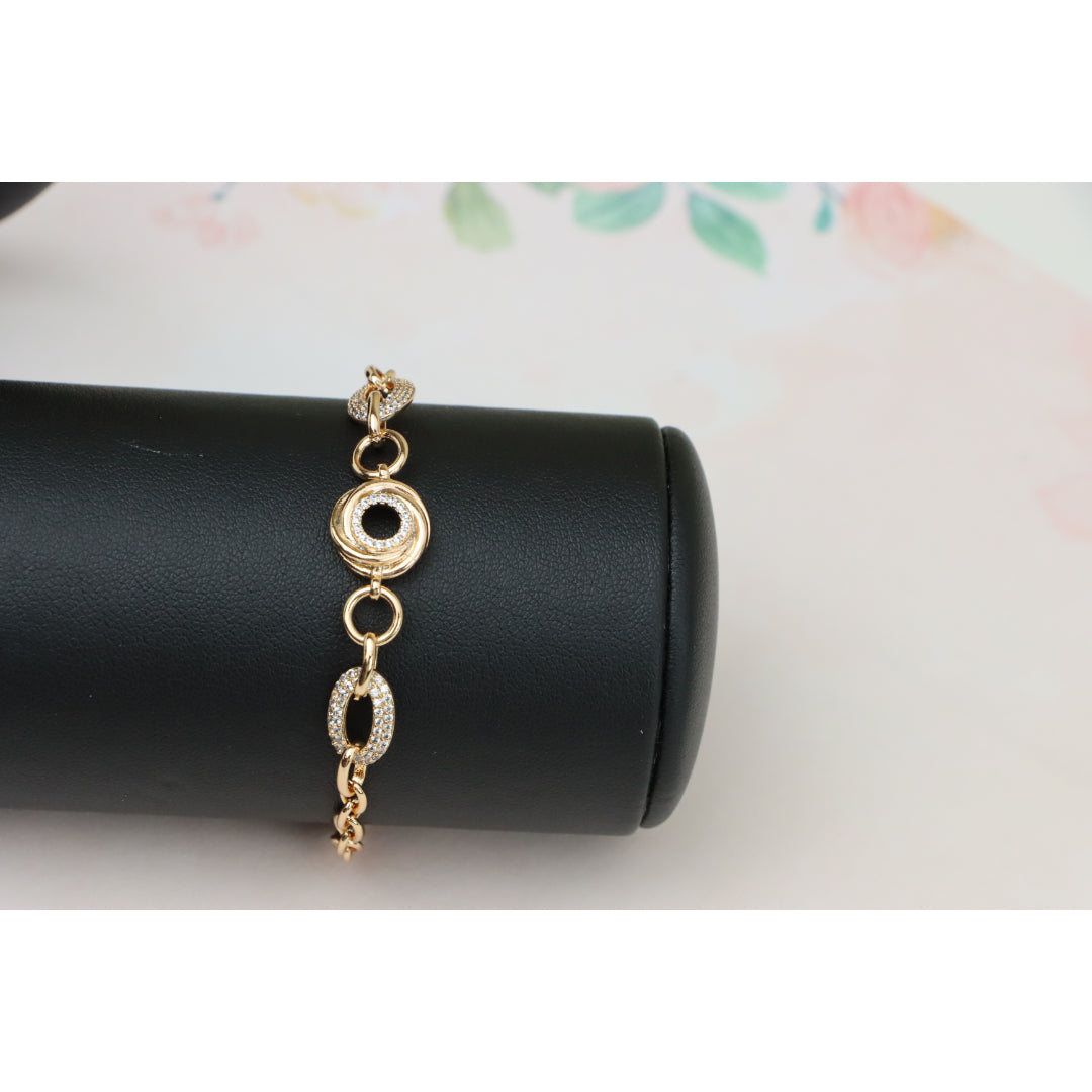 A stylish rose gold bracelet showcasing textured circular and oval links, accented with sparkling CZ stones. Crafted from gold-plated high-quality brass for a radiant and lasting finish.