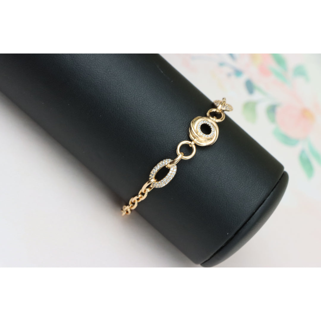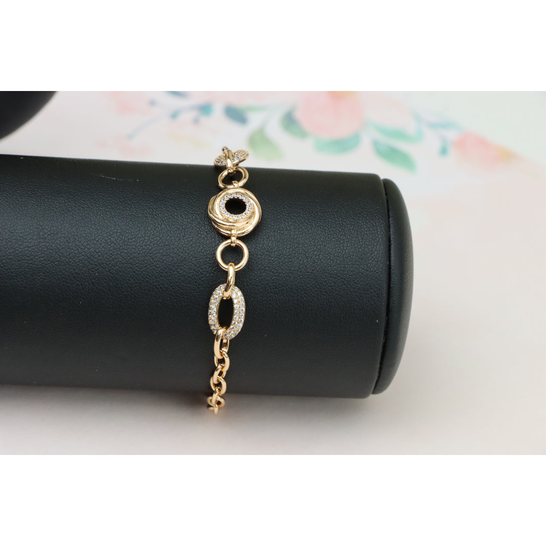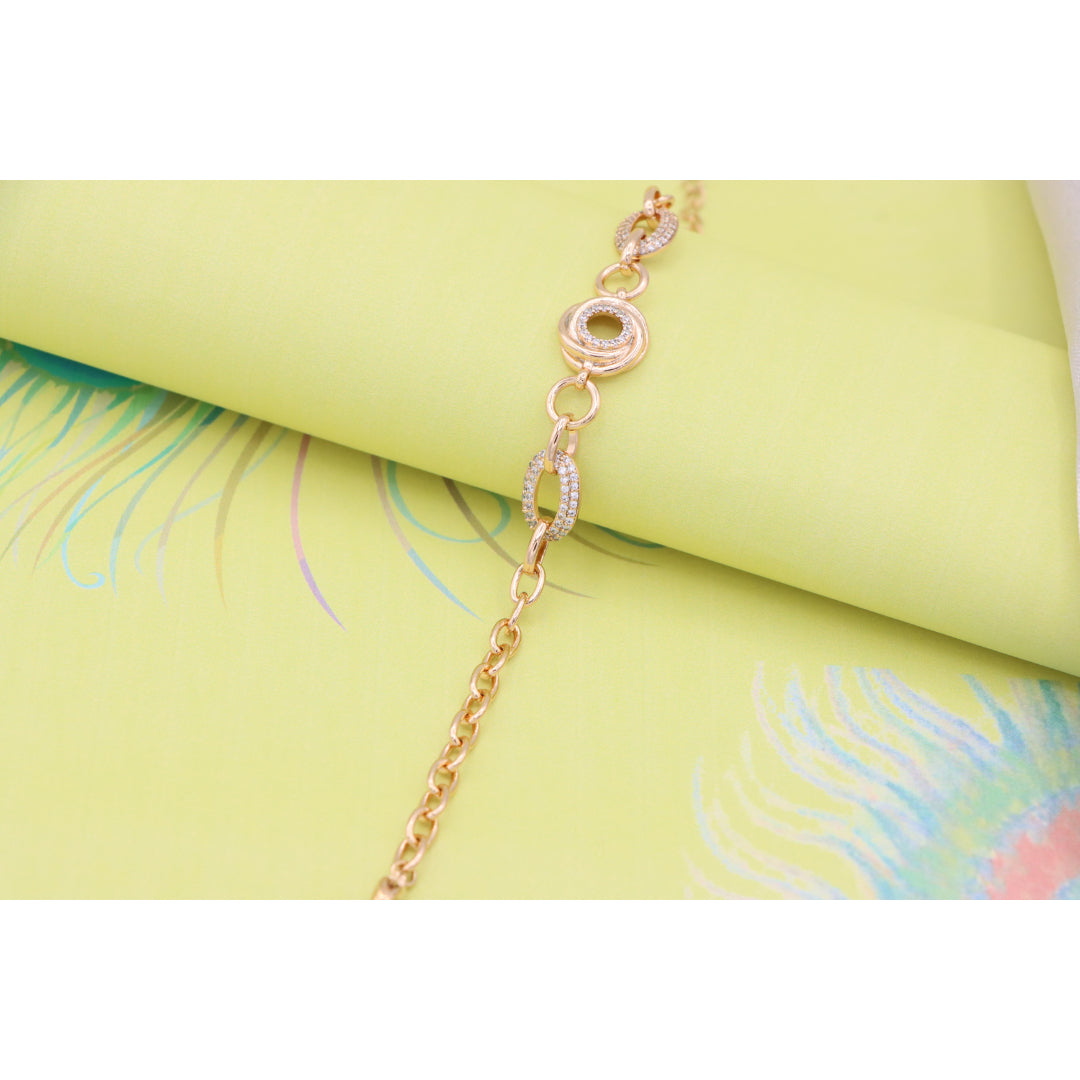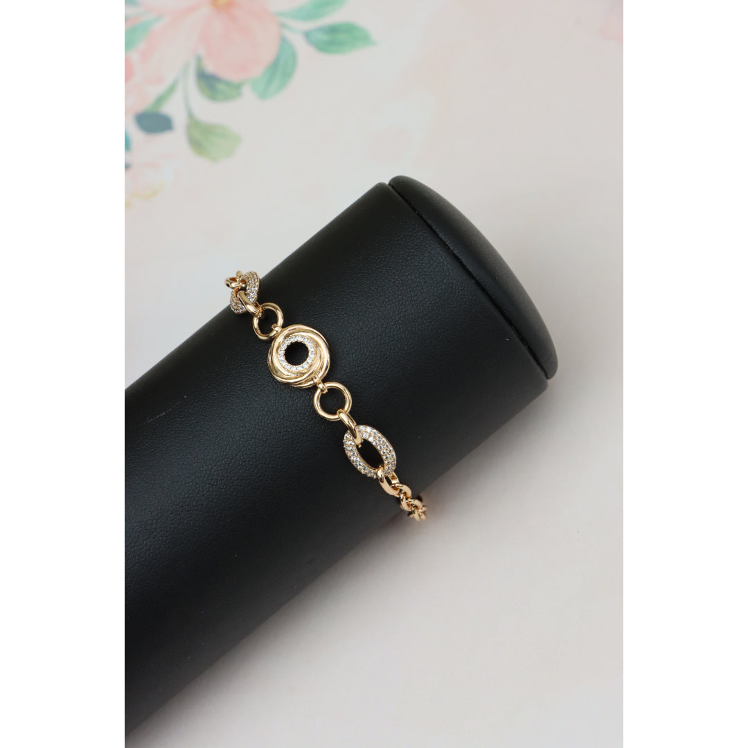A stylish rose gold bracelet showcasing textured circular and oval links, accented with sparkling CZ stones. Crafted from gold-plated high-quality brass for a radiant and lasting finish.