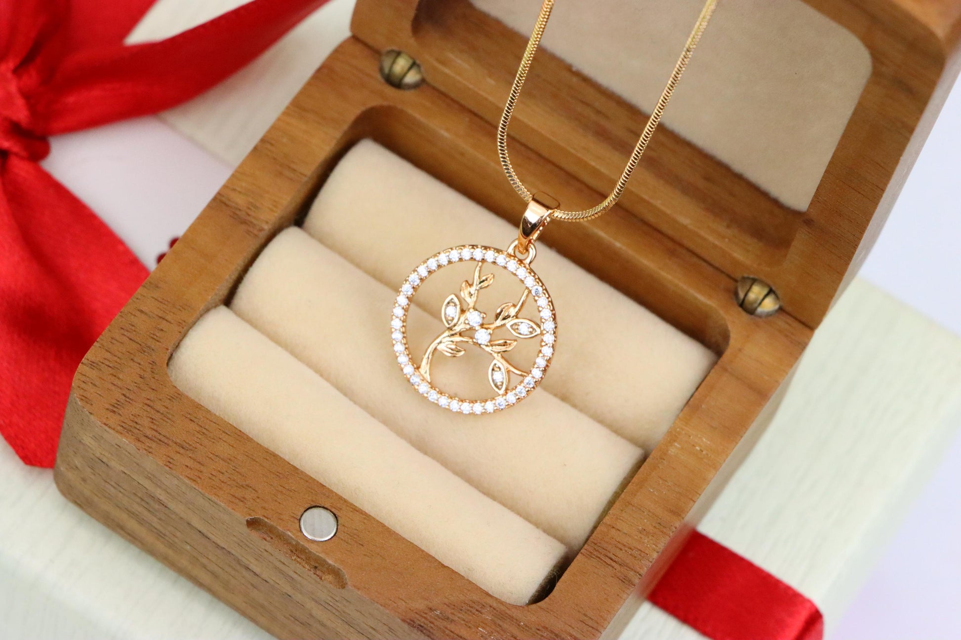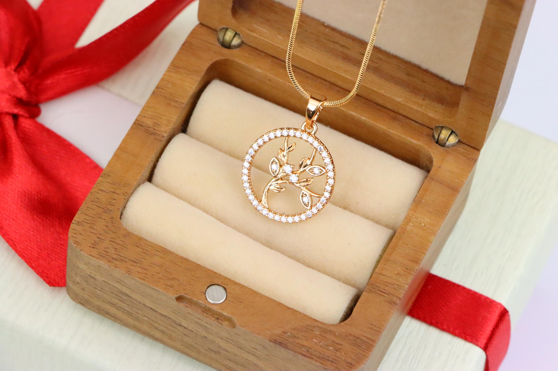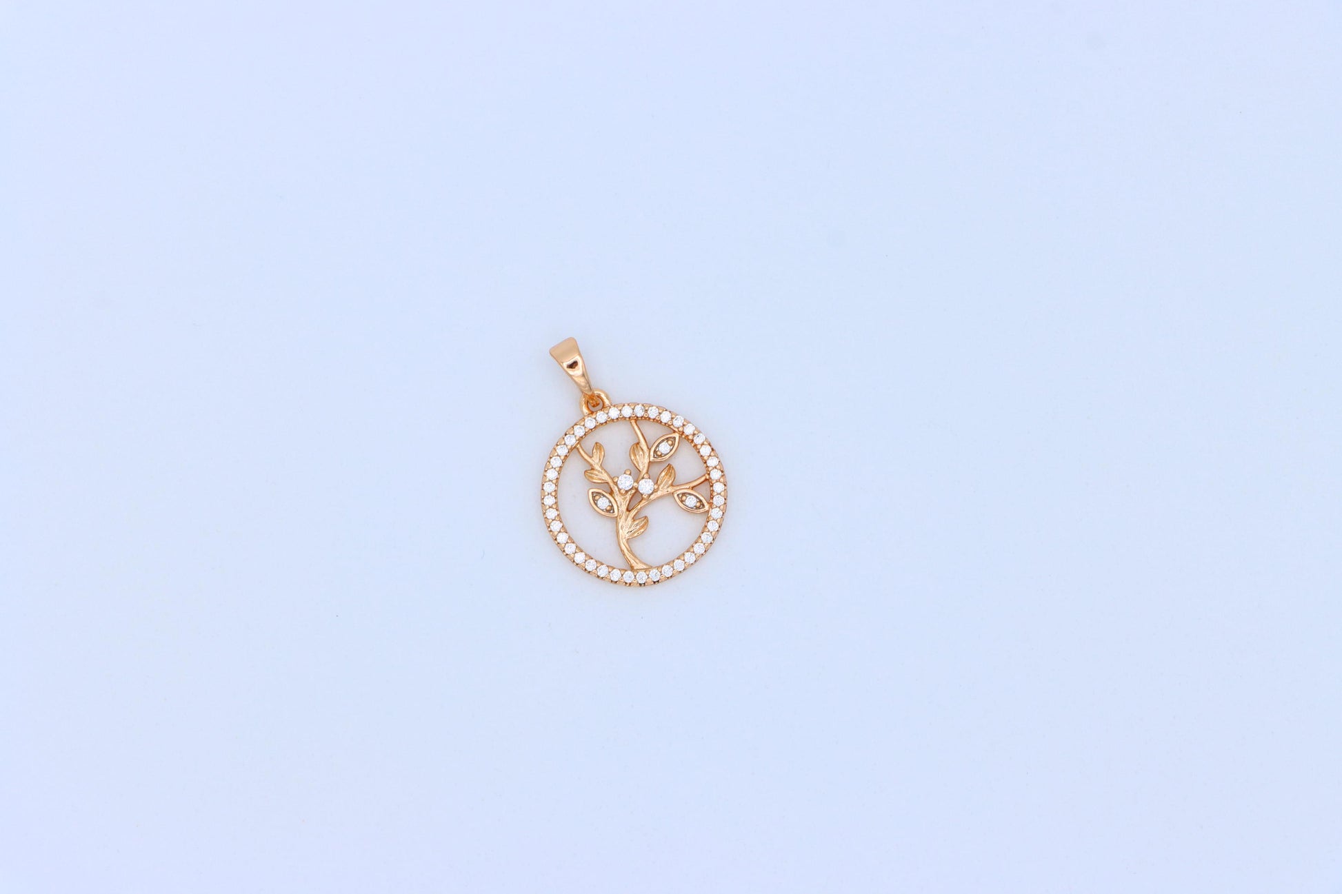 This elegant circular pendant features a delicate tree branch motif accented with sparkling CZ stones, symbolizing life and growth in gold-plated brass.