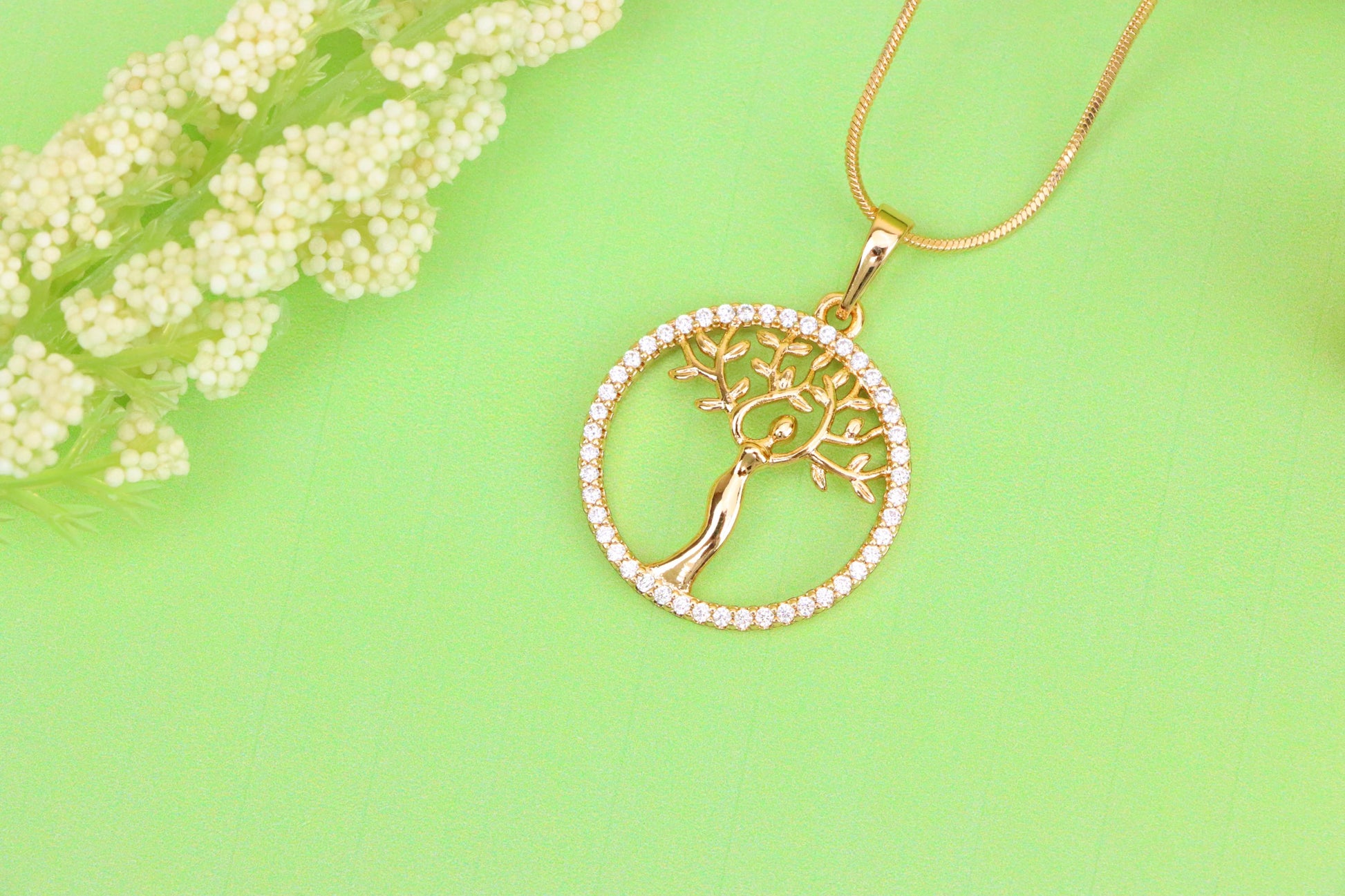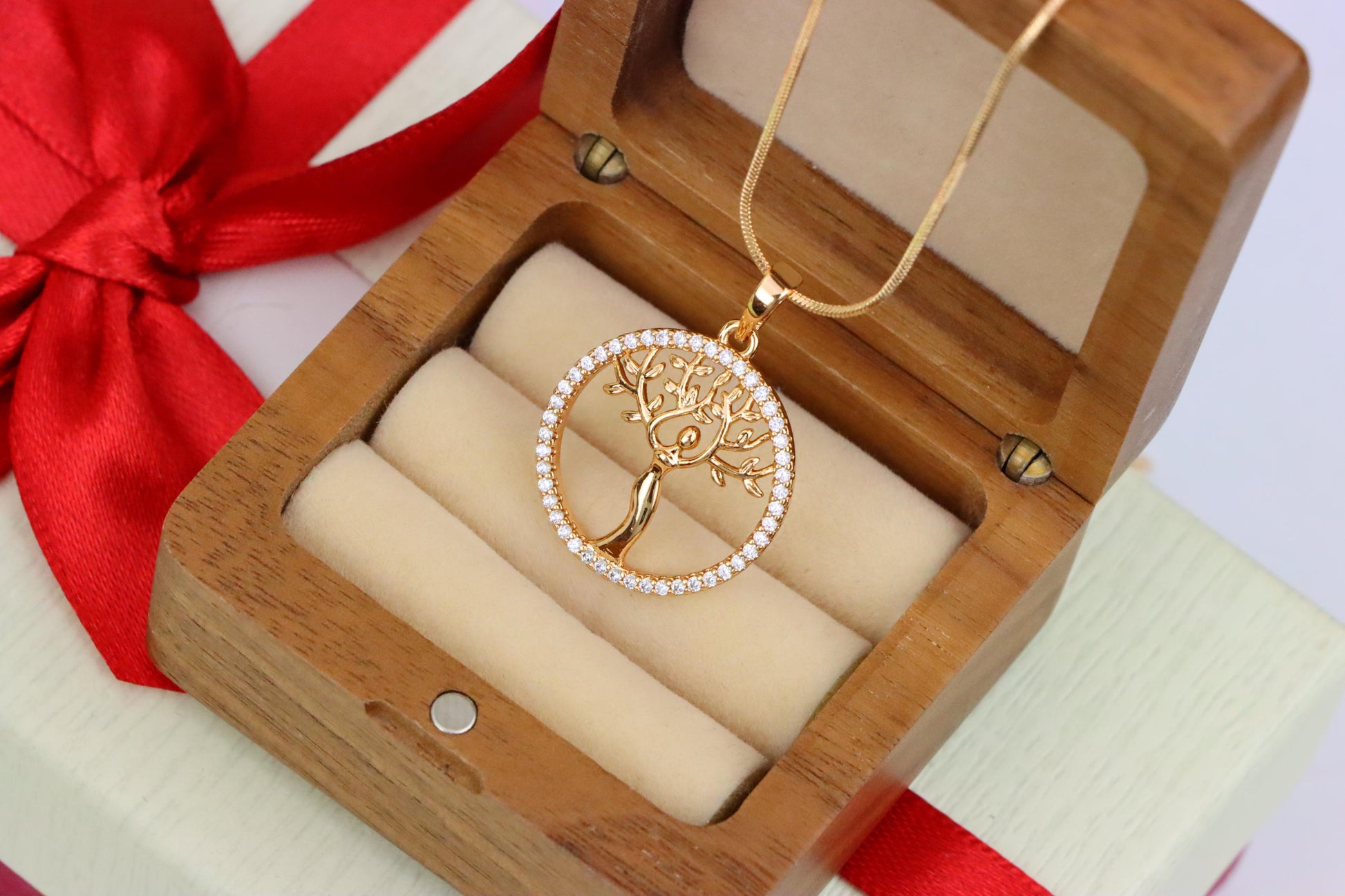 Celebrate feminine strength and natural beauty with this symbolic pendant featuring a woman growing into a tree, framed by shimmering stones.