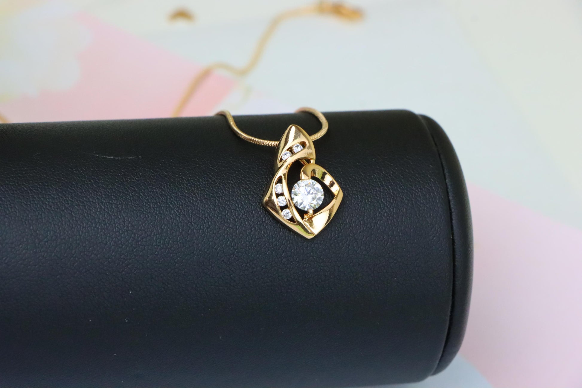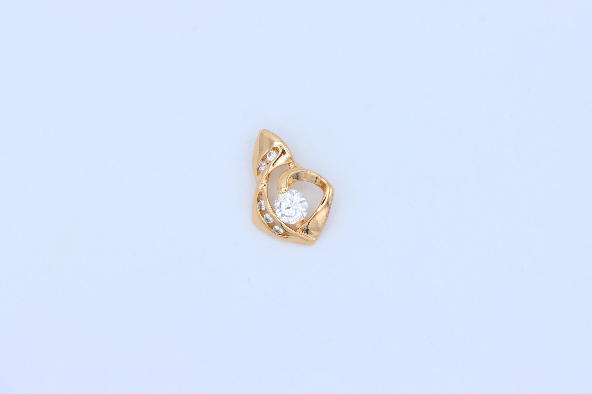 Modern and elegant pendant with a twisted design and sparkling center.