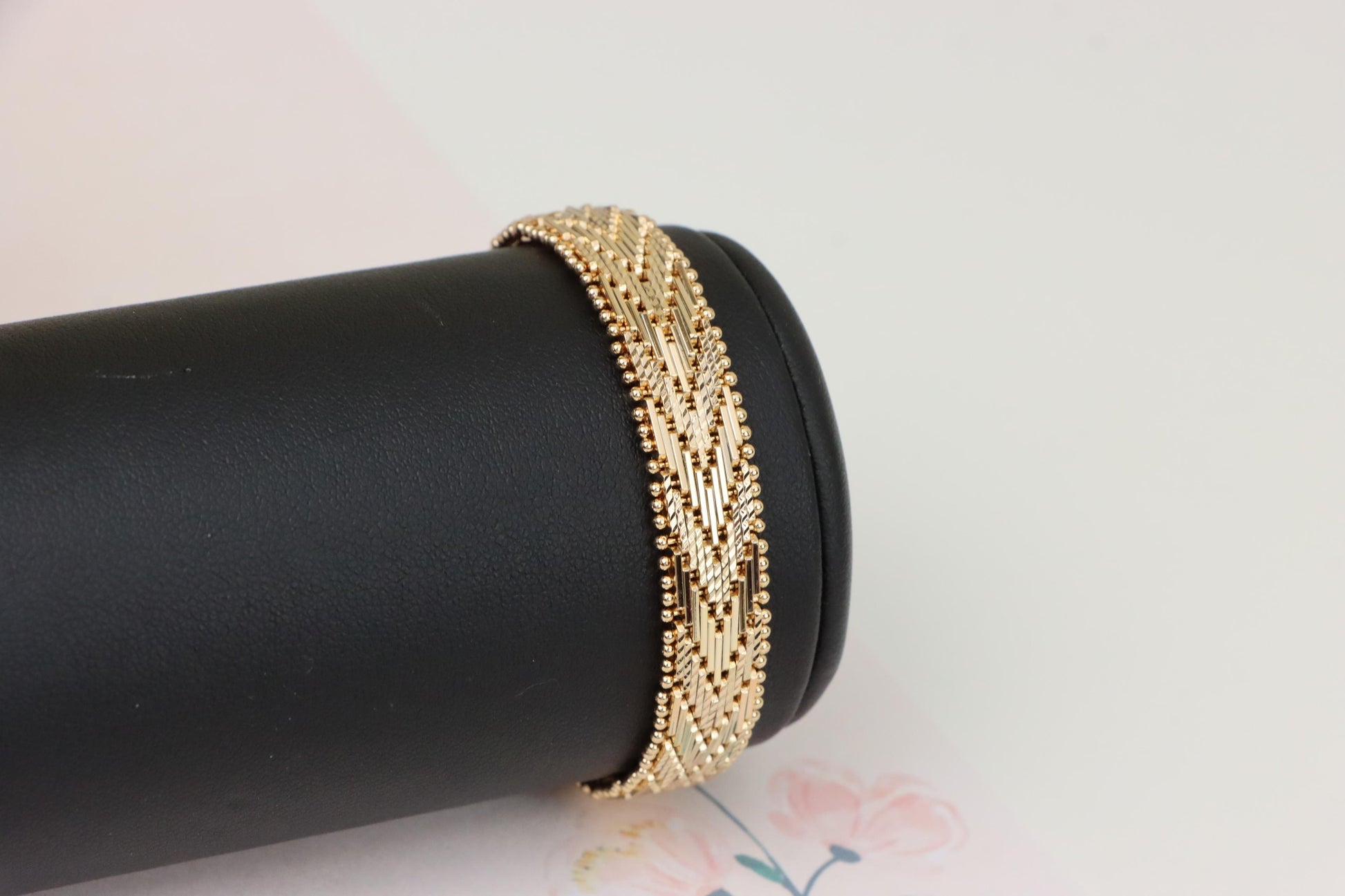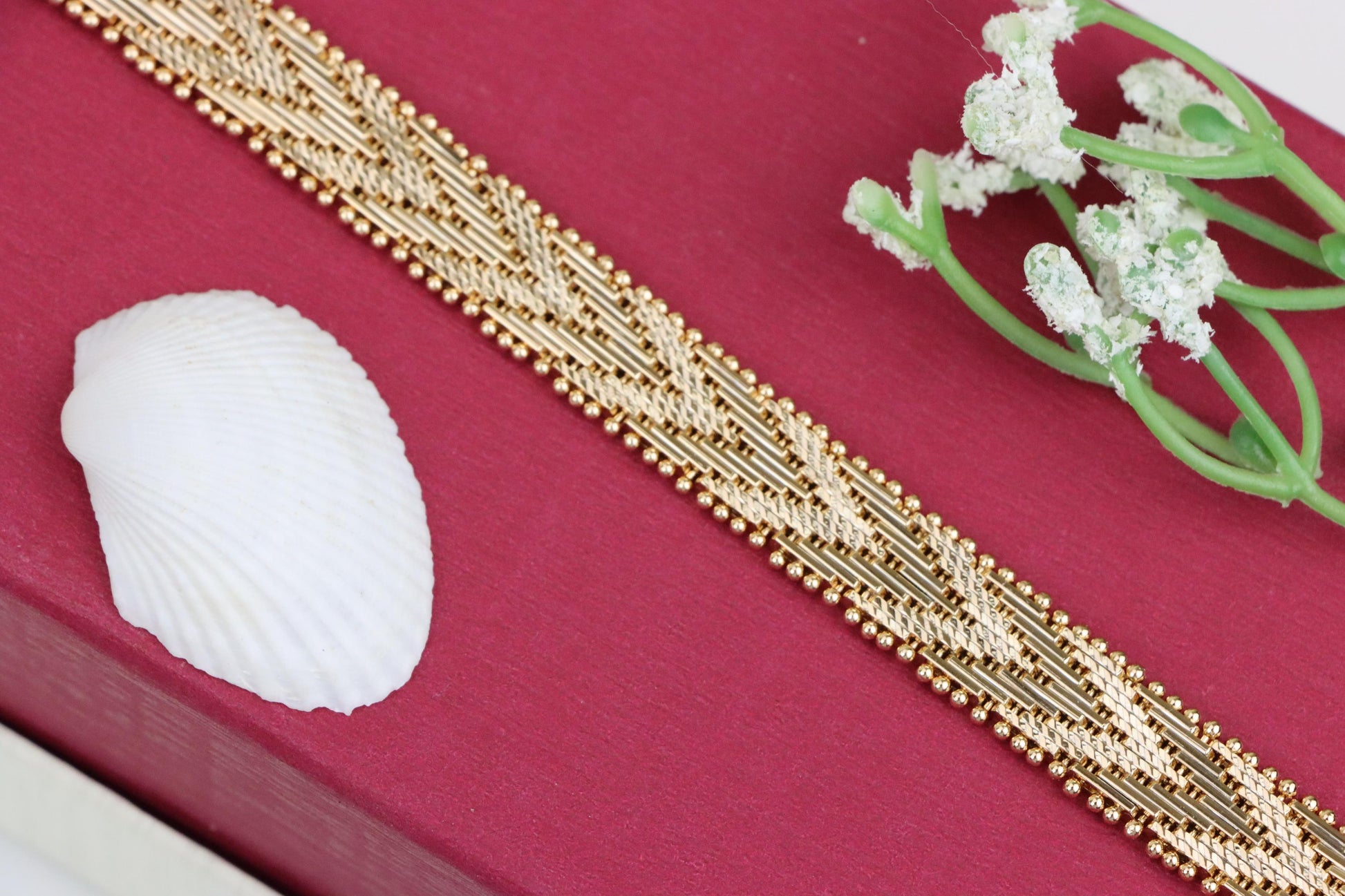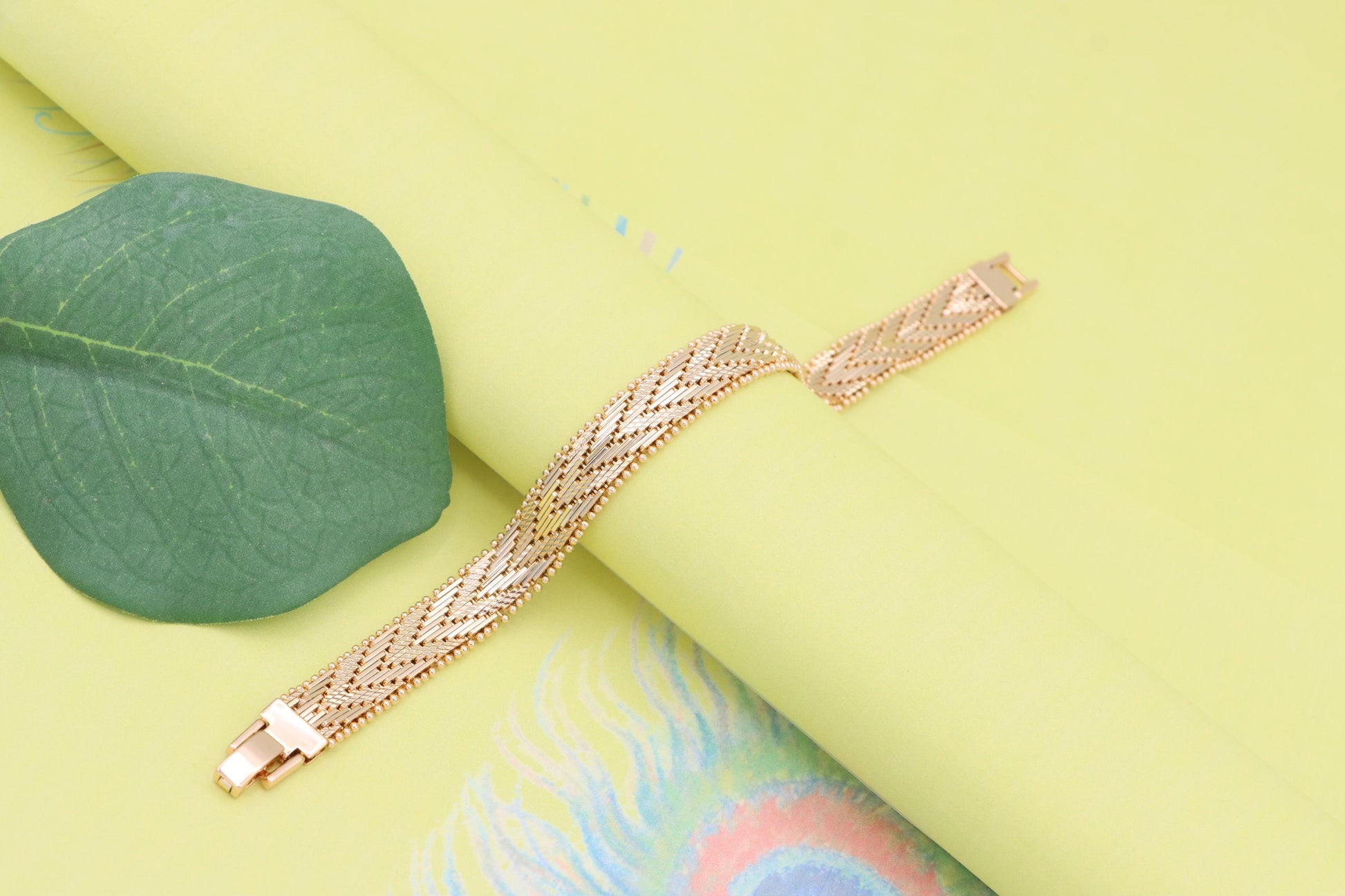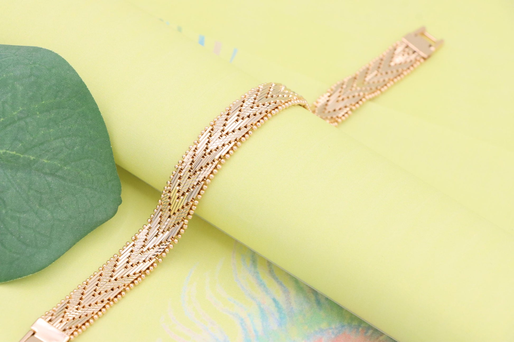 Elegant and finely crafted, this rose gold bracelet features a woven design highlighted with intricate beaded edges. A timeless accessory that adds a touch of sophistication to any outfit.