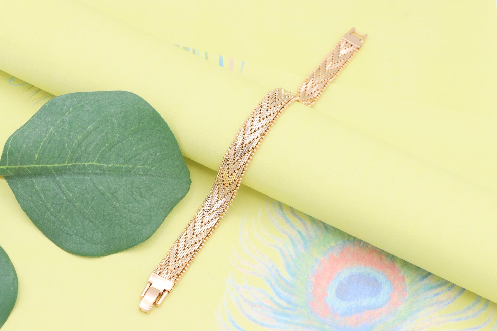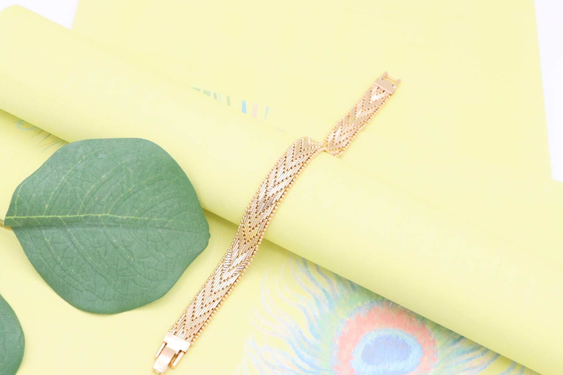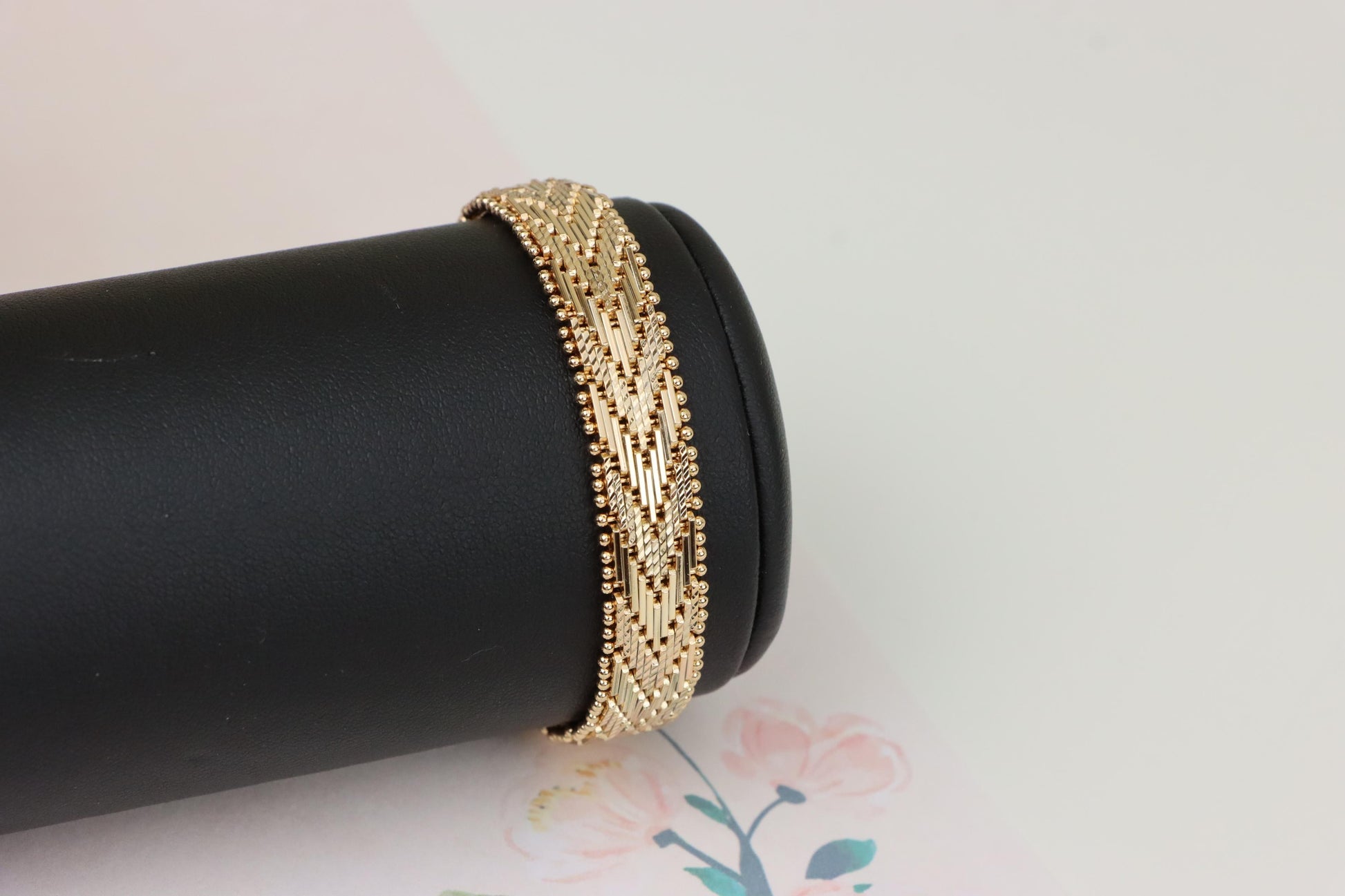 Elegant and finely crafted, this rose gold bracelet features a woven design highlighted with intricate beaded edges. A timeless accessory that adds a touch of sophistication to any outfit.