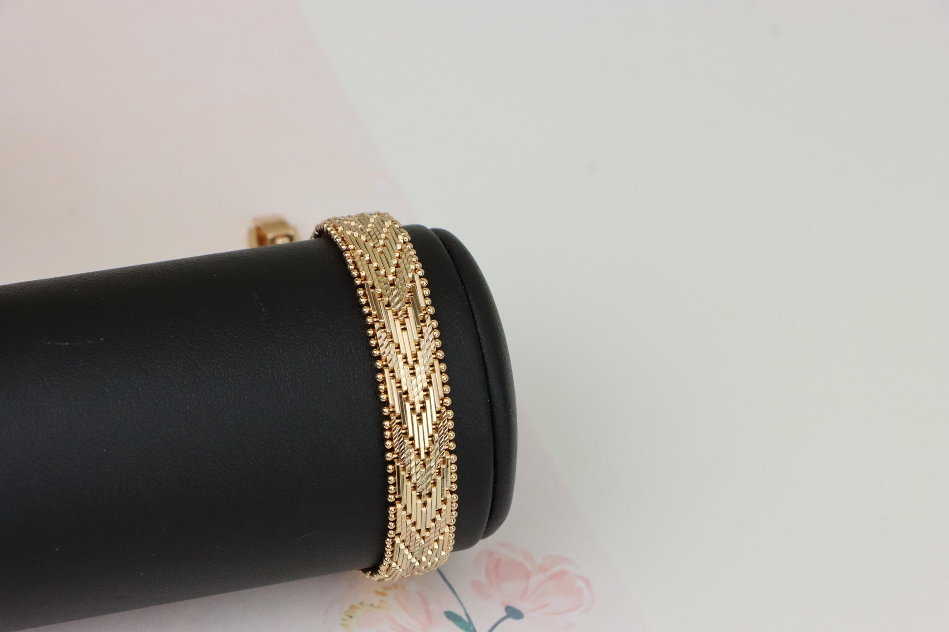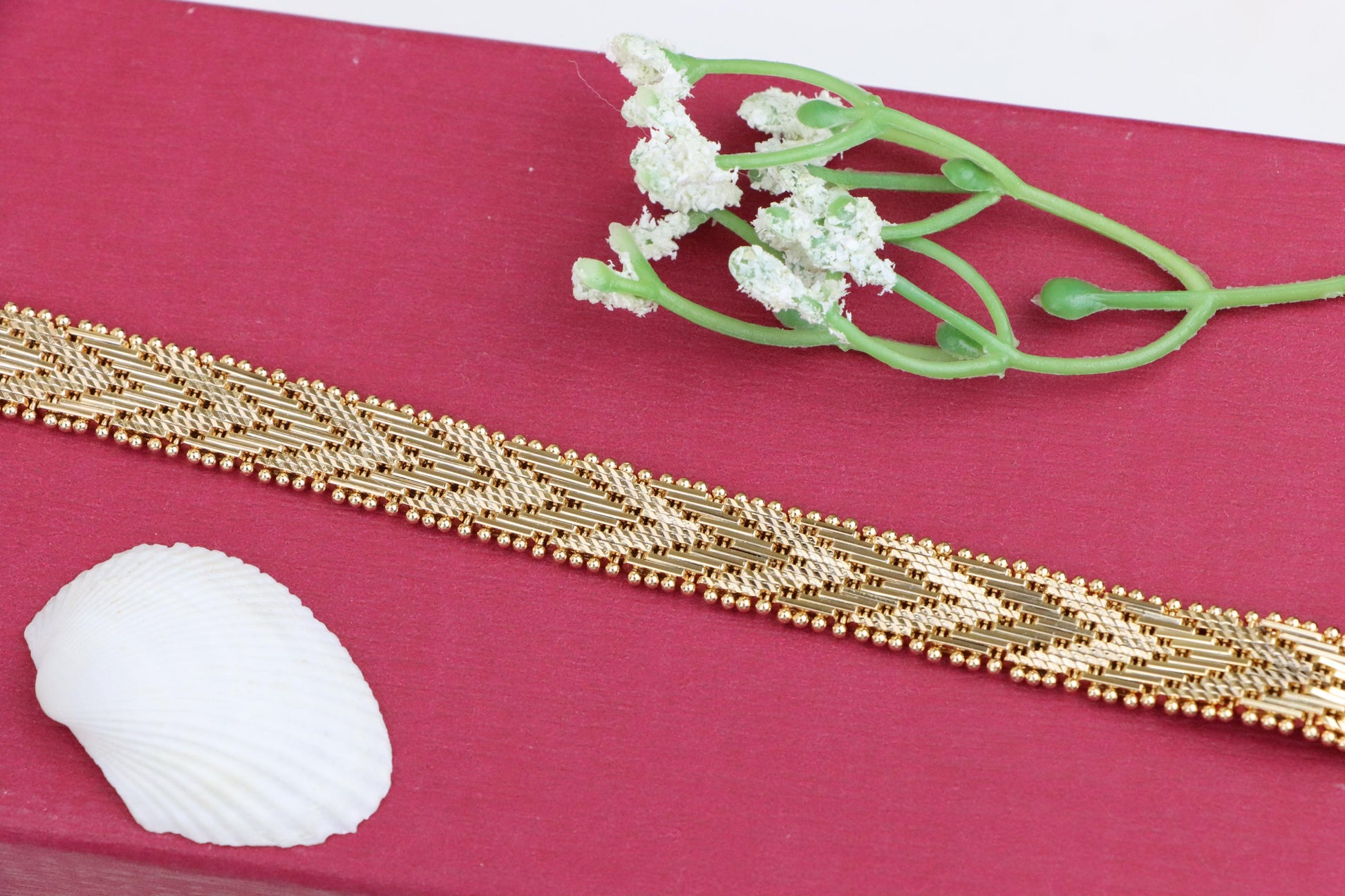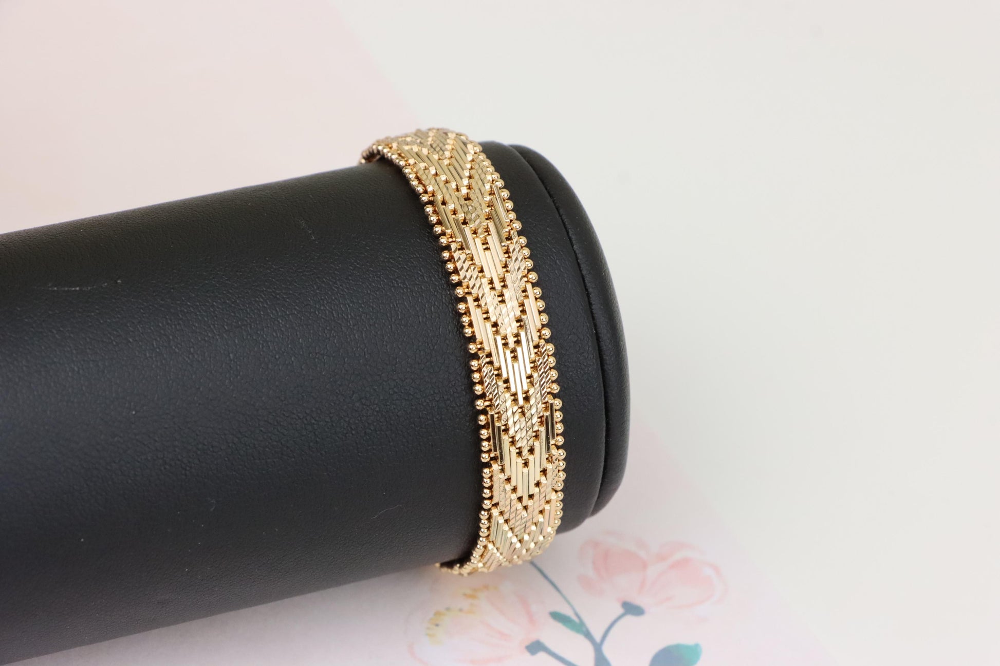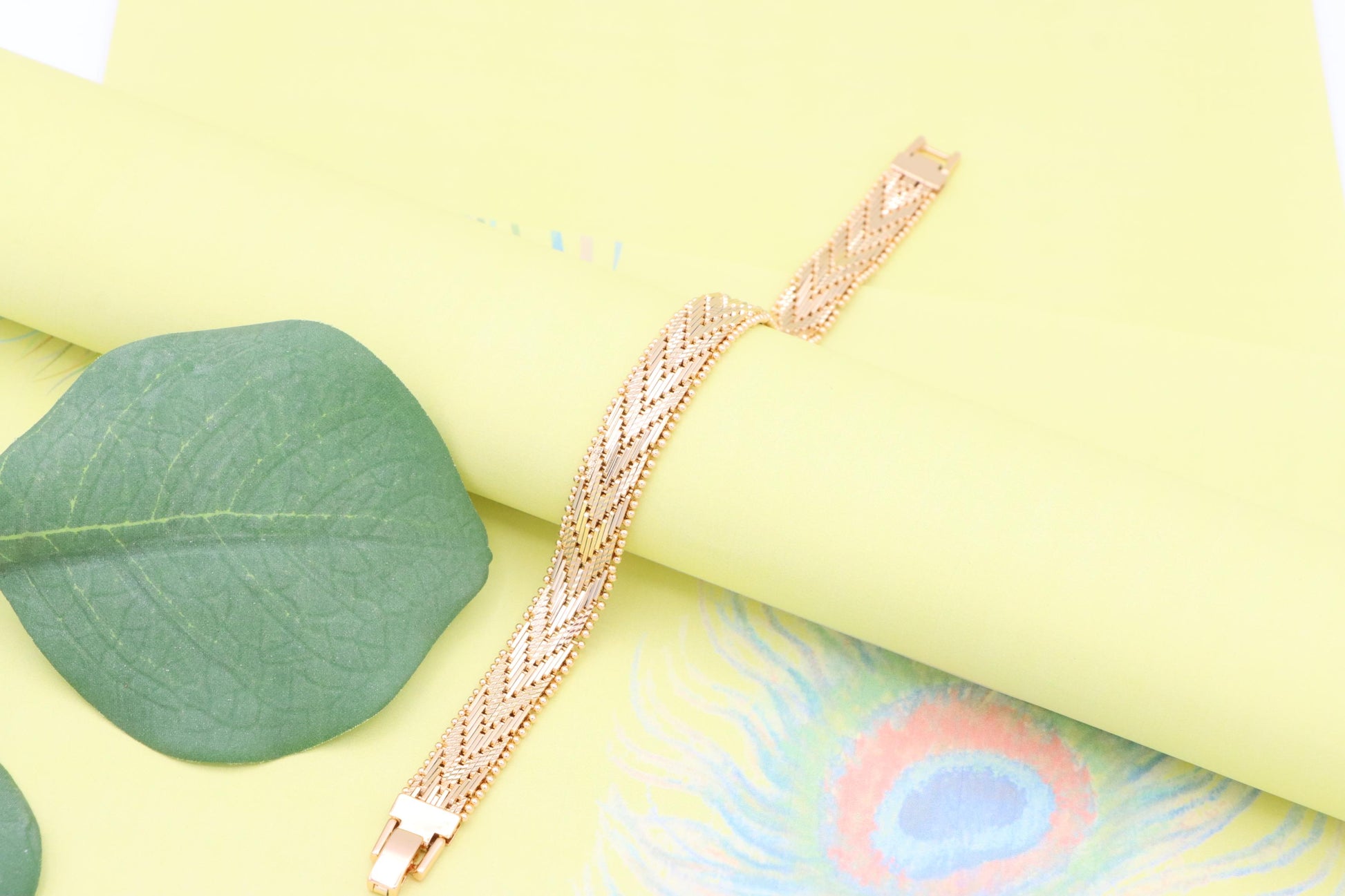 Elegant and finely crafted, this rose gold bracelet features a woven design highlighted with intricate beaded edges. A timeless accessory that adds a touch of sophistication to any outfit.