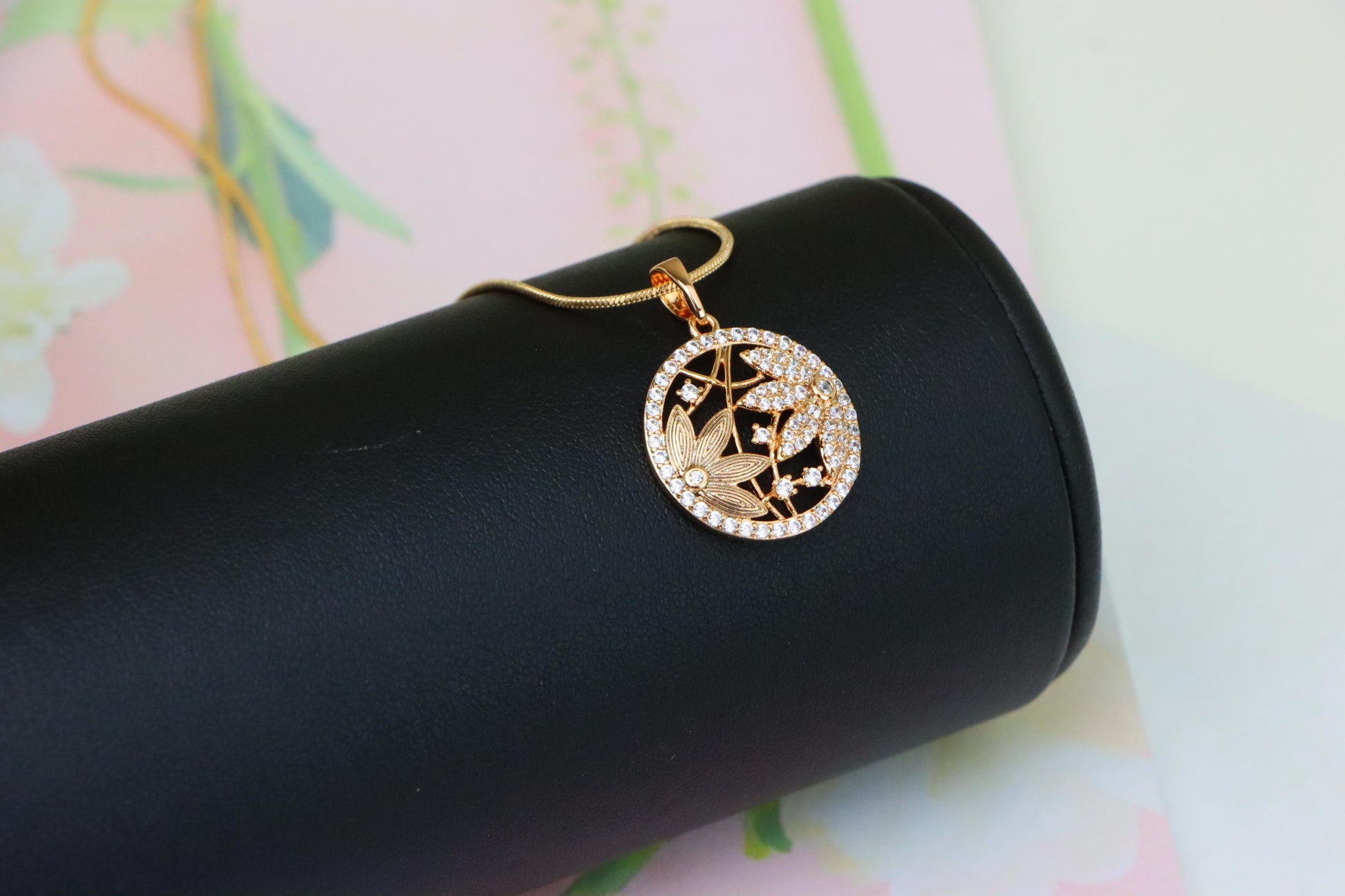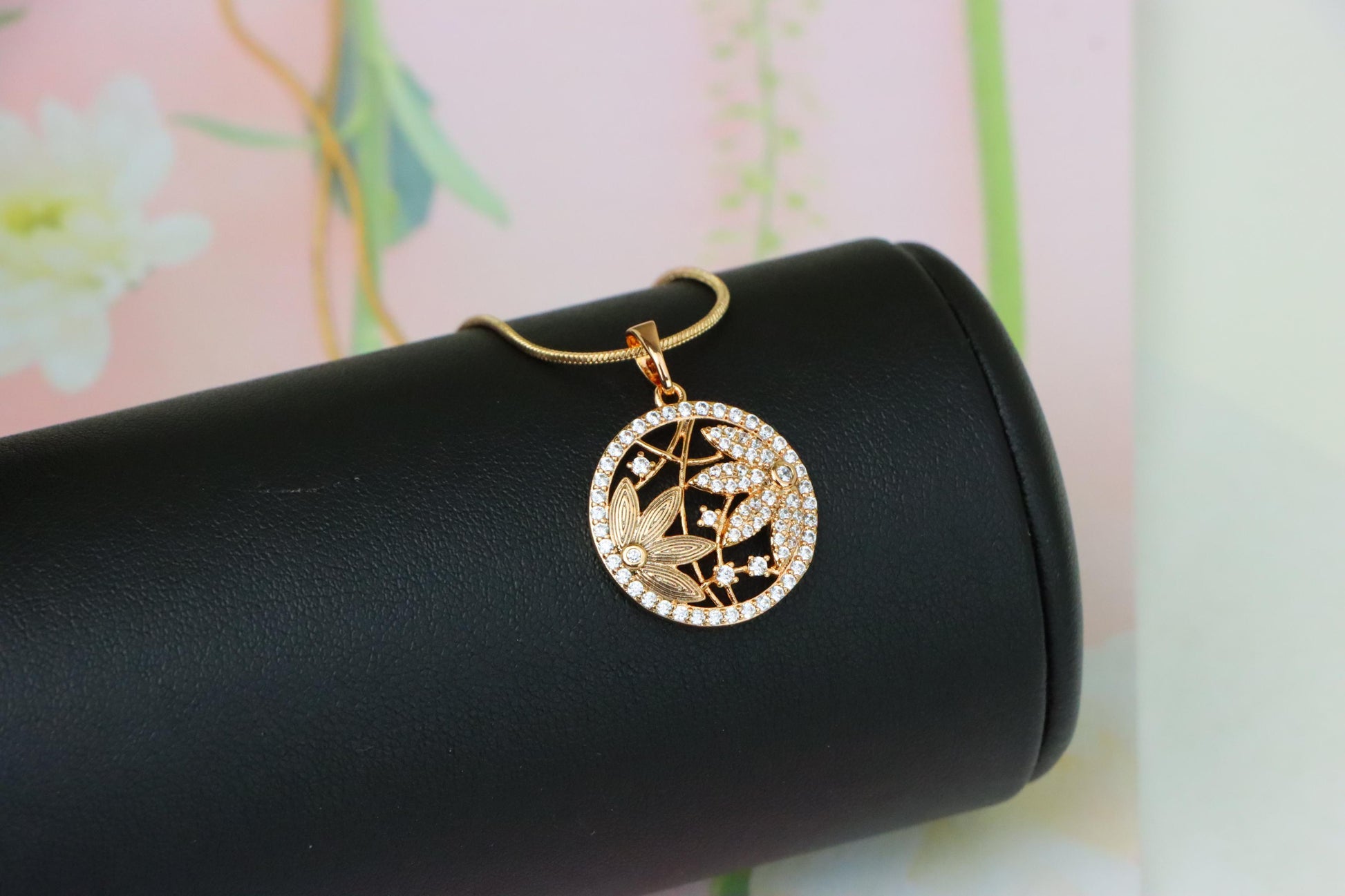 Beautifully crafted round pendant with a floral motif and sparkling stones.