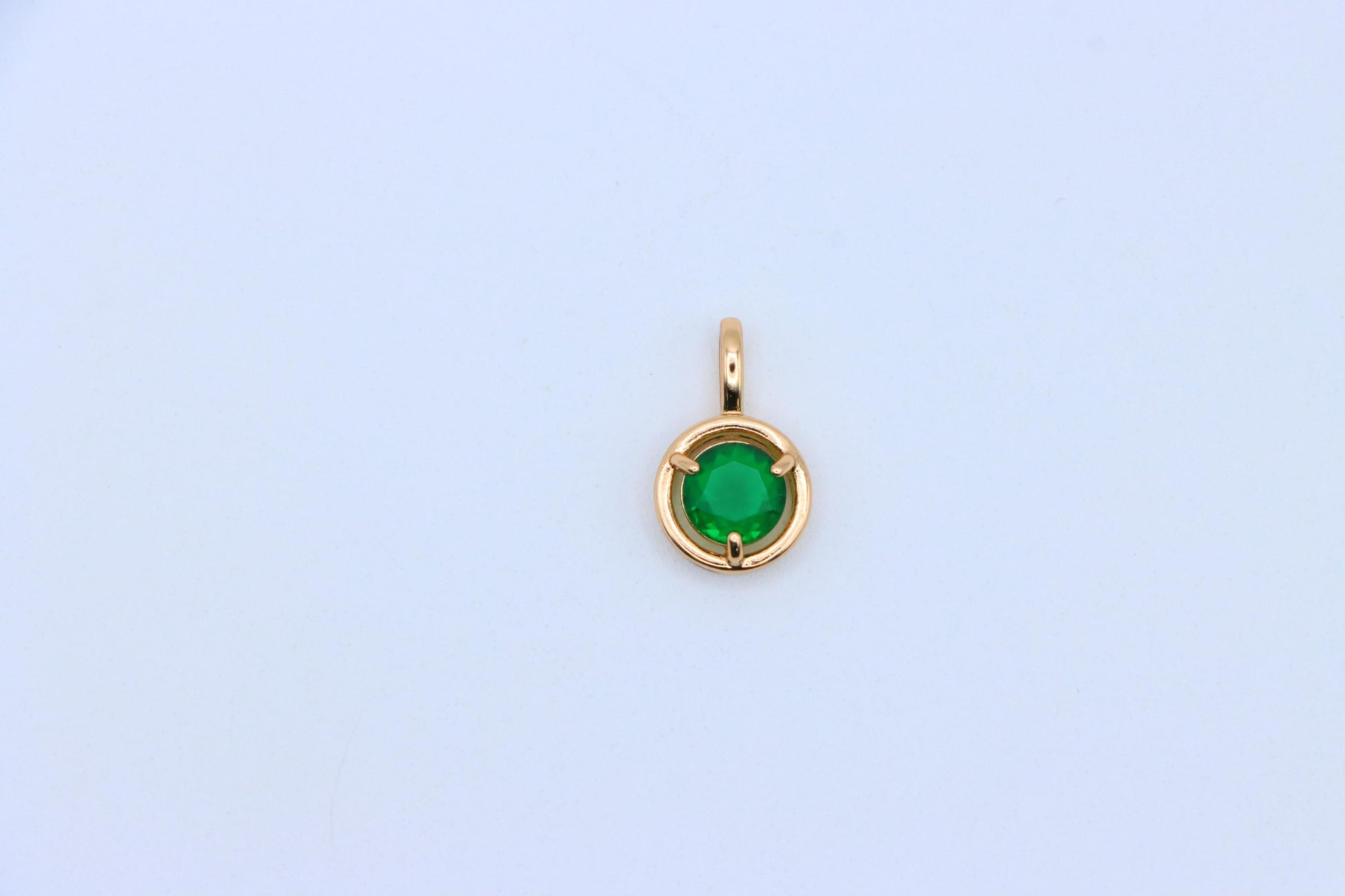 Timeless green charm pendant with round stone in open gold bezel frame.
