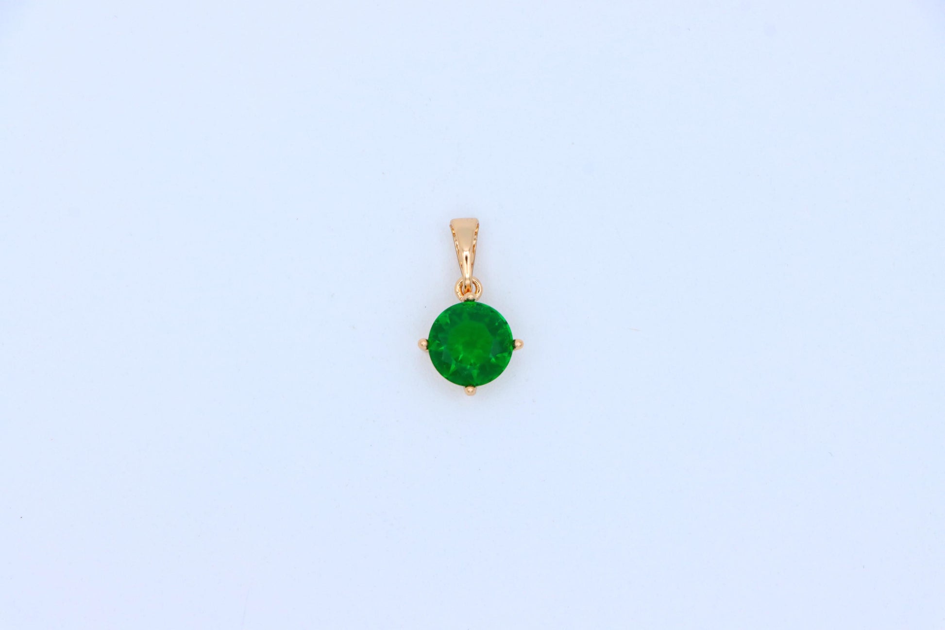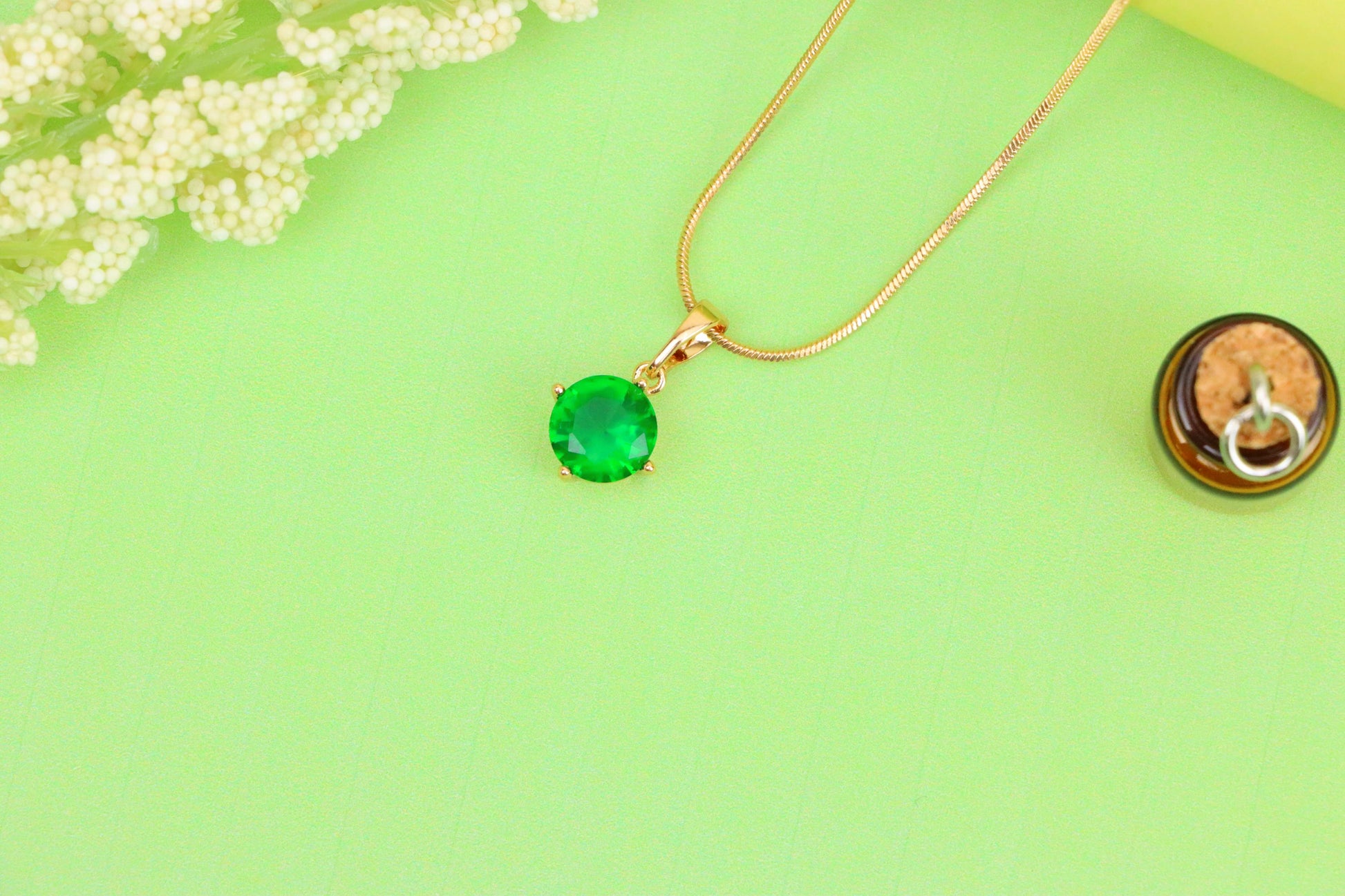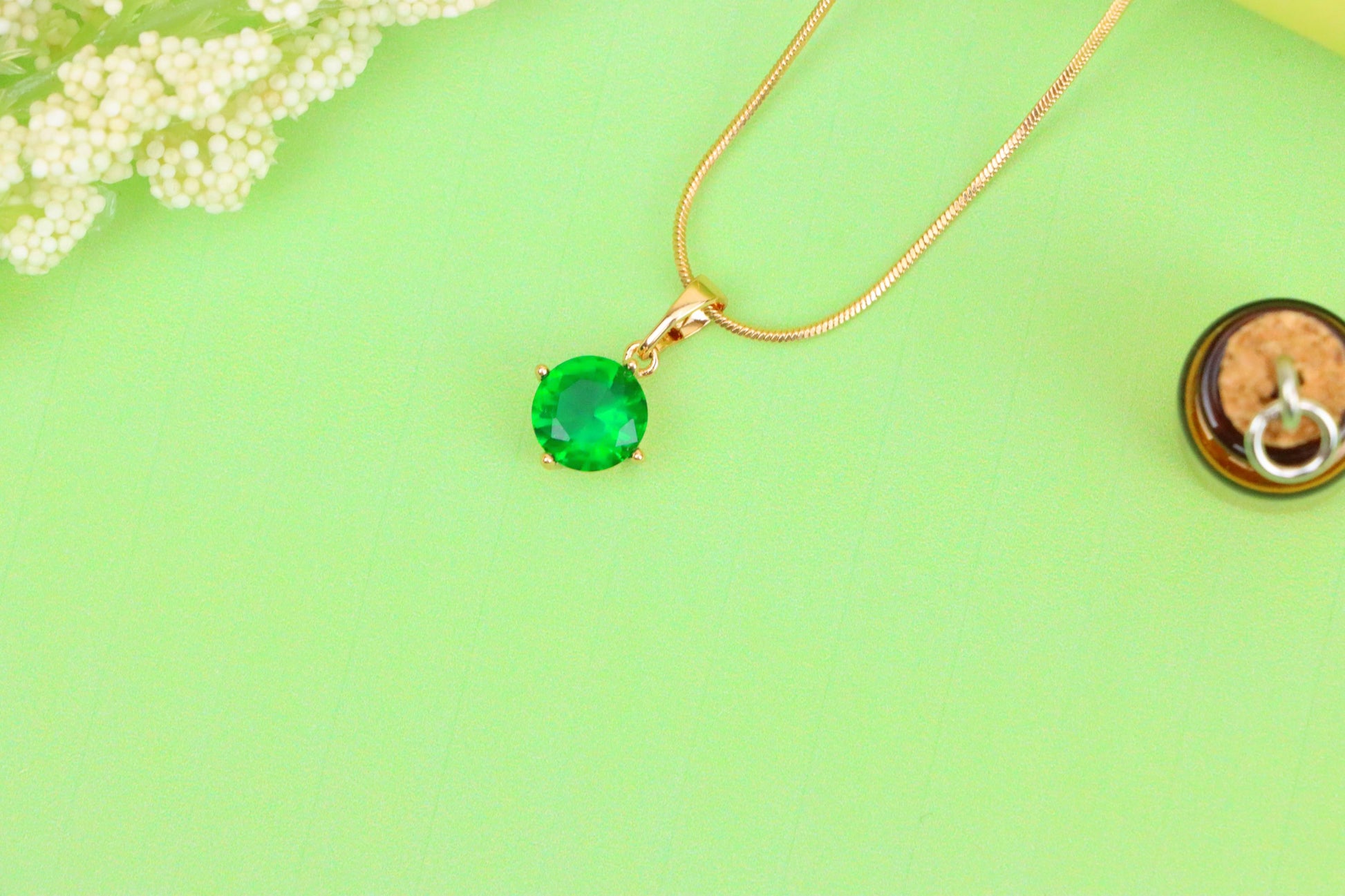 This vibrant pendant showcases a rich green round stone set in a rose gold frame, perfect for adding a fresh pop of color to any look. Simple, stylish, and versatile.
