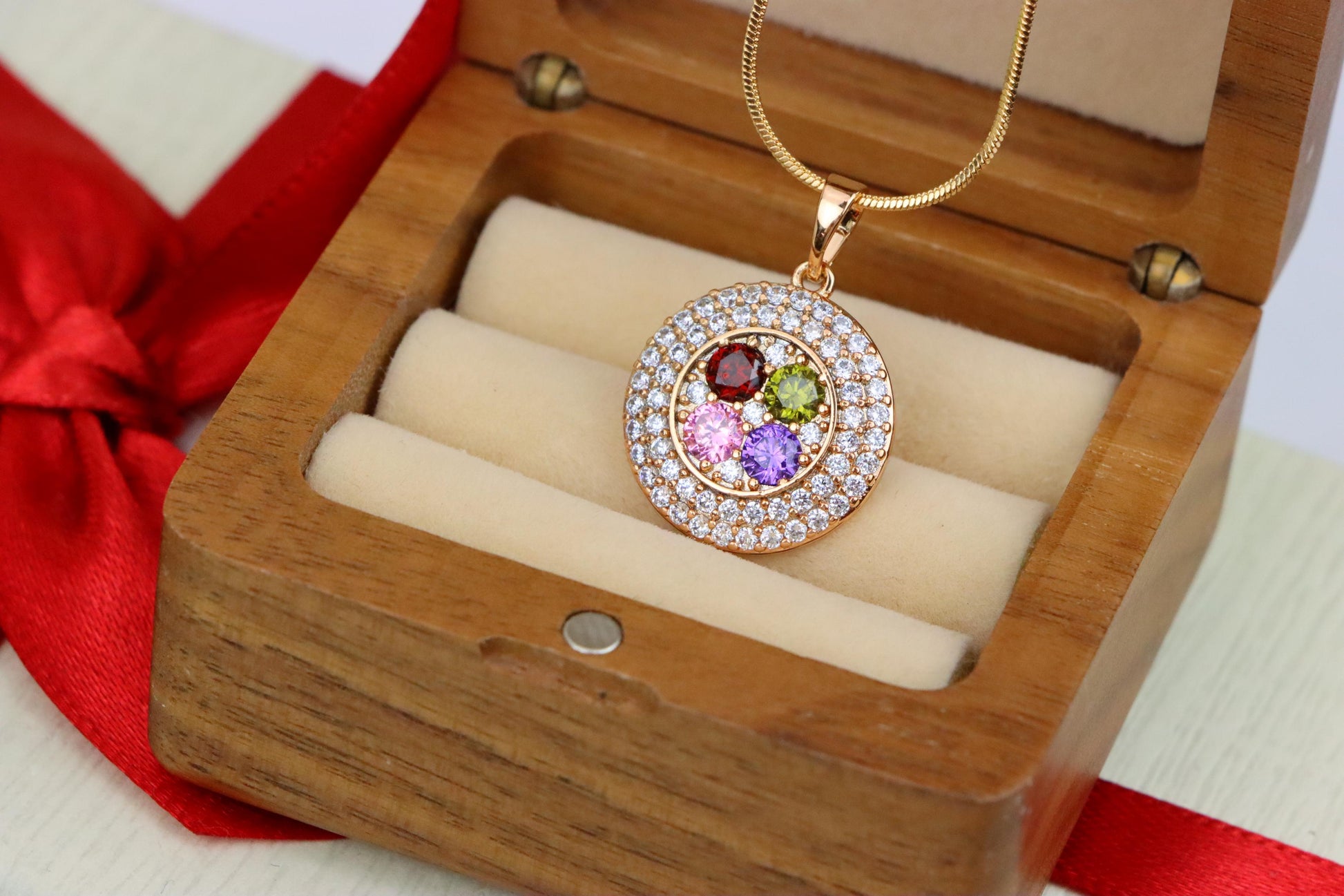 ✔️ Embedded with red, green, pink, and purple cubic zirconia