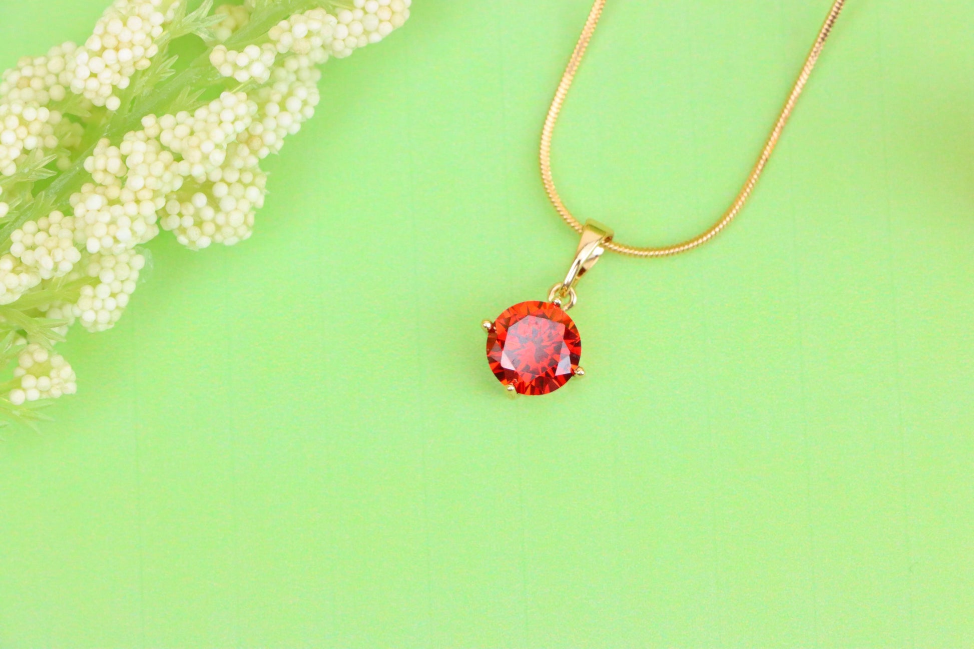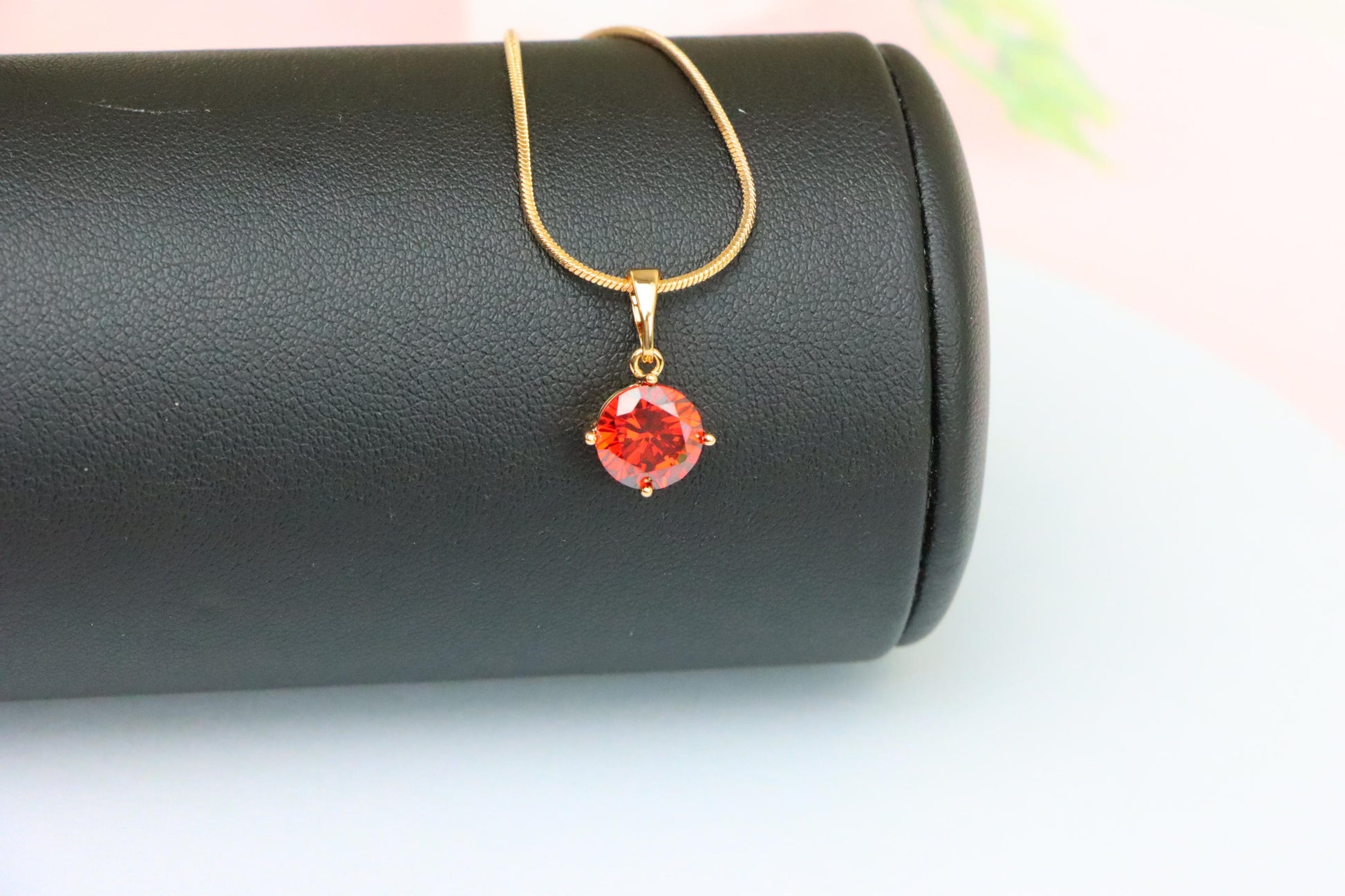 Bright and bold, this round red stone pendant is set in a sleek rose gold frame, offering a perfect mix of fire and elegance. A vibrant touch for daily wear or a special occasion.