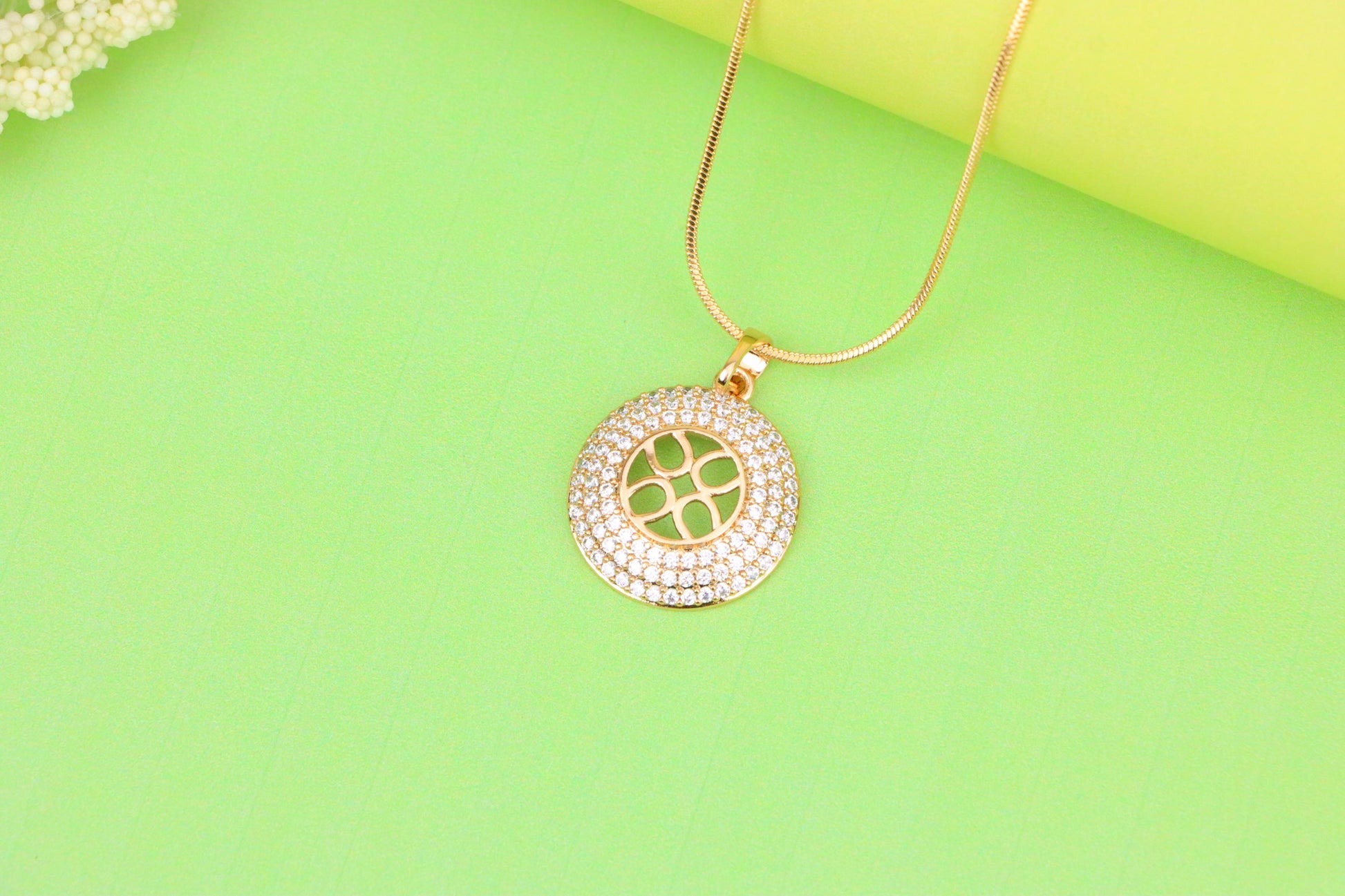 A sophisticated round pendant showcasing a shimmering pave CZ border and intricate center cut-out, perfect for adding a refined sparkle to any outfit.