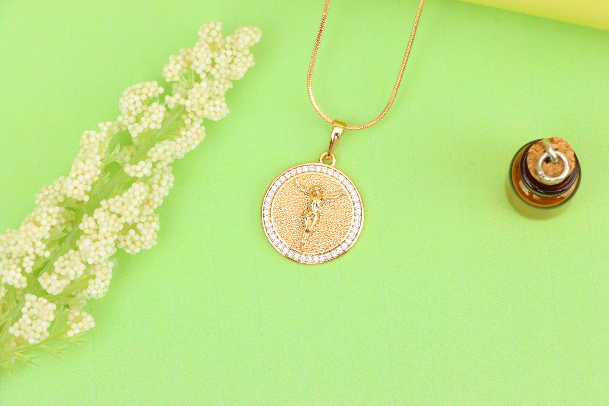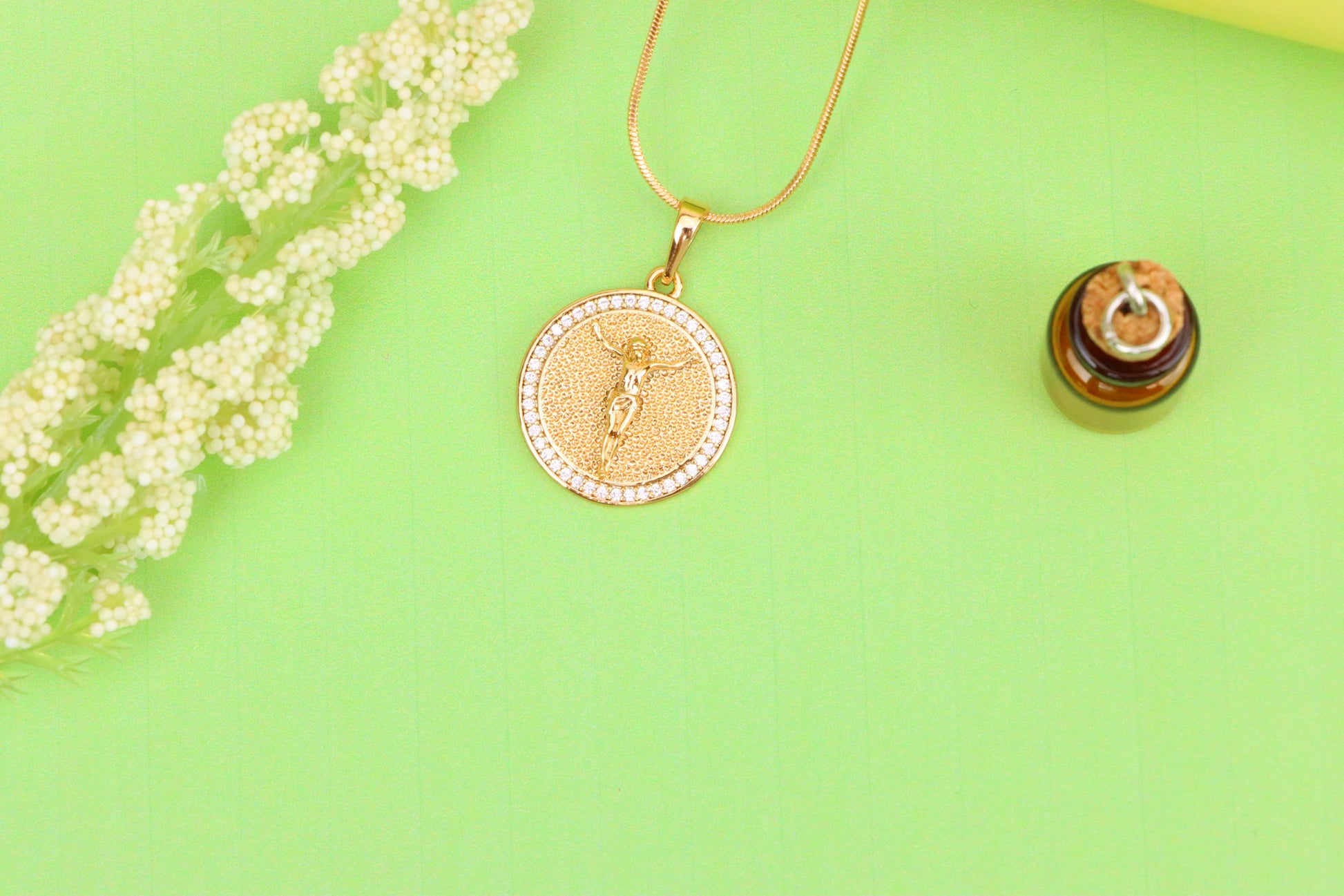 Beautifully crafted rose gold pendant featuring a raised Jesus design encircled by sparkling crystals.