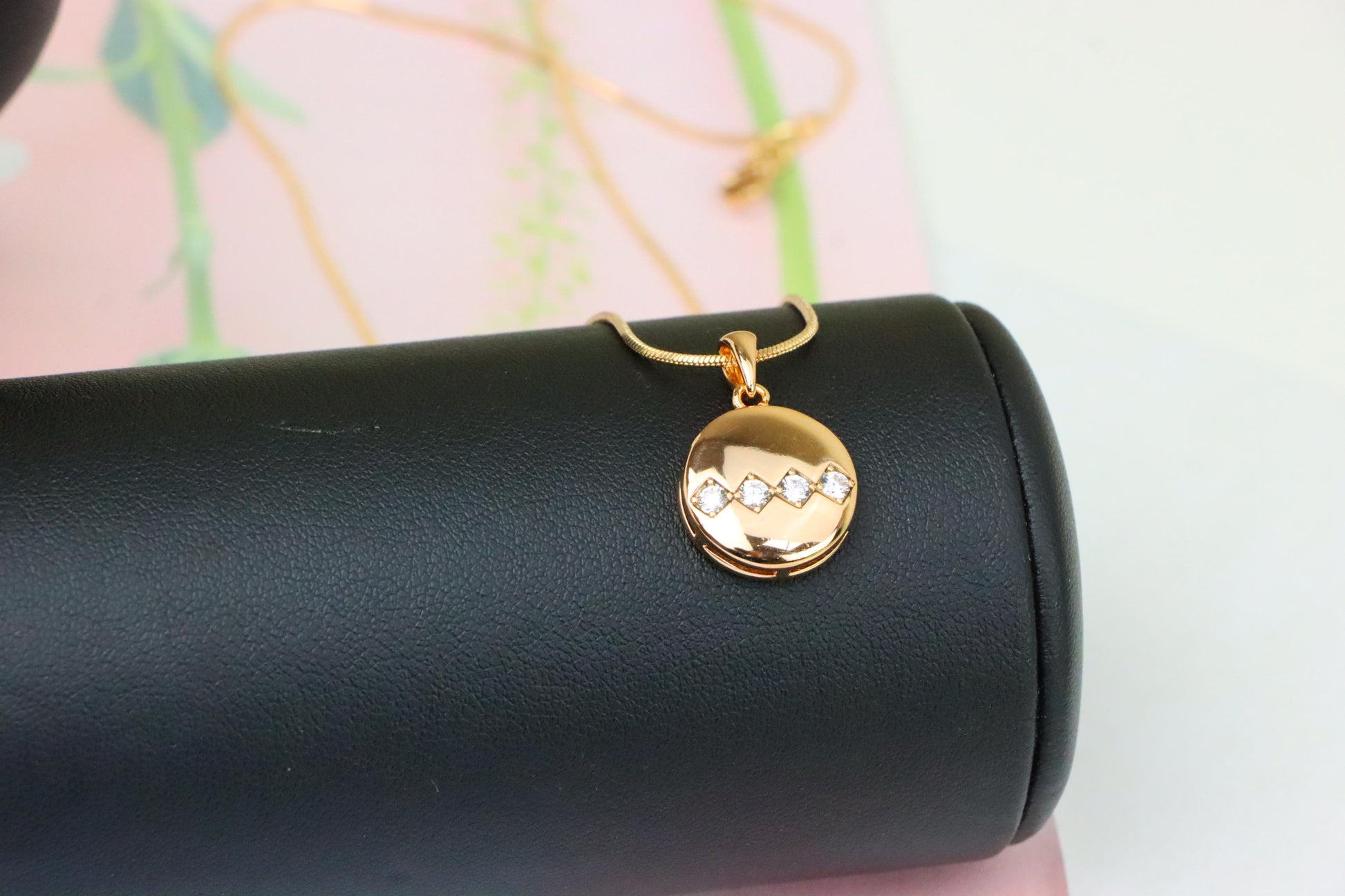 Elegant circular pendant featuring a zigzag line of sparkling stones.
