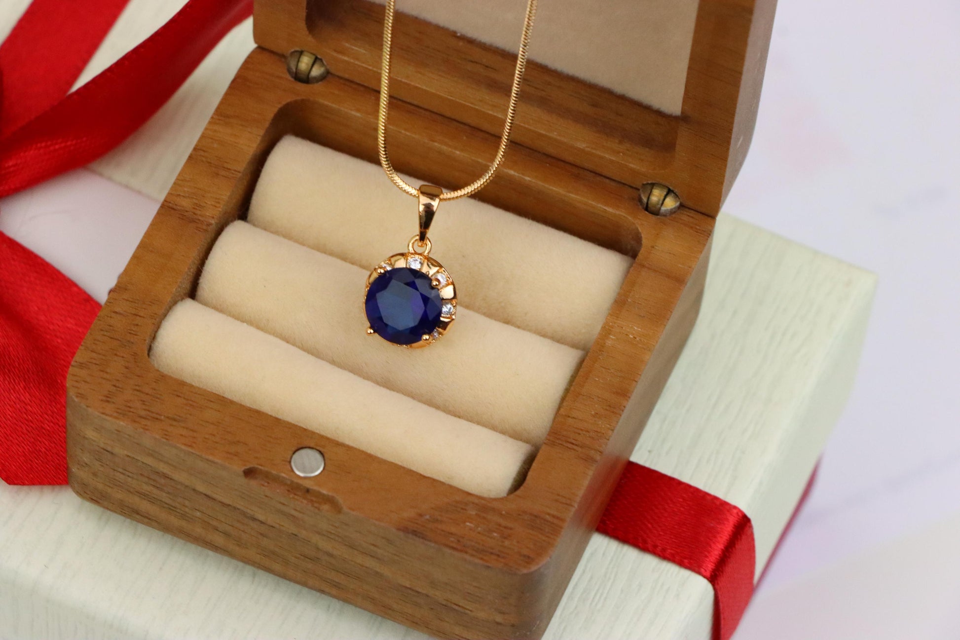 This deep blue pendant, encased in a dazzling gold setting, brings elegance and charm to any outfit.
