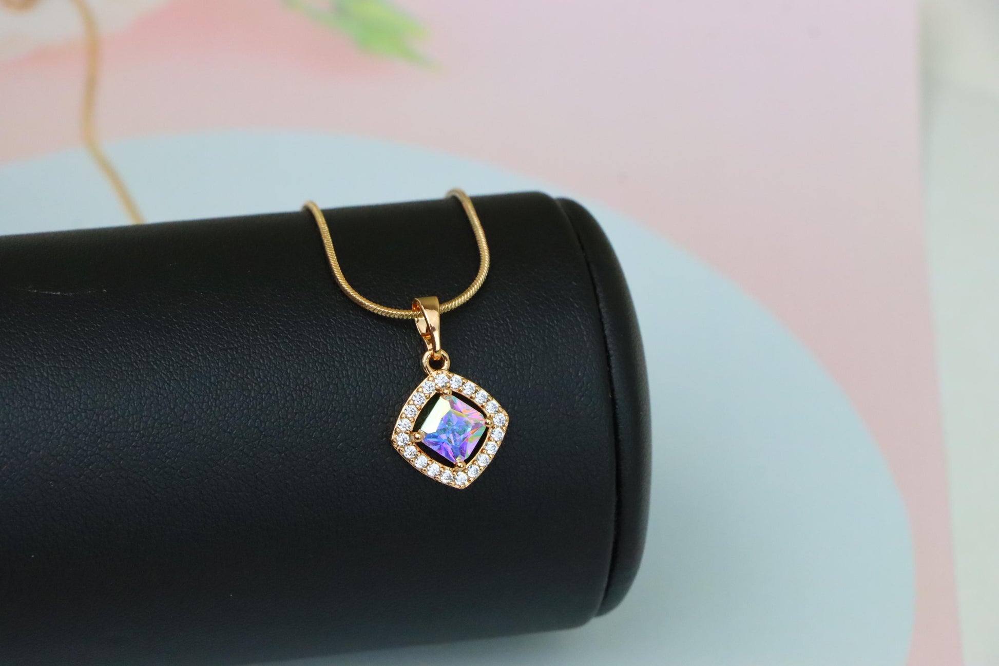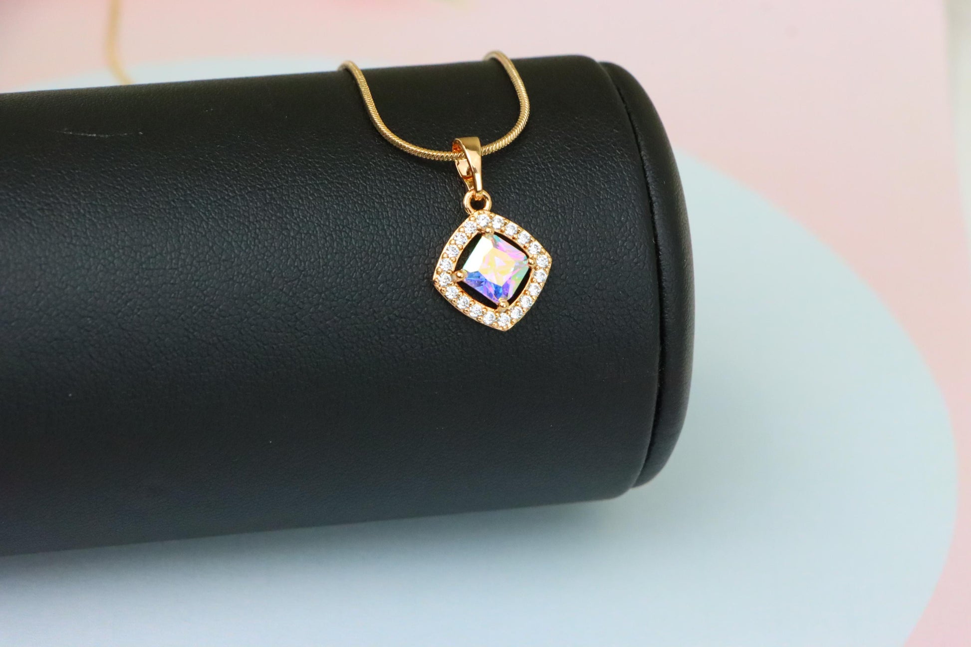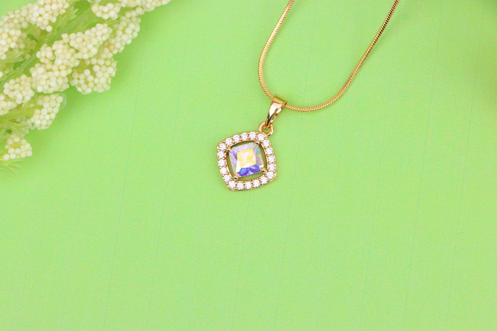 Elegant satin white pendant featuring a princess-cut center stone with an iridescent shimmer, framed by sparkling crystals. Made with gold plated over high quality brass.