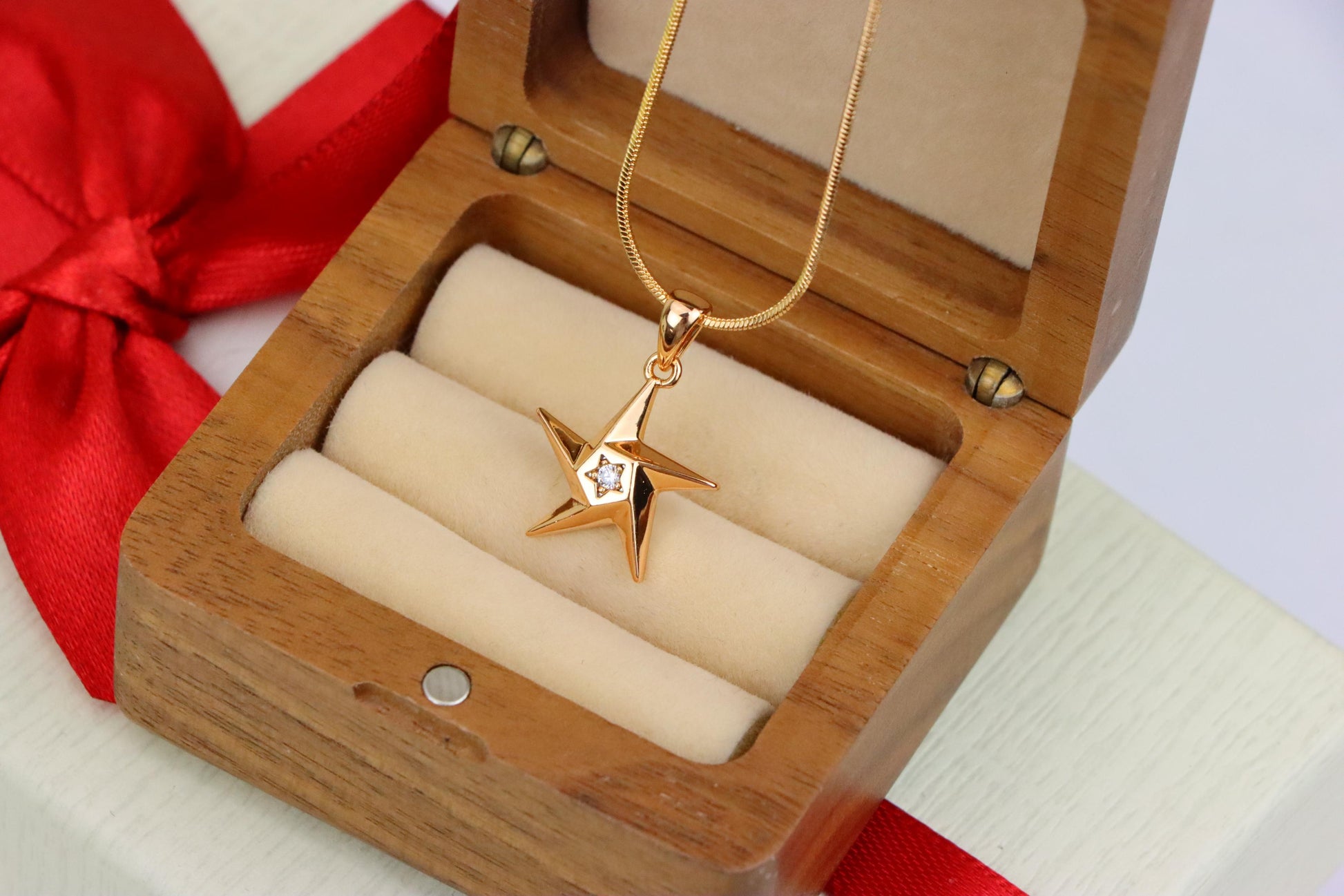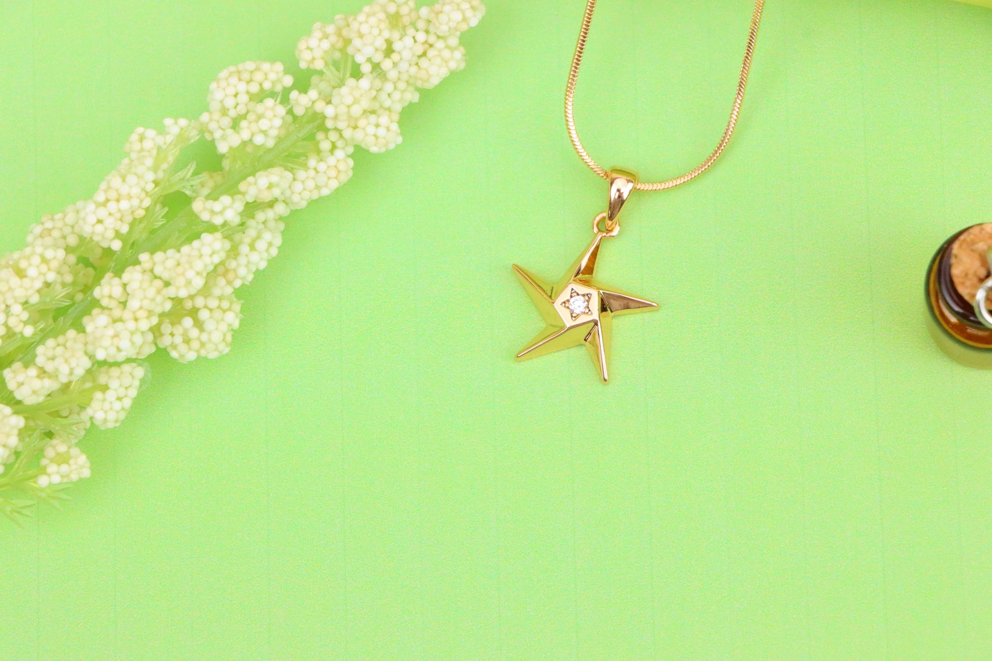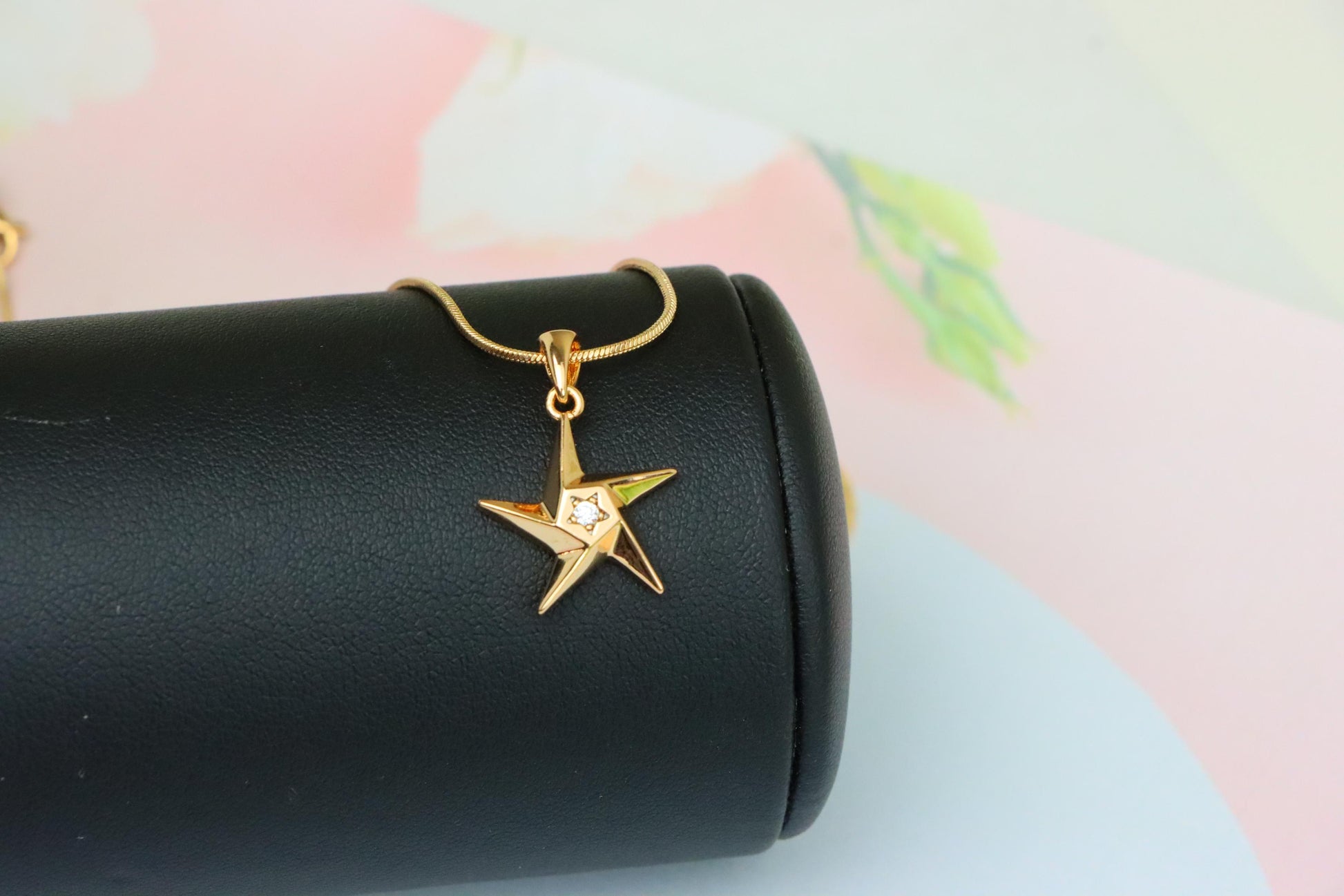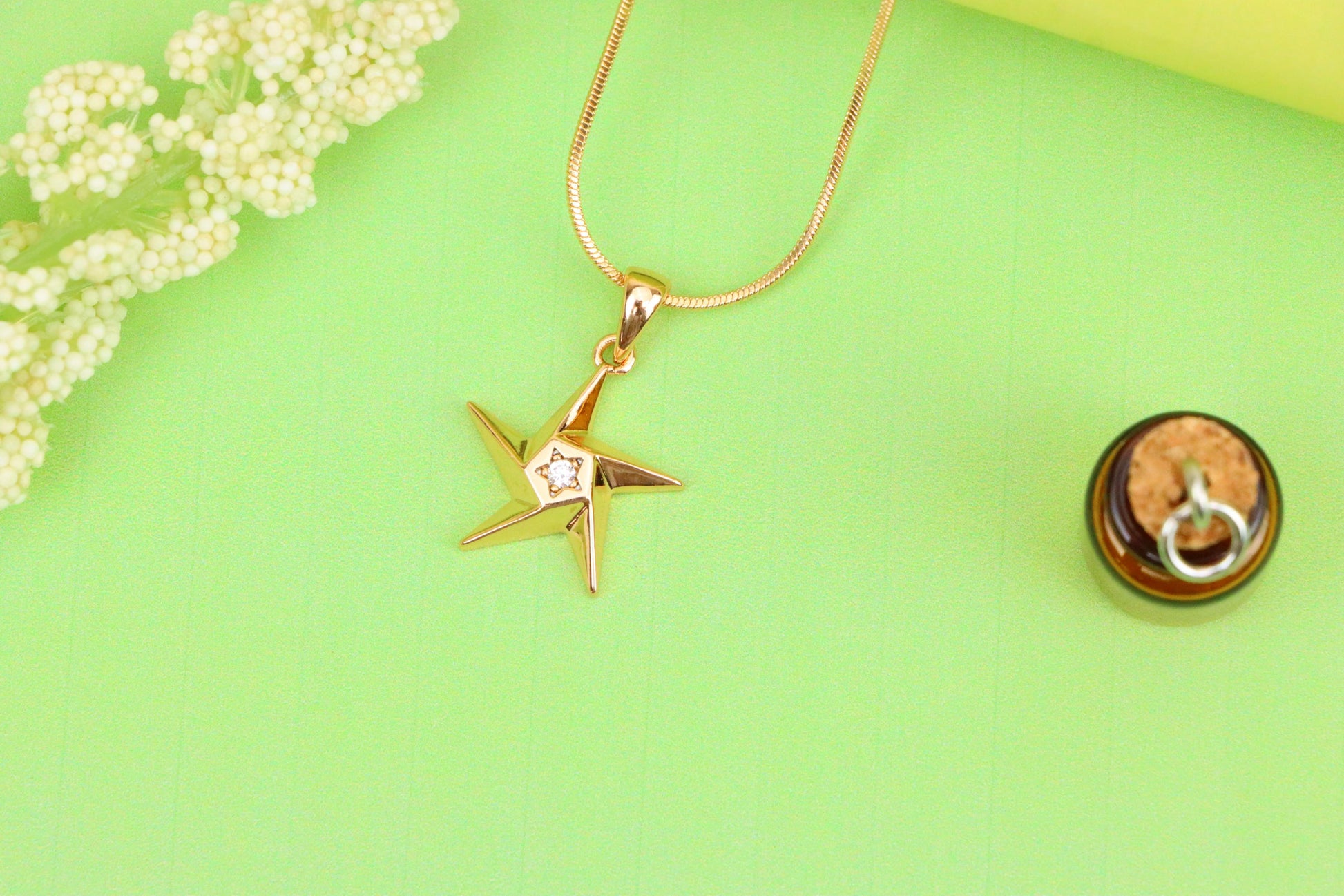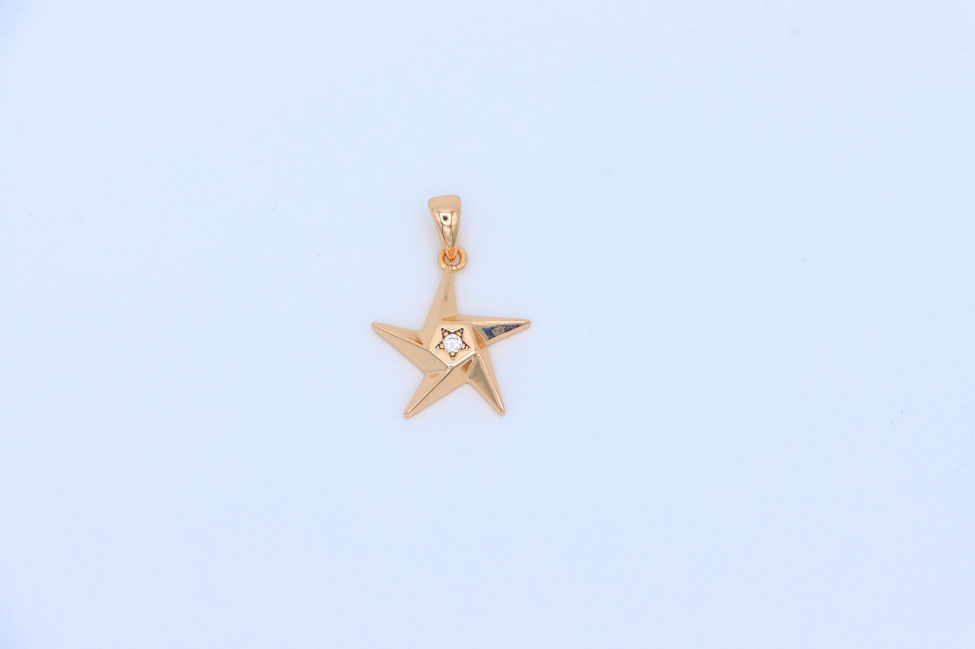 A charming star-shaped pendant with a radiant surface and a delicate crystal in the center, ideal for adding a touch of celestial style to your look.