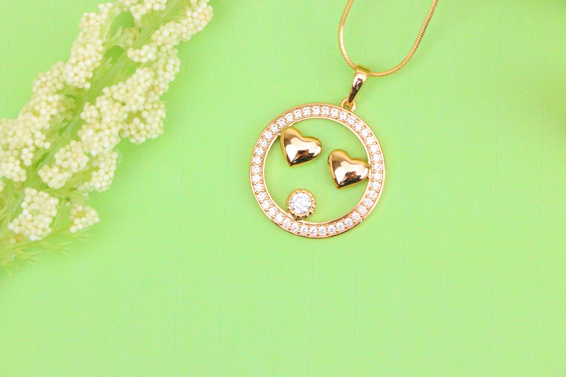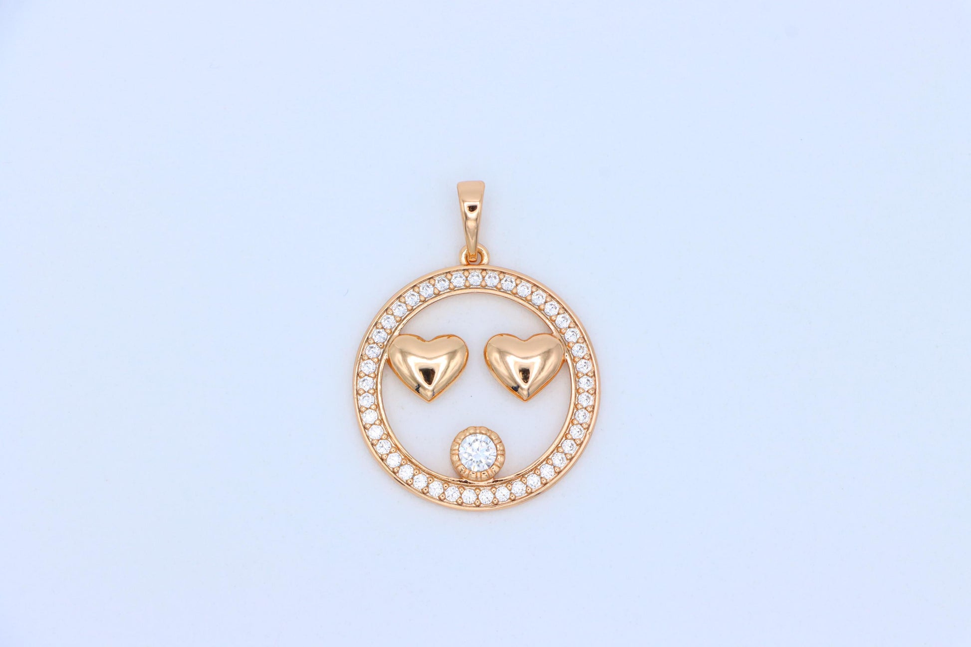 Playful yet elegant smiley face pendant with heart-shaped eyes and dazzling stones.