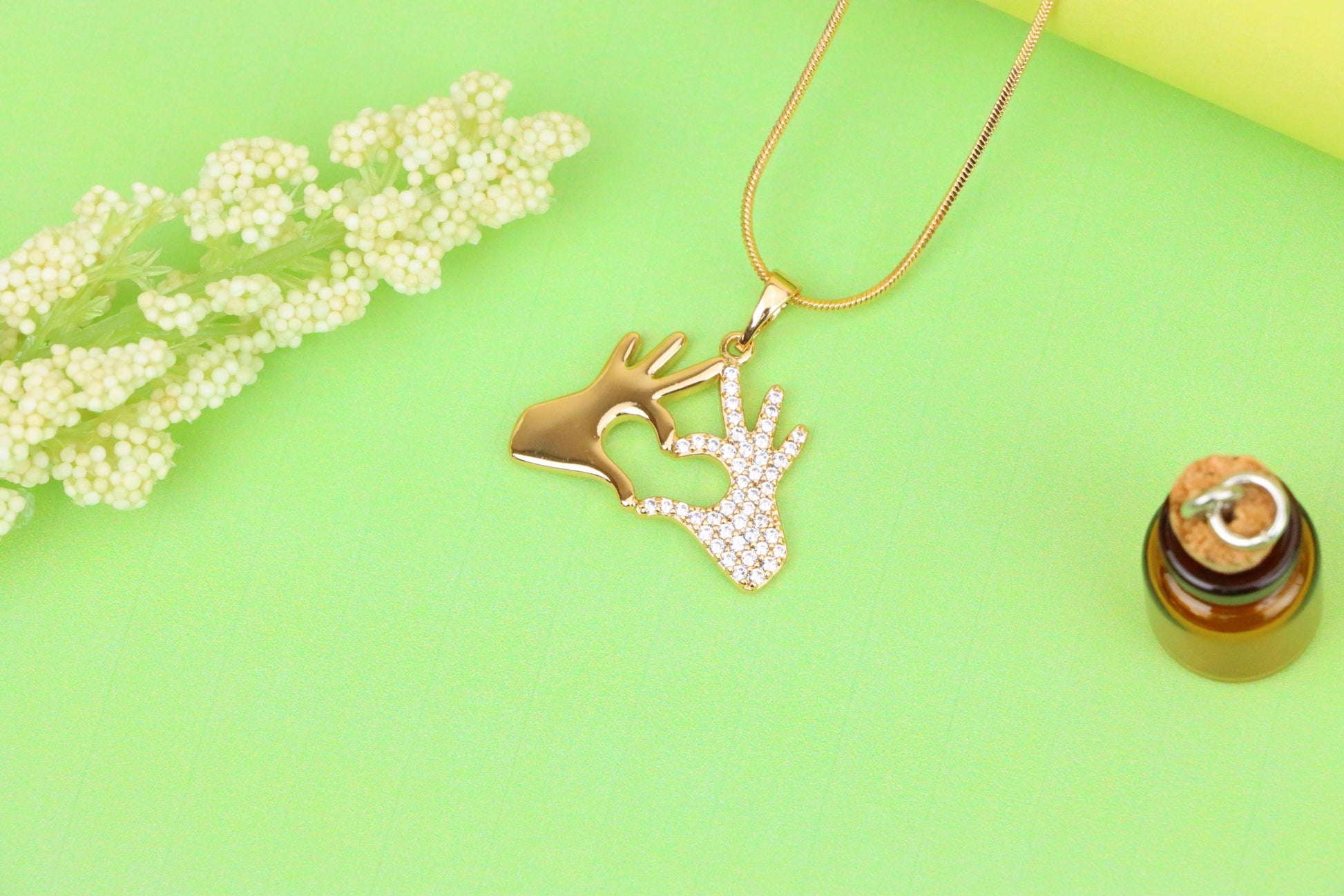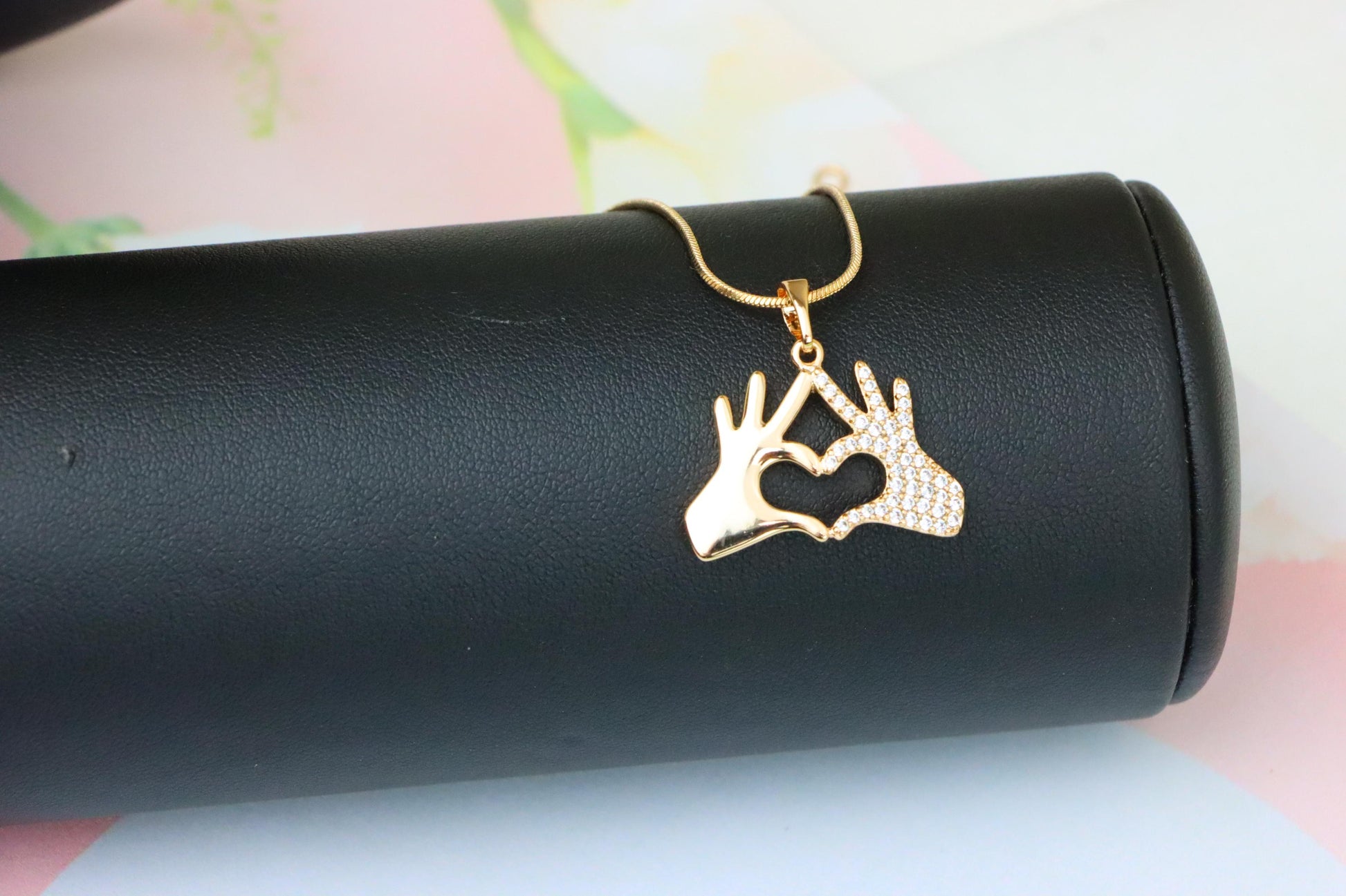 Elegant rose gold pendant featuring two hands forming a heart, symbolizing love and connection with a sparkling twist.