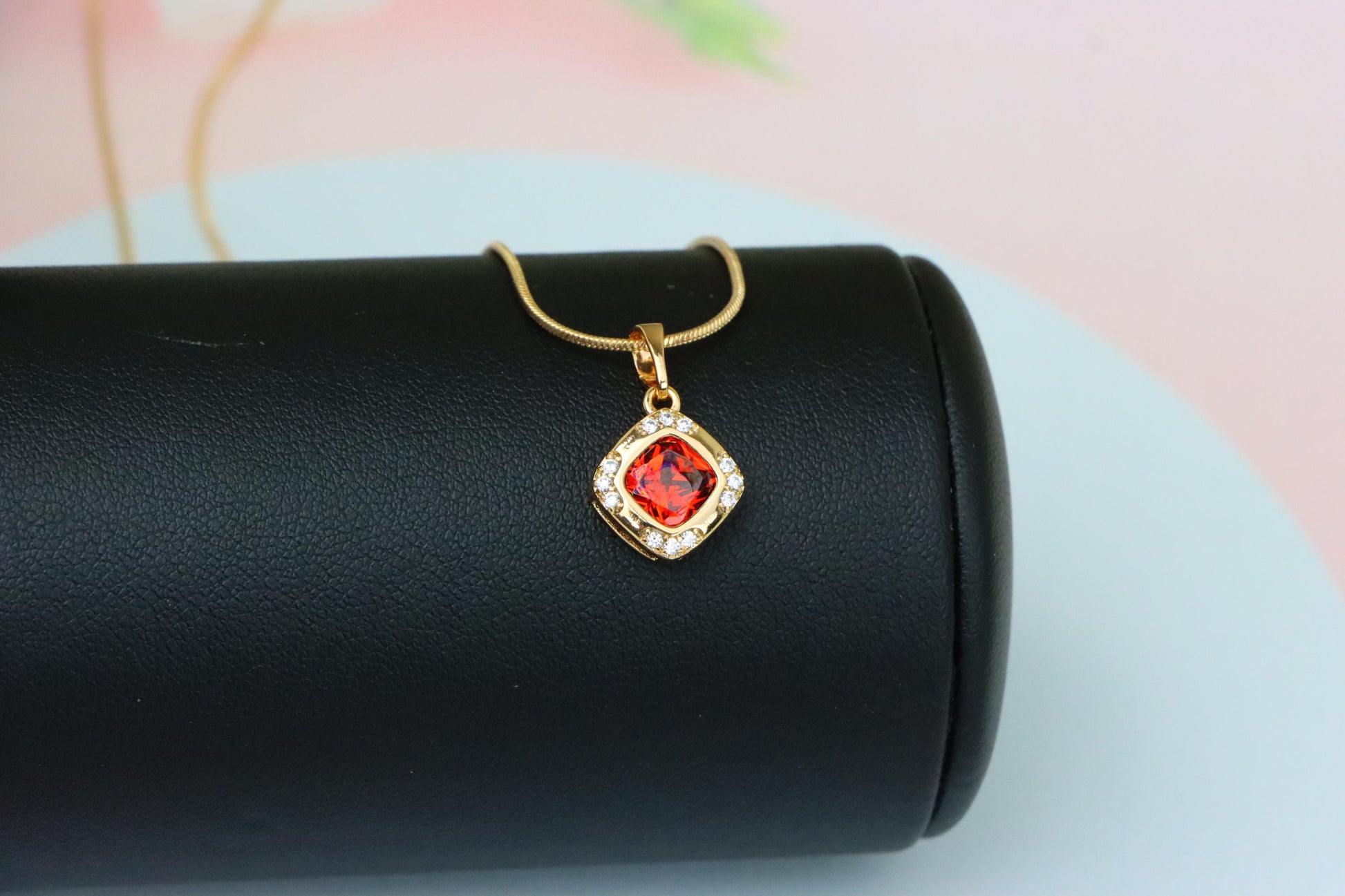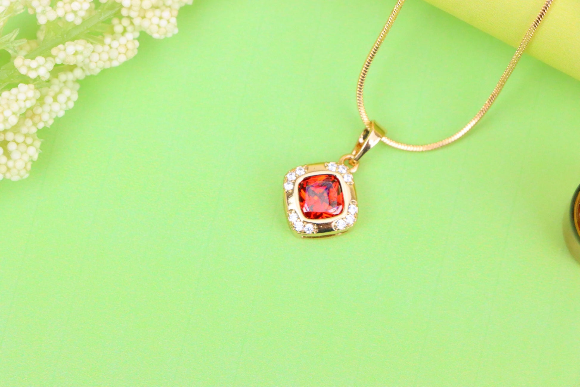 Elegant red pendant featuring a cushion-cut stone framed by crystals. Crafted from gold-plated high quality brass for a rich, radiant finish.