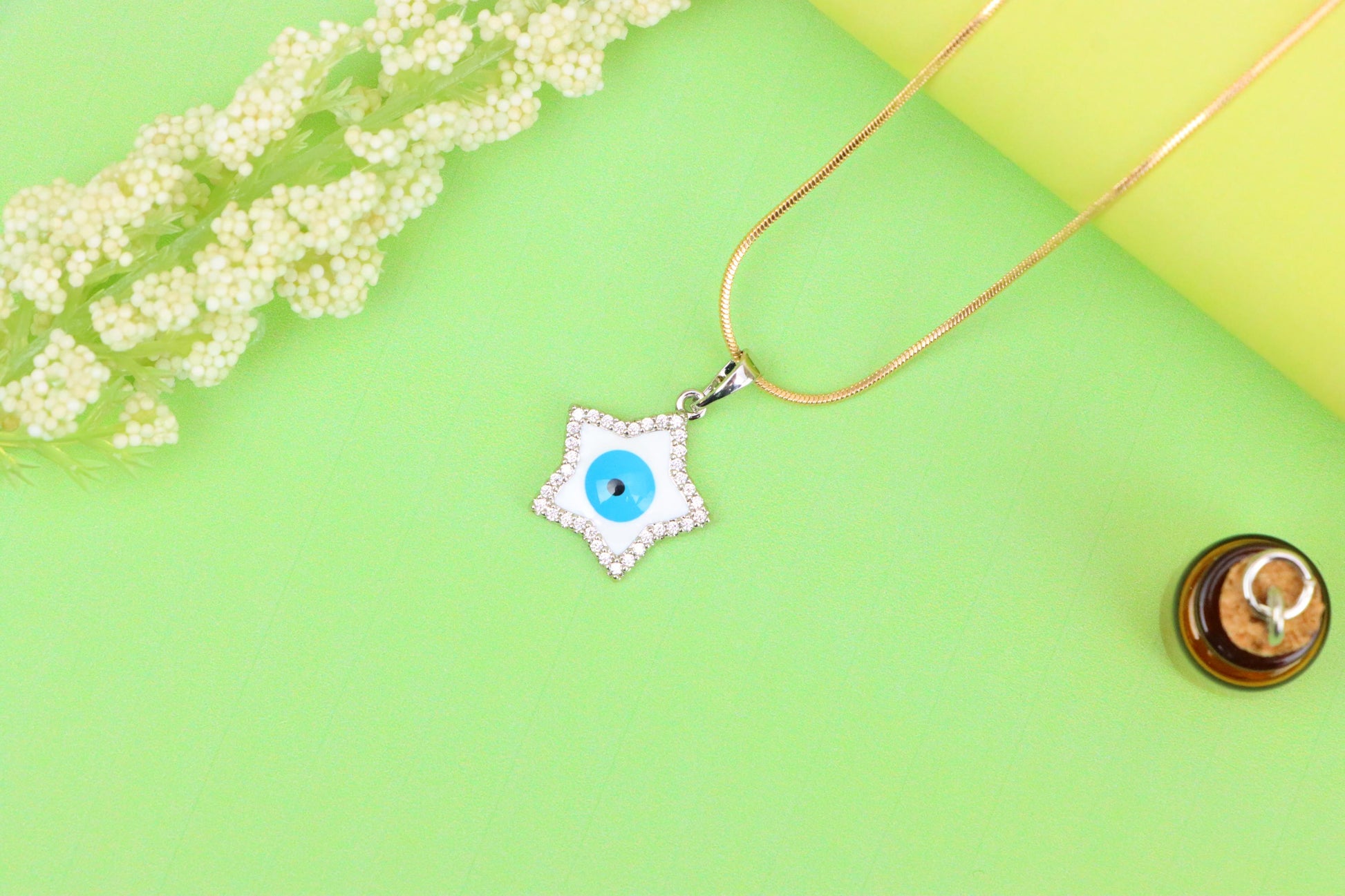 Protective yet stylish, this star-shaped evil eye pendant features a sparkling CZ outline and vibrant center, crafted in gold-plated high-quality brass.