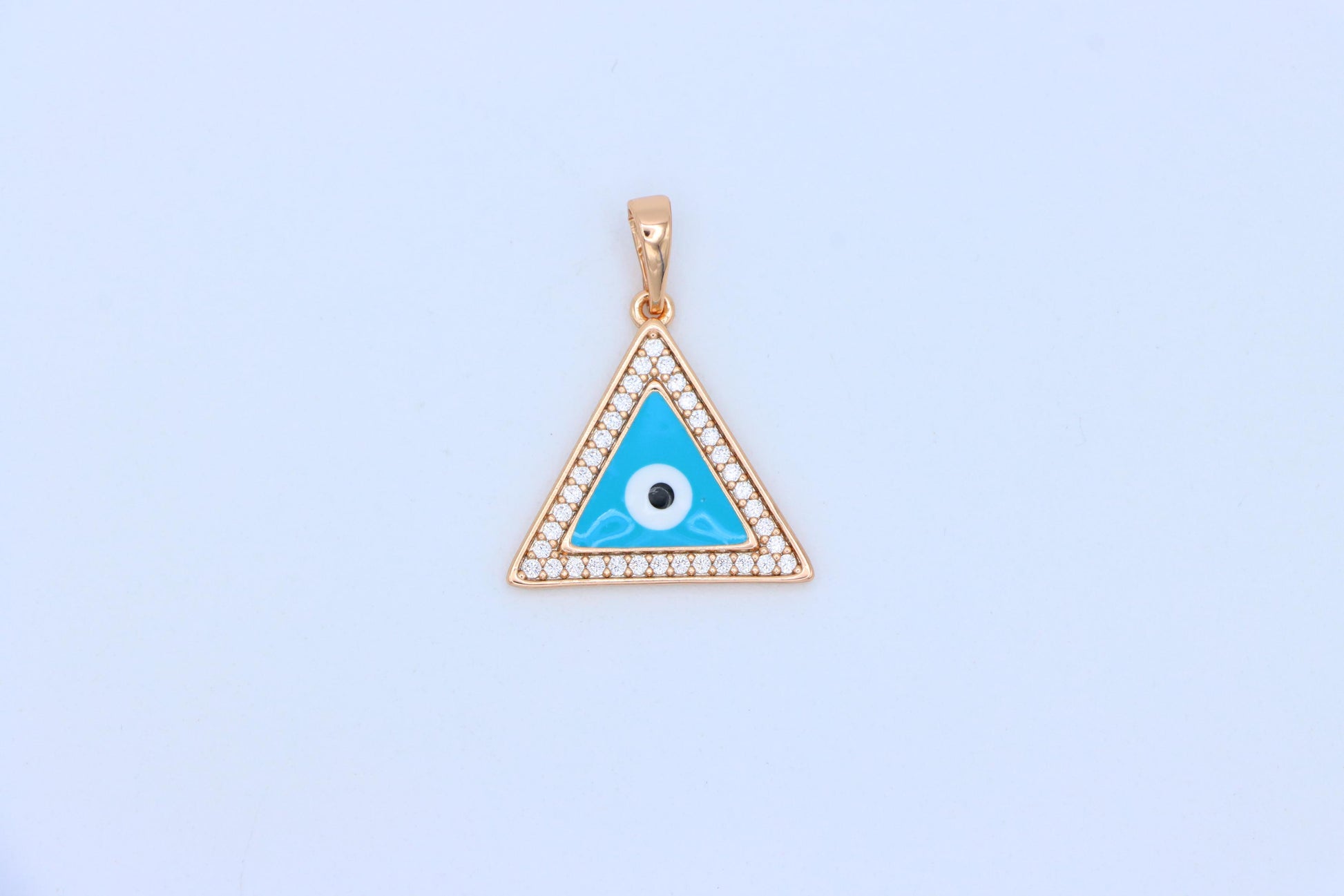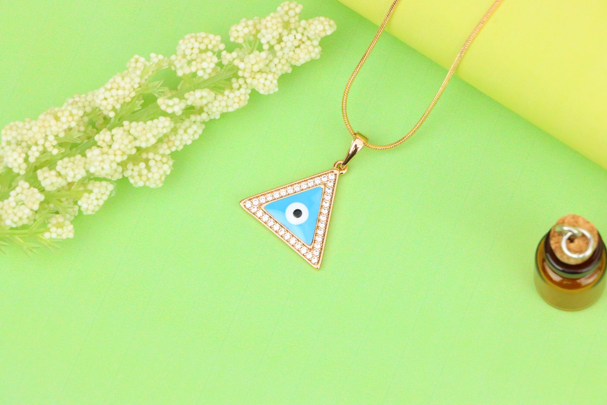 Add a bold yet meaningful touch to your look with this triangle-shaped rose gold pendant featuring a turquoise evil eye centerpiece.