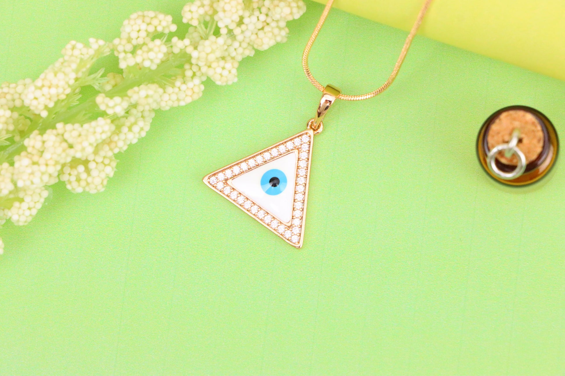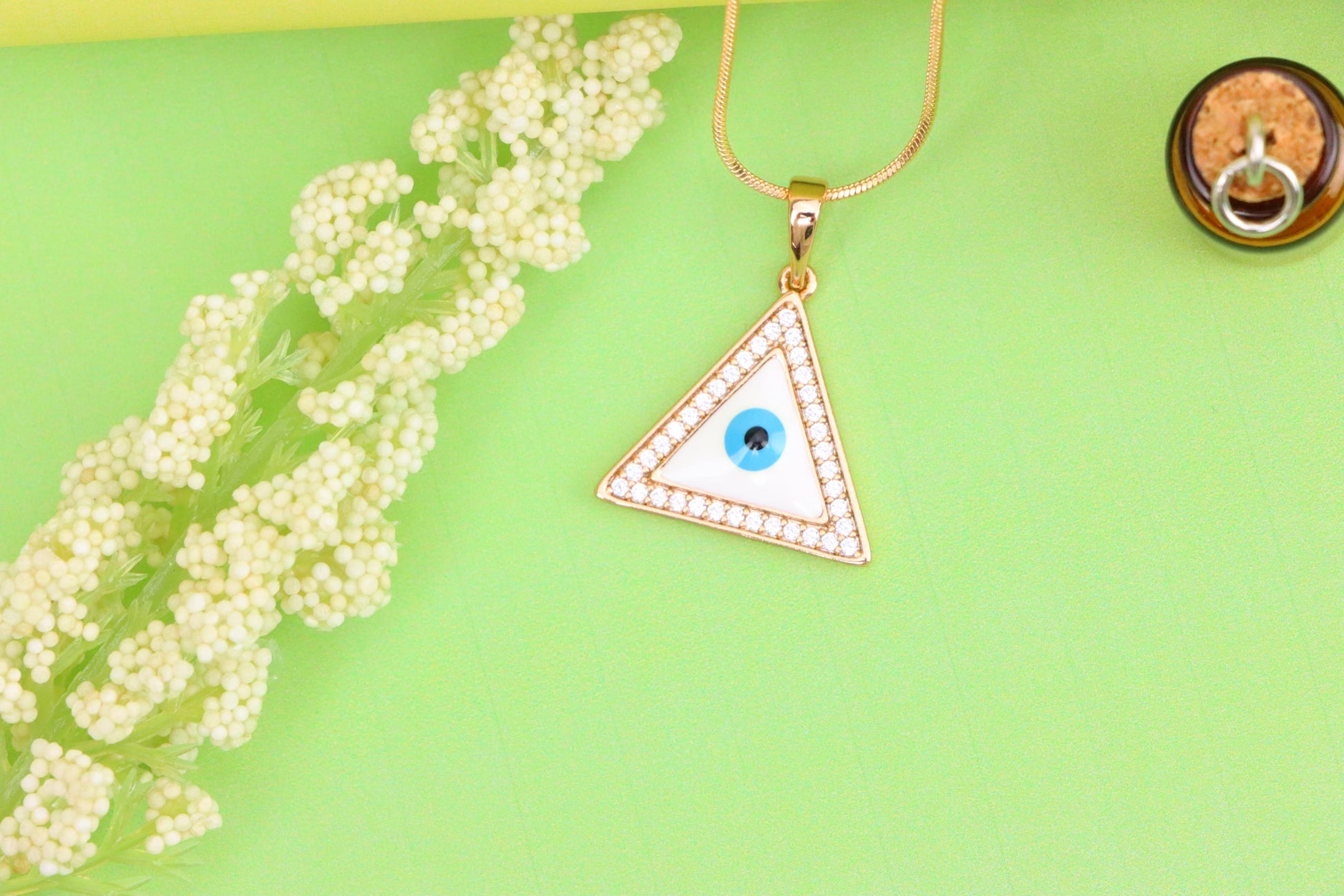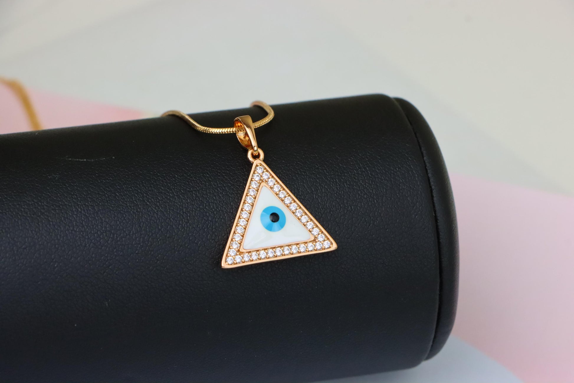 A symbolic evil eye charm in a striking triangle design for bold style.