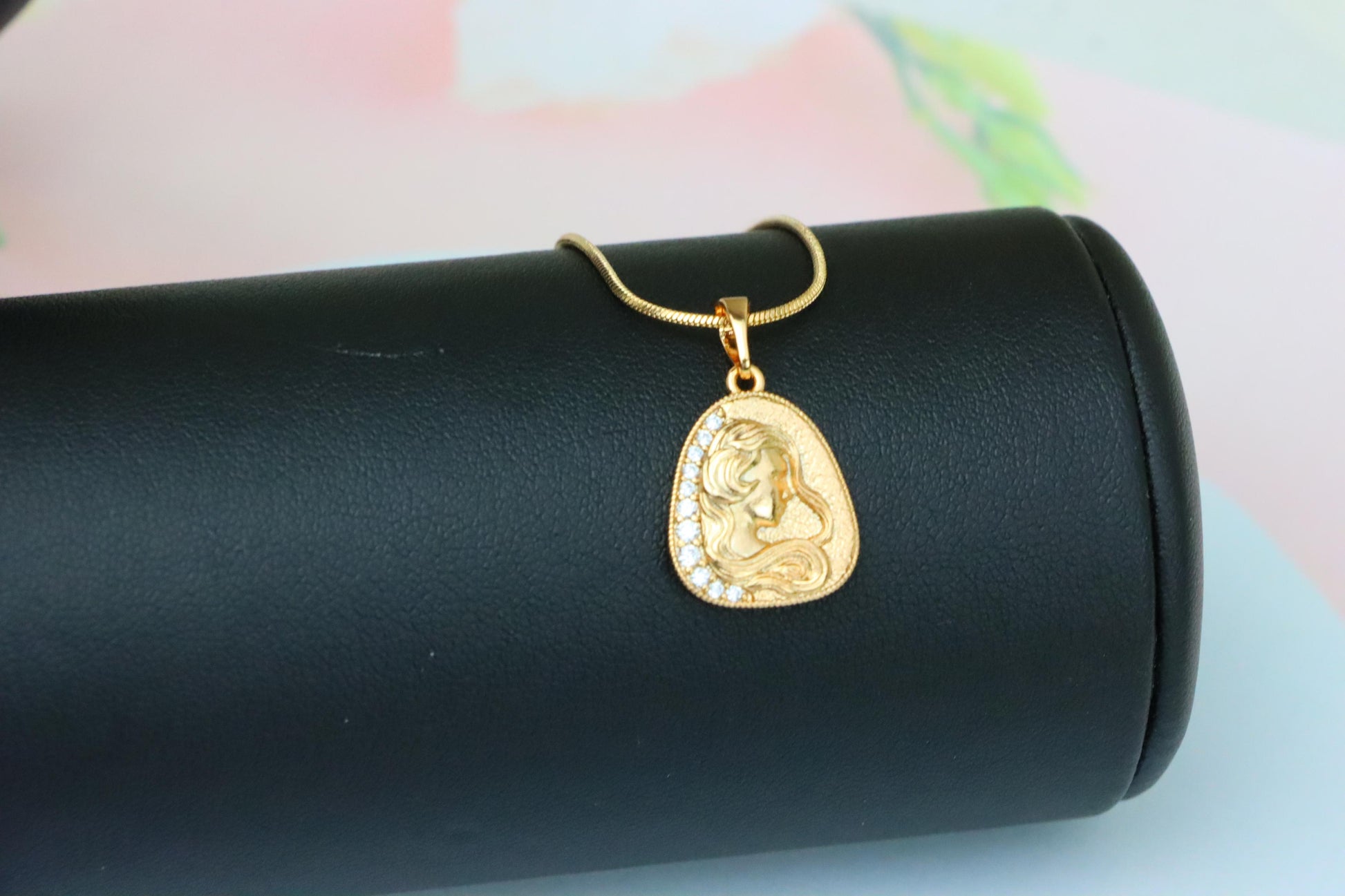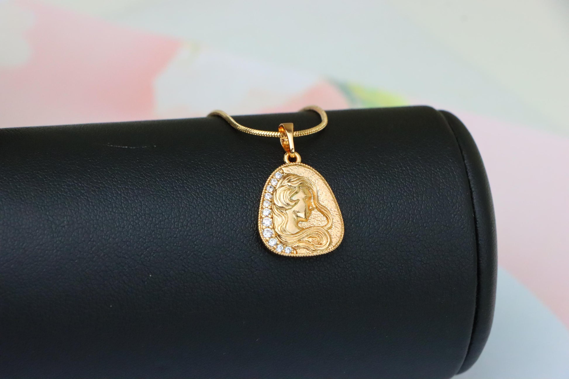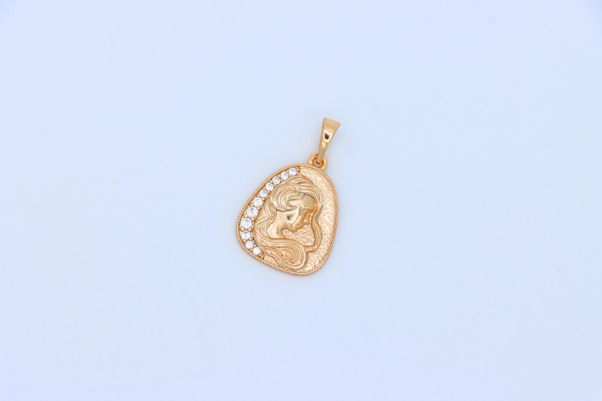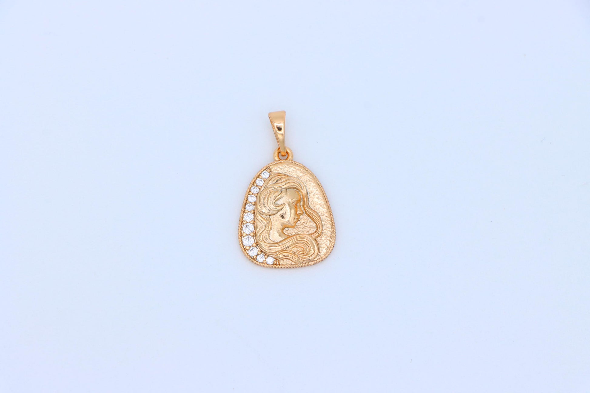 This elegant pendant features a beautifully engraved woman’s profile with flowing hair, accented by a line of shimmering crystals along the edge.