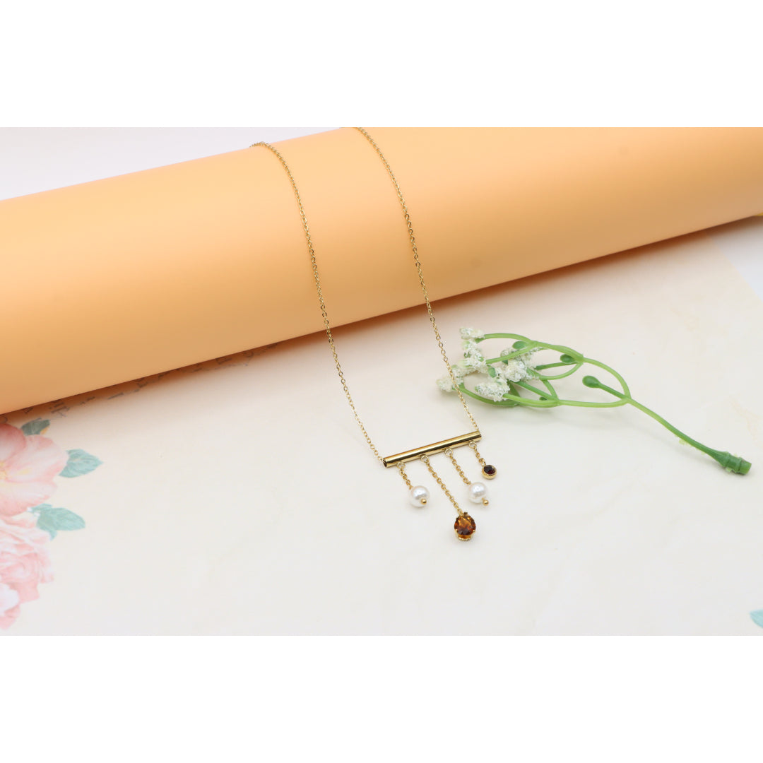 Description: Elegant yellow necklace featuring a delicate horizontal bar with cascading pearl and crystal charm drops, perfect for both casual and special occasions.